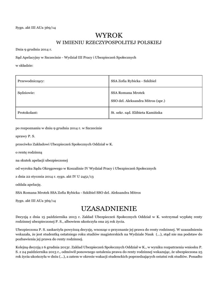 Sygn. akt III AUa 369/14 WYROK W IMIENIU RZECZYPOSPOLITEJ POLSKIEJ Dnia 9 grudnia 2014 r. Sąd Apelacyjny w Szczecinie - Wydział III Pracy i Ubezpieczeń Społecznych w składzie: Przewodniczący: SSA Zofia Rybicka - Szkibiel Sędziowie: SSA Romana Mrotek SSO del. Aleksandra Mitros (spr.) Protokolant: St. sekr. sąd. Elżbieta Kamińska po rozpoznaniu w dniu 9 grudnia 2014 r. w Szczecinie sprawy P. S. przeciwko Zakładowi Ubezpieczeń Społecznych Oddział w K. o rentę rodzinną na skutek apelacji ubezpieczonej od wyroku Sądu Okręgowego w Koszalinie IV Wydział Pracy i Ubezpieczeń Społecznych z dnia 22 stycznia 2014 r. sygn. akt IV U 2451/13 oddala apelację. SSA Romana Mrotek SSA Zofia Rybicka - Szkibiel SSO del. Aleksandra Mitros Sygn. akt III AUa 369/14 UZASADNIENIE Decyzją z dnia 15 października 2013 r. Zakład Ubezpieczeń Społecznych Oddział w K. wstrzymał wypłatę renty rodzinnej ubezpieczonej P. S., albowiem ukończyła ona 25 rok życia. Ubezpieczona P. S. zaskarżyła powyższą decyzję, wnosząc o przyznanie jej prawa do renty rodzinnej. W uzasadnieniu wskazała, że jest studentką ostatniego roku studiów magisterskich na Wydziale Nauk (...), stąd nie ma podstaw do pozbawienia jej prawa do renty rodzinnej. Kolejną decyzją z 6 grudnia 2013r. Zakład Ubezpieczeń Społecznych Oddział w K., w wyniku rozpatrzenia wniosku P. S. z 24 października 2013 r., odmówił ponownego ustalenia prawa do renty rodzinnej wskazując, że ubezpieczona 25 rok życia ukończyła w dniu (...), a zatem w okresie wakacji studenckich poprzedzających ostatni rok studiów. Ponadto z zaświadczenia wystawionego przez Politechnikę (...) z 15 listopada 2013 r. wynika, że ubezpieczona P. S. miała sesję poprawkową, a z przeprowadzonego przez organ rentowy postępowania wyjaśniającego wynika, że w okresie od 2 września 2013 r. do 15 września 2013 r. miała sesję poprawkową i brak potwierdzenia, że na dzień ukończenia 25 roku życia zdała wszystkie egzaminy przewidziane w ramach przedostatniego roku studiów i uzyskała wpis na ostatni rok studiów. Ubezpieczona P. S. zaskarżyła również decyzję z 6 grudnia 2013r. wnosząc o jej zmianę poprzez przyznanie ubezpieczonej praw do renty rodzinnej. Na rozprawie w dniu 13 stycznia 2014 r. Sąd Okręgowy połączył sprawę z odwołania ubezpieczonej od decyzji z 6 grudnia 2013 r., prowadzona pod sygnaturą akt IV U 23/14, ze sprawą prowadzoną pod sygnaturą akt IV U 2451/13 celem łącznego rozpoznania i rozstrzygnięcia. Wyrokiem z dnia 22 stycznia 2014 r. Sąd Okręgowy w Koszalinie IV Wydział Pracy i Ubezpieczeń Społecznych, wydanym w sprawie IV U 2451/13, oddalił oba odwołania ubezpieczonej. Swoje rozstrzygnięcie Sąd oparł na następujących ustaleniach faktycznych i rozważaniach prawnych: Ubezpieczona, urodzona w dniu (...), była uprawniona do renty rodzinnej po zmarłym ojcu B. S. od 14 listopada 1989 r. P. S. od 1 października 2012 r. studiuje na Wydziale Nauk (...) kierunek ekonomia na Politechnice (...). Studia drugiego stopnia, trwające cztery semestry, odbywa w trybie stacjonarnym. Planowany termin ukończenia studiów to 15 września 2013 r. Ubezpieczona 25 lat ukończyła w dniu (...), tj. w okresie wakacji studenckich poprzedzających ostatni rok studiów. Na dzień (...) P. S. miała zaliczony semestr pierwszy, a z semestru drugiego, kończącego przedostatni rok studiów, nie uzyskała jeszcze wszystkich zaliczeń. Sesja egzaminacyjna trwała do 15 września 2013 r. Również do tej daty ubezpieczona nie zaliczyła wszystkich obowiązujących w drugim semestrze zaliczeń. W dniu 16 września 2013 r. ubezpieczona zwróciła się do Prodziekana ds. Studenckich o udzielenie wpisu warunkowego na semestr trzeci roku akademickiego 2013/2014 wskazując, że nie uzyskała zaliczenia z dwóch przedmiotów. Decyzją Prodziekana z 22 października 2013 r. - o warunkowym zezwoleniu na podjęcie studiów w semestrze następnym - ubezpieczona uzyskała prawo warunkowego podjęcia studiów stacjonarnych na następnym semestrze z wyznaczonym obowiązkiem uzyskania w terminie do 14 września 2014 r. zaliczenia dwóch przedmiotów z poprzedniego semestru. W ocenie Sądu Okręgowego odwołanie nie zasługiwało na uwzględnienie. Sąd oparł swoje rozstrzygnięcie na treści art. 68 ust. 1 ustawy z 17 grudnia 1998r. o emeryturach i rentach z Funduszu Ubezpieczeń Społecznych (tj. Dz. U. z 2013 r. poz. 1440, z późn zm., dalej jako ustawa emerytalna), zgodnie z którym dzieci własne, dzieci drugiego małżonka i dzieci przysposobione mają prawo do renty rodzinnej: 1) do ukończenia 16 lat życia, 2) do ukończenia nauki w szkole, jeżeli przekroczyły 16 lat życia, nie dłużej jednak niż do osiągnięcia 25 lat życia, albo 3) bez względu na wiek, jeżeli stały się całkowicie niezdolne do pracy oraz do samodzielnej egzystencji lub całkowicie niezdolne do pracy w okresie, o którym mowa w pkt 1 lub 2. Jeżeli dziecko osiągnęło 25 lat życia, będąc na ostatnim roku studiów w szkole wyższej, prawo do renty rodzinnej przedłuża się do zakończenia tego roku studiów (art.68 ust. 2 ustawy emerytalnej). Sąd Okręgowy wskazał, że w ust. 2 cytowanego art. 68 rozszerzona została w sposób pośredni granica wieku na dzieci wskazane w art. 68 ust. 1 pkt 2, poprzez przyznanie prawa do renty dziecku, które ukończyło 25 lat życia na ostatnim roku studiów w szkole wyższej, przez okres do zakończenia tego ostatniego roku studiów. Dla przyznania ubezpieczonej prawa do renty rodzinnej, w ocenie Sądu Okręgowego, istotnym było ustalenie, czy ubezpieczona osiągnęła 25 lat życia będąc na ostatnim roku studiów w szkole wyższej, przy uwzględnieniu faktu, że zarówno art. 68 cyt. ustawy, jak i inne przepisy emerytalno-rentowe, nie zawierają wykładni pojęcia ostatniego roku studiów. Nie wyjaśniają tego pojęcia również inne przepisy, w tym ustawa z 27 lipca 2005 r. o szkolnictwie wyższym 