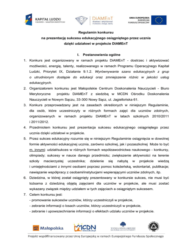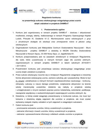 Regulamin konkursu na prezentację sukcesu edukacyjnego osiągniętego przez ucznia dzięki udziałowi w projekcie DIAMEnT I. Postanowienia ogólne 1. Konkurs jest organizowany w ramach projektu DiAMEnT - dostrzec i aktywizować możliwości, energię, talenty, realizowanego w ramach Programu Operacyjnego Kapitał Ludzki, Priorytet IX, Działanie 9.1.2. Wyrównywanie szans edukacyjnych z grup o utrudnionym dostępie do edukacji oraz zmniejszenie różnic w jakości usług edukacyjnych. 2. Organizatorem konkursu jest Małopolskie Centrum Doskonalenia Nauczycieli - Biuro Merytoryczne projektu DiAMEnT z siedzibą w MCDN Ośrodku Doskonalenia Nauczycieli w Nowym Sączu, 33-300 Nowy Sącz, ul. Jagiellońska 61. 3. Konkurs przeprowadzany jest na zasadach określonych w niniejszym Regulaminie, dla osób, które uczestniczyły w różnych formach zajęć dla uczniów zdolnych, organizowanych w ramach projektu DiAMEnT w latach szkolnych 2010/2011 i 2011/2012. 4. Przedmiotem konkursu jest prezentacja sukcesu edukacyjnego osiągniętego przez ucznia dzięki udziałowi w projekcie. 5. Przez sukces edukacyjny rozumie się w niniejszym Regulaminie osiągnięcia w dowolnej formie aktywności edukacyjnej ucznia, zarówno szkolnej, jak i pozaszkolnej Może to być m. innymi: udział/sukces w różnych formach współzawodnictwa naukowego - konkursy, olimpiady; sukcesy w nauce danego przedmiotu; zwiększenie aktywności na terenie szkoły macierzystej uczestnika; dzielenie się nabytą w projekcie wiedzą i umiejętnościami z innymi osobami poprzez pomoc koleżeńską, wolontariat, publikacje; nawiązanie współpracy z osobami/instytucjami wspierającymi uczniów zdolnych, itp. 6. Dziedzina, w której został osiągnięty prezentowany w konkursie sukces, nie musi być tożsama z dziedziną objętą zajęciami dla uczniów w projekcie, ale musi zostać wykazany związek między udziałem w tych zajęciach a osiągniętym sukcesem. 7. Celem konkursu jest: - promowanie sukcesów uczniów, którzy uczestniczyli w projekcie, - zebranie informacji o losach uczniów, którzy uczestniczyli w projekcie, - zebranie i upowszechnianie informacji o efektach udziału uczniów w projekcie. II. Założenia organizacyjne 1. Konkurs jest organizowany dla uczniów, którzy uczestniczyli w dowolnej formie wsparcia, organizowanej w projekcie DiAMEnT w latach szkolnych 2010/2011 i 2011/2012, to jest: zajęciach w Powiatowych Ośrodkach Wspierania Uczniów Zdolnych, e-learningowych kołach naukowych, warsztatach letnich, Letniej Szkole Młodych Talentów, Forum Młodych Talentów. 2. Konkurs zostanie przeprowadzony w okresie od dnia publikacji Regulaminu do 16.06.2014 r. 3. Zgłoszenia do konkursu dokonuje uczeń, a w przypadku ucznia niepełnoletniego – uczeń wraz z prawnym opiekunem, przesyłając pracę konkursową, zgodnie z zapisami cz. III niniejszego Regulaminu. 4. Jeden uczeń może zgłosić kilka prac konkursowych, jednak nie więcej niż 3. 5. Konkurs przeprowadza Komisja Konkursowa w składzie określonym przez organizatora. III. Wymogi dotyczące pracy konkursowej 1. Na konkurs należy przygotować pisemną pracę, w której zostanie zaprezentowany uzyskany sukces edukacyjny oraz wykazany jednoznacznie wpływ udziału w projekcie na osiągnięcie tego sukcesu. 2. Praca konkursowa powinna zostać przygotowana w jednej ze wskazanych form: opis, artykuł, reportaż, esej ,opowiadanie, rozprawka. 3. Praca konkursowa musi posiadać stronę tytułową, sporządzoną na wzorze zawartym w załączniku nr 1 do niniejszego Regulaminu. 4. Praca konkursowa nie może liczyć więcej niż 3 strony tekstu (nie licząc strony tytułowej), wyedytowanego zgodnie z następującymi wymogami: a. zredagowana w formacie .doc lub .docx; b. czcionka Arial, styl normalny, rozmiar 10; c. odstępy miedzy wierszami 1,5 wiersza; d. wszystkie marginesy 2,5 cm. 5. Pracę konkursową należy przygotować w wersji papierowej i na płycie CD w wersji elektronicznej w pliku w formacie .doc lub .docx. 6. Do pracy konkursowej należy dołączyć oświadczenie o podtrzymaniu zgody na przetwarzanie danych osobowych, którego wzór stanowi załącznik nr 2 do niniejszego Regulaminu. IV. 1. Warunki udziału Warunkiem udziału w konkursie jest dostarczenie pracy konkursowej opatrzonej stroną tytułową, zgodną z wzorem osobiście, przesyłką pocztową lub kurierską na adres: Biuro Merytoryczne projektu DiAMEnT 33-300 Nowy Sącz, ul. Jagiellońska 61 w nieprzekraczalnym terminie do 2.06.2014 r. do godz.15.00. W przypadku materiałów wysłanych pocztą lub za pośrednictwem kuriera decyduje data wpływu. Nadesłanie pracy konkursowej jest równoznaczne z pełną akceptacją regulaminu konkursu. 2. Ustalenie, czy praca konkursowa została złożona w określonym terminie, dokonywane będzie według daty i godziny wpływu do Organizatora. 3. Prace konkursowe dostarczone po 2.06. 2014 r. nie będą brały udziału w konkursie. 4. Wszelkie koszty przygotowania i przesłania prac konkursowych ponoszą uczestnicy konkursu, a materiały nadesłane na konkurs nie podlegają zwrotowi. 5. Uczestnicy konkursu zobowiązują się do niezgłaszania żadnych roszczeń względem organizatora z tytułu wykorzystania przez niego nadesłanej pracy konkursowej lub z tytułu jej niewykorzystania czy wykorzystania w ograniczonym zakresie. V. Komisja Konkursowa 1. Prace konkursowe będą oceniane przez Komisję Konkursową w składzie: - kierownik projektu; - kierownik ds. merytorycznych; - koordynatorzy ds. wspierania pracy z uczniem zdolnym. 2. Zadania Komisji Konkursowej: a. kwalifikacja zgłoszonych prac do konkursu; b. ocena zakwalifikowanych prac zgodnie z kryteriami zawartymi w załączniku nr 3 do niniejszego Regulaminu; c. przyznanie nagród. d. czuwanie nad prawidłowością przebiegu konkursu.. 3. Komisja Konkursowa dokona oceny prac konkursowych do 15 czerwca 2014r. 4. Decyzje Komisji zapadają większością głosów; w kwestiach nierozstrzygniętych decyduje