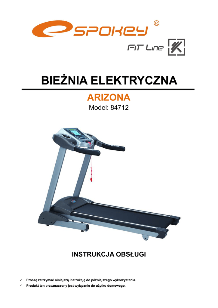 BIEŻNIA ELEKTRYCZNA ARIZONA Model: 84712 INSTRUKCJA OBSŁUGI Proszę zatrzymać niniejszą instrukcję do późniejszego wykorzystania. Produkt ten przeznaczony jest wyłącznie do użytku domowego. ARIZONA – INSTRUKCJA OBSŁUGI UWAGI DOTYCZĄCE BEZPIECZEŃSTWA 1. Przed przystąpieniem do składania urządzenia i przed rozpoczęciem treningu należy dokładnie zapoznać się z poniższą instrukcją. Bezpieczne i efektywne użytkowanie urządzenia może być zapewnione jedynie wtedy, gdy zostanie ono poskładane, konserwowane i używane we właściwy, opisany w instrukcji sposób. Jeżeli sam nie jesteś użytkownikiem, proszę przekaż wszystkim użytkownikom niniejszą instrukcję i poinformuj o wszystkich zagrożeniach i środkach ostrożności. 2. Przed przystąpieniem do ćwiczeń należy skonsultować się z lekarzem w celu ustalenia, czy nie ma żadnych uwarunkowań psychicznych lub fizycznych, które mogłyby stanowić zagrożenie dla Twojego zdrowia i bezpieczeństwa. Rozmowa z lekarzem może również uchronić przed niewłaściwym użyciem urządzenia. Lekarz określi, czy zasadne jest stosowanie leków, które wpływałyby na puls, ciśnienie lub poziom cholesterolu. 3. Zwracaj uwagę na sygnały Twojego ciała. Niewłaściwe lub nadmierne ćwiczenie może w negatywny sposób wpłynąć na Twoje zdrowie. Należy natychmiast zaprzestać ćwiczenia jeżeli wystąpi którykolwiek z następujących objawów: ból, ucisk w klatce piersiowej, nieregularny puls, wyjątkowo skrócony oddech, omdlenia, zawroty głowy, mdłości itp. Jeżeli wystąpi którykolwiek z powyższych objawów powinieneś natychmiast skontaktować się ze swoim lekarzem i do tego czasu zaprzestać treningów. 4. Dzieci, nie będące pod nadzorem, należy utrzymać z dala od urządzenia. Urządzenie jest przeznaczone tylko i wyłącznie dla osób dorosłych. 5. Urządzenie należy ustawić na prostej, stabilnej i twardej powierzchni. Dla bezpieczeństwa, na około urządzenia należy zostawić po 2 m wolnej przestrzeni z każdej strony potrzebnej do bezpiecznego użytkowania. 6. Przed przystąpieniem do ćwiczenia należy upewnić się, że wszystkie śruby i zakrętki są dokładnie dokręcone. Proszę zwracać szczególną uwagę na części najbardziej narażone na zużycie. 7. Bezpieczeństwo sprzętu może być zagwarantowane tylko wtedy, jeżeli będzie on poddawany regularnym przeglądom i kontrolom. 8. Należy zawsze używać sprzętu zgodnie z jego przeznaczeniem. Jeżeli podczas montażu lub użytkowania któraś część okaże się wadliwa, lub wydaje niepokojące dźwięki, należy zaprzestać używania i oddać urządzenie do serwisu. Nie wolno używać uszkodzonego urządzenia. 9. Podczas treningu należy zakładać odpowiedni strój. Należy unikać luźnych strojów, które mogłyby zaczepiać się o urządzenie lub takich które mogłyby ograniczać lub uniemożliwiać ruchy. Zaleca się również ćwiczyć w odpowiednim obuwiu sportowym. Podczas ćwiczenia należy mieć przypięty do ubrania klucz bezpieczeństwa i trzymać się uchwytów. Podczas działania bieżni proszę nie dotykać elementów ruchomych bieżni. 10. Sprzęt zaliczony został do klasy H i C według normy EN 957 i jest przeznaczony wyłącznie do użytku domowego. Nie może być używany jako sprzęt terapeutyczny lub rehabilitacyjny. 11. Maksymalna dopuszczalna waga użytkownika wynosi 150 kg. 12. Należy zachować szczególną ostrożność podczas podnoszenia i przenoszenia urządzenia. Przenosić urządzenie powinny zawsze dwie osoby. Podczas podnoszenia lub przenoszenia sprzętu należy zachować właściwą postawę, aby nie uszkodzić kręgosłupa. 13. Montując urządzenie należy ściśle stosować się do załączonej instrukcji i używać tylko części dołączonych do zestawu. Przed rozpoczęciem montażu, należy sprawdzić czy wszystkie części, które zawiera dołączona lista, znajdują się w zestawie. 14. Nie zaleca się pozostawienia urządzeń regulacyjnych, które mogłyby przeszkadzać w ruchu użytkownika, w takim położeniu, aby wystawał jakikolwiek ich element. OSTRZEŻENIE: PRZED ROZPOCZĘCIEM TRENINGU NA URZĄDZENIU NALEŻY PRZECZYTAĆ INSTRUKCJĘ. ZA EWENTUALNE KONTUZJE LUB USZKODZENIA PRZEDMIOTÓW, KTÓRE ZOSTAŁY SPOWODOWANE NIEWŁAŚCIWYM UŻYTKOWANIEM TEGO PRODUKTU NIE PONOSIMY ODPOWIEDZIALNOŚCI. Strona 2 URAZY DLA ZDROWIA MOGĄ WYNIKAĆ Z NIEPRAWIDŁOWEGO LUB ZBYT INTENSYWNEGO TRENINGU. ARIZONA – INSTRUKCJA OBSŁUGI DANE TECHNICZNE Rozmiar po rozłożeniu (dł. x szer. x wys.): 183 x 80 x 132 cm Pas bieżny – 45 x 282 cm Powierzchnia do biegania: 50 x 134 cm Maksymalna waga użytkownika - 150 kg Napięcie: ~ 220-240 V (50/60Hz) konsola ZESTAWIENIE CZĘŚCI - (x1) w całości złożona bieżnia czujnik pulsu - (x1) klucz bezpieczeństwa - (1x) klucz sześciokątny 6mm - (x1) buteleczka silikonu - (x1) instrukcja wyświetlacz panel bezpieczeństwa boczna osłona pas bieżny MONTAŻ BIEŻNI KROK 1 Wyjmij wszystkie części z kartonu. Następnie proszę postępować zgodnie z załączonymi rysunkami. KROK 2 Strona 3 Należy podnieść przedni pomost (z wyświetlaczem) do góry. ARIZONA – INSTRUKCJA OBSŁUGI KROK 3 Ostatnim krokiem jest przykręcenie bocznych osłon zgodnie z rysunkiem poniżej. Proszę to zrobić uważnie i dokładnie w celu zapewnienia odpowiedniego poziomu bezpieczeństwa. SKŁADANIE/ROZKŁADANIE BIEŻNI Nie próbuj ruszać bieżnią, jeśli nie jest w złożonej i zablokowanej pozycji. Upewnij się, że wtyczka jest odłączona od źródła zasilania. W celu złożenia bieżni należy podnieść obiema rękami powierzchnię do biegania aż do momentu usłyszenia delikatnego sygnału, który informuje o prawidłowym zablokowaniu bieżni w pozycji pionowej. Natomiast w celu rozłożenia bieżni należy nacisnąć stopień w celu zwolnienia blokady. Następnie proszę stanąć w odległości 2 metrów od bieżni gdyż urządzenie rozłoży się automatycznie. stop