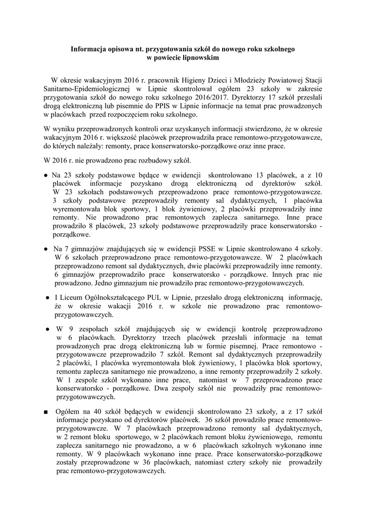 Informacja opisowa nt. przygotowania szkół do nowego roku szkolnego w powiecie lipnowskim W okresie wakacyjnym 2016 r. pracownik Higieny Dzieci i Młodzieży Powiatowej Stacji Sanitarno-Epidemiologicznej w Lipnie skontrolował ogółem 23 szkoły w zakresie przygotowania szkół do nowego roku szkolnego 2016/2017. Dyrektorzy 17 szkół przesłali drogą elektroniczną lub pisemnie do PPIS w Lipnie informacje na temat prac prowadzonych w placówkach przed rozpoczęciem roku szkolnego. W wyniku przeprowadzonych kontroli oraz uzyskanych informacji stwierdzono, że w okresie wakacyjnym 2016 r. większość placówek przeprowadziła prace remontowo-przygotowawcze, do których należały: remonty, prace konserwatorsko-porządkowe oraz inne prace. W 2016 r. nie prowadzono prac rozbudowy szkół. ● Na 23 szkoły podstawowe będące w ewidencji skontrolowano 13 placówek, a z 10 placówek informacje pozyskano drogą elektroniczną od dyrektorów szkół. W 23 szkołach podstawowych przeprowadzono prace remontowo-przygotowawcze. 3 szkoły podstawowe przeprowadziły remonty sal dydaktycznych, 1 placówka wyremontowała blok sportowy, 1 blok żywieniowy, 2 placówki przeprowadziły inne remonty. Nie prowadzono prac remontowych zaplecza sanitarnego. Inne prace prowadziło 8 placówek, 23 szkoły podstawowe przeprowadziły prace konserwatorsko porządkowe. ● Na 7 gimnazjów znajdujących się w ewidencji PSSE w Lipnie skontrolowano 4 szkoły. W 6 szkołach przeprowadzono prace remontowo-przygotowawcze. W 2 placówkach przeprowadzono remont sal dydaktycznych, dwie placówki przeprowadziły inne remonty. 6 gimnazjów przeprowadziło prace konserwatorsko - porządkowe. Innych prac nie prowadzono. Jedno gimnazjum nie prowadziło prac remontowo-przygotowawczych. ● I Liceum Ogólnokształcącego PUL w Lipnie, przesłało drogą elektroniczną informację, że w okresie wakacji 2016 r. w szkole nie prowadzono prac remontowoprzygotowawczych. ● W 9 zespołach szkół znajdujących się w ewidencji kontrolę przeprowadzono w 6 placówkach. Dyrektorzy trzech placówek przesłali informacje na temat prowadzonych prac drogą elektroniczną lub w formie pisemnej. Prace remontowo przygotowawcze przeprowadziło 7 szkół. Remont sal dydaktycznych przeprowadziły 2 placówki, 1 placówka wyremontowała blok żywieniowy, 1 placówka blok sportowy, remontu zaplecza sanitarnego nie prowadzono, a inne remonty przeprowadziły 2 szkoły. W 1 zespole szkół wykonano inne prace, natomiast w 7 przeprowadzono prace konserwatorsko - porządkowe. Dwa zespoły szkół nie prowadziły prac remontowoprzygotowawczych. ■ Ogółem na 40 szkół będących w ewidencji skontrolowano 23 szkoły, a z 17 szkół informacje pozyskano od dyrektorów placówek. 36 szkół prowadziło prace remontowoprzygotowawcze. W 7 placówkach przeprowadzono remonty sal dydaktycznych, w 2 remont bloku sportowego, w 2 placówkach remont bloku żywieniowego, remontu zaplecza sanitarnego nie prowadzono, a w 6 placówkach szkolnych wykonano inne remonty. W 9 placówkach wykonano inne prace. Prace konserwatorsko-porządkowe zostały przeprowadzone w 36 placówkach, natomiast cztery szkoły nie prowadziły prac remontowo-przygotowawczych. Podobnie jak w latach ubiegłych zakres prowadzonych prac był bardzo szeroki. Przeprowadzone remonty sal dydaktycznych dotyczyły m. in. remontów podłóg w salach dydaktycznych, wymiany na nową stolarki drzwiowej, wymiany oświetlenia i zwiększenia ilości punktów świetlnych, wymiany umywalek na nowe w salach dydaktycznych, malowania sal lekcyjnych. Remont bloku sportowego polegał na: remoncie podłogi w sali gimnastycznej (tj. cyklinowanie, lakierowanie, malowanie linii), remoncie pokoju dla nauczycieli wychowania fizycznego (położenie nowej podłogi, malowanie pomieszczenia, montaż nowych mebli), w łazienkach przy sali gimnastycznej wymiana sedesów na nowe, malowanie pomieszczeń bloku sportowego (tj. sanitariatów , przebieralni dla uczniów, korytarza przy sali gimnastycznej). Remont bloku żywieniowego dotyczył remontu stołówek szkolnych i kuchni tj. wymiany podłogi na nową w stołówce szkolnej, wymiany kratek ściekowych w kuchni, pracach tynkarsko-malarskich pomieszczeń i położeniu nowej gładzi na ścianach, wymiany lamp oświetleniowych , malowaniu pomieszczeń kuchennych. Wiele szkół przeprowadziło również inne remonty polegające m. in. na: wymianie na nową instalacji elektrycznej (tj. wyprowadzenie nowego pionu, wymiana przewodów elektrycznych, włączników, lamp oświetleniowych, rozprowadzenie internetu w salach dydaktycznych), wymianie podłóg w pokoju nauczycielskim, sekretariatach szkół, gabinetach dyrektorów, remoncie klatki schodowej ( tj. wykonano prace tynkarsko – malarskie i położono ozdobny tynk na ścianach), remoncie dachu nad wejściem do hali sportowej, remoncie pomieszczenia dla księgowej, pomieszczenia do rewalidacji (tj. wymiana podłóg, malowanie pomieszczeń, montaż nowych mebli). Wykonywano również inne prace, do których należały np. prace związane z naprawą ogrodzenia terenu szkoły, częściowej wymiany na nowe ogrodzenia terenu szkoły, czyszczenia rynien, czyszczenia i malowania balustrad tarasowych, wymiany na nową zabudowy klatki schodowej, położenia płytek ściennych przy drzwiach wejściowych do szkoły, wymiany lamp oświetleniowych w korytarzu szkolnym, wymiany stolarki okiennej i parapetów zewnętrznych (łącznie 6 sztuk), położenia wykładziny typu Gamrat w pomieszczeniach świetlicy i biblioteki szkolnej, budowy parkingu przy szkole polegającej na wymianie starych krawężników i płytek na kostkę brukową, utwardzenia części terenu szkoły poprzez położenie kostki brukowej (dotyczy 2 placówek)), ocieplenia ściany frontowej budynku sali gimnastycznej (dotyczy 1 placówki). Przeprowadzone prace konserwatorsko-porządkowe w szkołach polegały na drobnych naprawach, malowaniu pomieszczeń, pracach porządkowy