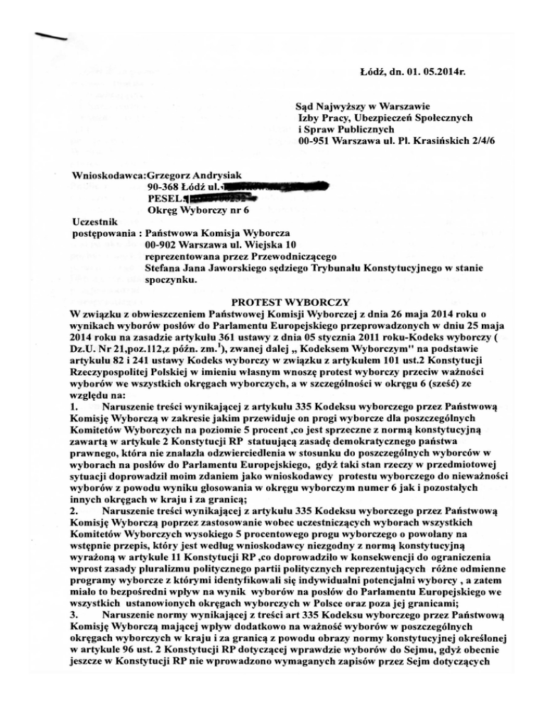 Łódź, dn. 01. 05.2014r. Sąd Najwyższy w Warszawie Izby Pracy, Ubezpieczeń Społecznych i Spraw Publicznych 00-951 Warszawa ul. PI. Krasińskich 2/4/6 Wnioskodawca ¡Grzegorz Andrysiak 90-368 Łódź ul.i PESEL* Okręg Wyborczy nr 6 Uczestnik postępowania : Państwowa Komisja Wyborcza 00-902 Warszawa ul. Wiejska 10 reprezentowana przez Przewodniczącego Stefana Jana Jaworskiego sędziego Trybunału Konstytucyjnego w stanie spoczynku. PROTEST WYBORCZY W związku z obwieszczeniem Państwowej Komisji Wyborczej z dnia 26 maja 2014 roku o wynikach wyborów posłów do Parlamentu Europejskiego przeprowadzonych w dniu 25 maja 2014 roku na zasadzie artykułu 361 ustawy z dnia 05 stycznia 2011 roku-Kodeks wyborczy ( Dz.U. Nr 21,poz.ll2,z późn. zm. 1 ), zwanej dalej „ Kodeksem Wyborczym" na podstawie artykułu 82 i 241 ustawy Kodeks wyborczy w związku z artykułem 101 ust.2 Konstytucji Rzeczypospolitej Polskiej w imieniu własnym wnoszę protest wyborczy przeciw ważności wyborów we wszystkich okręgach wyborczych, a w szczególności w okręgu 6 (sześć) ze względu na: 1. Naruszenie treści wynikającej z artykułu 335 Kodeksu wyborczego przez Państwową Komisję Wyborczą w zakresie jakim przewiduje on progi wyborcze dla poszczególnych Komitetów Wyborczych na poziomie 5 procent ,co jest sprzeczne z normą konstytucyjną zawartą w artykule 2 Konstytucji RP statuującą zasadę demokratycznego państwa prawnego, która nie znalazła odzwierciedlenia w stosunku do poszczególnych wyborców w wyborach na posłów do Parlamentu Europejskiego, gdyż taki stan rzeczy w przedmiotowej sytuacji doprowadził moim zdaniem jako wnioskodawcy protestu wyborczego do nieważności wyborów z powodu wyniku głosowania w okręgu wyborczym numer 6 jak i pozostałych innych okręgach w kraju i za granicą; 2. Naruszenie treści wynikającej z artykułu 335 Kodeksu wyborczego przez Państwową Komisję Wyborczą poprzez zastosowanie wobec uczestniczących wyborach wszystkich Komitetów Wyborczych wysokiego 5 procentowego progu wyborczego o powołany na wstępnie przepis, który jest według wnioskodawcy niezgodny z normą konstytucyjną wyrażoną w artykule 11 Konstytucji RP ,co doprowadziło w konsekwencji do ograniczenia wprost zasady pluralizmu politycznego partii politycznych reprezentujących różne odmienne programy wyborcze z którymi identyfikowali się indywidualni potencjalni wyborcy , a zatem miało to bezpośredni wpływ na wynik wyborów na posłów do Parlamentu Europejskiego we wszystkich ustanowionych okręgach wyborczych w Polsce oraz poza jej granicami; 3. Naruszenie normy wynikającej z treści art 335 Kodeksu wyborczego przez Państwową Komisję Wyborczą mającej wpływ dodatkowo na ważność wyborów w poszczególnych okręgach wyborczych w kraju i za granicą z powodu obrazy normy konstytucyjnej określonej w artykule 96 ust. 2 Konstytucji RP dotyczącej wprawdzie wyborów do Sejmu, gdyż obecnie jeszcze w Konstytucji RP nie wprowadzono wymaganych zapisów przez Sejm dotyczących wyborów na posłów do Parlamentu Europejskiego, a zatem na zasadzie analogi znajduje on zastosowanie na powyższą okoliczność w stosunku do poszczególnych Komitetów Wyborczych reprezentujących małe i średnie partie polityczne ,gdzie ich szanse na wprowadzenie posłów do Parlamentu Europejskiego zostały bezpodstawnie ograniczone poprzez 5 procentowy zaporowy próg wyborczy z uwagi na to, że oddane na nie głosy wyborców na kandydatów z list tych partii nie uczestniczyły w ich demokratycznym wyborze w wyłanianiu swoich przedstawicieli do władz Parlamentu Europejskiego. W związku z tak postawionym zarzutami merytoryczno- prawnymi, jako wnioskodawca protestu wyborczego wnoszę o skierowanie zapytania prawnego do Trybunału Konstytucyjnego przez Sąd Najwyższy Izby Pracy, Ubezpieczeń Społecznych i Spraw Publicznych na podstawie artykułu 193 Konstytucji R P o to: Czy artykuł 335 Kodeksu wyborczego w zakresie jakim przewiduje zaporowy próg wyborczy na poziomie 5 procent dla poszczególnych Komitetów Wyborczych partii politycznych w wyborach europejskich na posłów do Parlamentu Europejskiego nie narusza norm konstytucyjnych wynikających z artykułów odpowiednio: 2 i 11 oraz 96 ust.2 Konstytucji RP w stosunku do wnioskodawcy i pozostałych wyborców uczestniczących w wyborach poprzez pozbawienie ich głosu na wynik wyborów w sytuacji nie przekroczenia zakreślonego limitu procentowego wymaganego tym przepisem? Dlatego też, niniejszym protestem wyborczym w imieniu własnym wnoszę o unieważnienie przeprowadzonych wyborów w dniu 25 maja 2014 roku na posłów do Parlamentu Europejskiego w okręgu wyborczym numer 6 oraz rozważenie przez Sąd Najwyższy Izby Pracy, Ubezpieczeń Społecznych i Spraw Publicznych - czy są one także ważne w pozostałych okręgach wyborczych, a jeżeli nie to ich powtórzenie przez Państwową Komisję Wyborczą na obszarze całego kraju oraz za granicą w celu przestrzegania zasad demokratycznego państwa prawa zgodnie o powołane w pentium zarzutów obowiązujące normy konstytucyjne wynikające z Konstytucji Rzeczypospolitej Polskiej UZASADNIENIE Wnioskodawca podnosi niniejszym protestem wyborczym, że przeprowadzone wybory parlamentarne w dniu 25 maja 2014 roku na posłów do Parlamentu Europejskiego przez Państwową Komisję Wyborczą z powodu naruszenia artykułu 335 Kodeksu wyborczego są nieważne, szczególnie w okręgu wyborczym numer 6 oraz pozostałych okręgach wyborczych na obszarze kraju i za granicą. Wynika to z faktu, że polski kodeks wyborczy w powołanym na wstępie przepisie nieodpowiedzialnie przewiduje dla wyborców w Polsce próg wyborczy na poziomie 5 procent .Skoro tak, to oznacza to, że dla większości partii politycznych jakakolwiek szansa uzyskania euromandatów przez kandydatów komitetów wyborczych jest w praktyce iluzoryczna. Wyborcy którzy się utożsamiają z tymi partiami z powodu programów wyborczych 