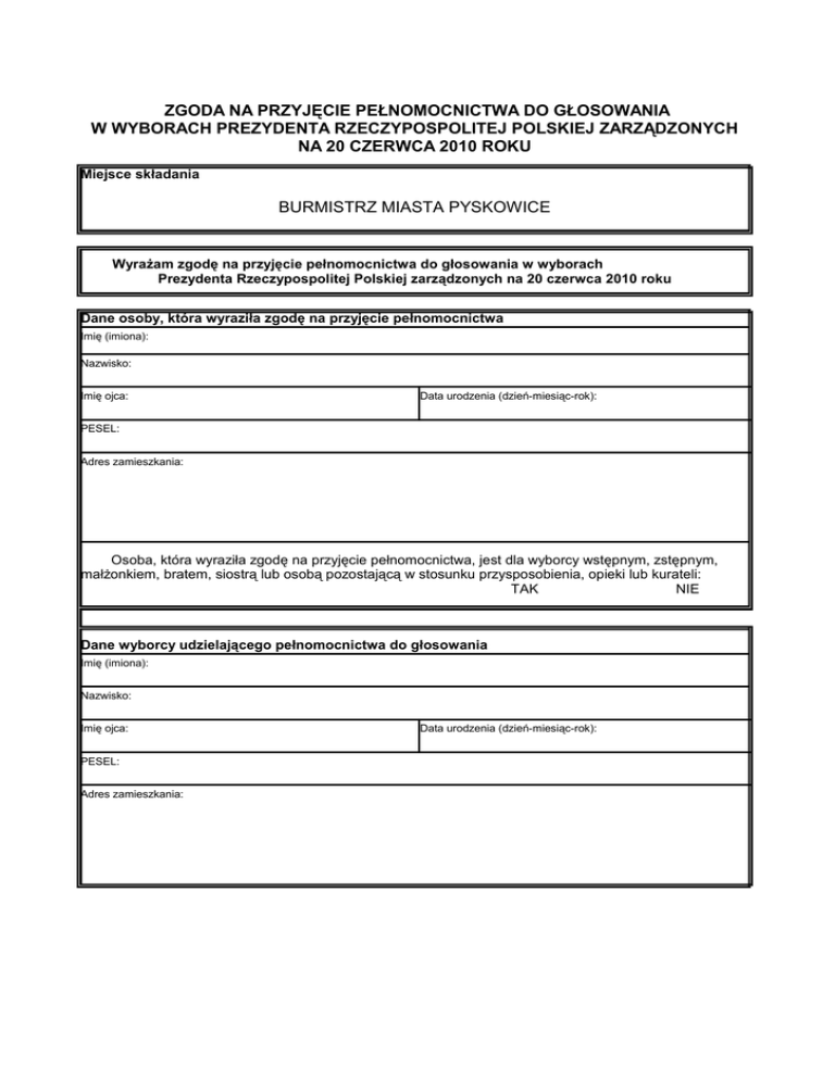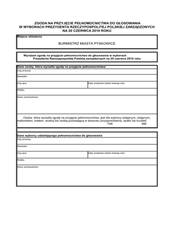 ZGODA NA PRZYJĘCIE PEŁNOMOCNICTWA DO GŁOSOWANIA W WYBORACH PREZYDENTA RZECZYPOSPOLITEJ POLSKIEJ ZARZĄDZONYCH NA 20 CZERWCA 2010 ROKU Miejsce składania BURMISTRZ MIASTA PYSKOWICE Wyrażam zgodę na przyjęcie pełnomocnictwa do głosowania w wyborach Prezydenta Rzeczypospolitej Polskiej zarządzonych na 20 czerwca 2010 roku Dane osoby, która wyraziła zgodę na przyjęcie pełnomocnictwa Imię (imiona): Nazwisko: Imię ojca: Data urodzenia (dzień-miesiąc-rok): PESEL: Adres zamieszkania: Osoba, która wyraziła zgodę na przyjęcie pełnomocnictwa, jest dla wyborcy wstępnym, zstępnym, małżonkiem, bratem, siostrą lub osobą pozostającą w stosunku przysposobienia, opieki lub kurateli: TAK NIE Dane wyborcy udzielającego pełnomocnictwa do głosowania Imię (imiona): Nazwisko: Imię ojca: PESEL: Adres zamieszkania: Data urodzenia (dzień-miesiąc-rok): Oświadczenia i wnioski Proszę o pozostawienie aktu pełnomocnictwa do głosowania do odbioru w Urzędzie Miasta/doręczenie na wskazany poniżej adres*: ………………………………………………………………………….. ………………………………………………………………………….. Informuję, że wyraziłam/wyraziłem* już zgodę na przyjęcie pełnomocnictwa do głosowania od (należy podać imię i nazwisko, PESEL oraz adres zamieszkania wyborcy); ………………………………………………………………………… …………………………………………………………………………. Oświadczam, że wszystkie powyższe dane są zgodne z prawdą. Data wypełnienia (dzień-miesiąc-rok) _______________ Podpis osoby, która wyraziła zgodę na przyjęcie pełnomocnictwa Pouczenie Akt pełnomocnictwa do głosowania sporządzony: -przed dniem pierwszego głosowania (tzw. I tura) uprawnia również do oddania głosu w głosowaniu ponownym (tzw. II tura), jeżeli zostanie ono przeprowadzone; -po dniu pierwszego głosowania uprawnia wyłącznie do oddania głosu w głosowaniu ponownym (tzw.II tura), jeżeli zostanie ono przeprowadzone. Adnotacje urzędowe Uwagi: Podpis przyjmującego: …………………………………………………………… * Niepotrzebne skreślić ** Wstępnym jest ojciec, matka, dziadek, babka, itd. *** Zstępnym jest syn, córka, wnuk, wnuczka, itd.