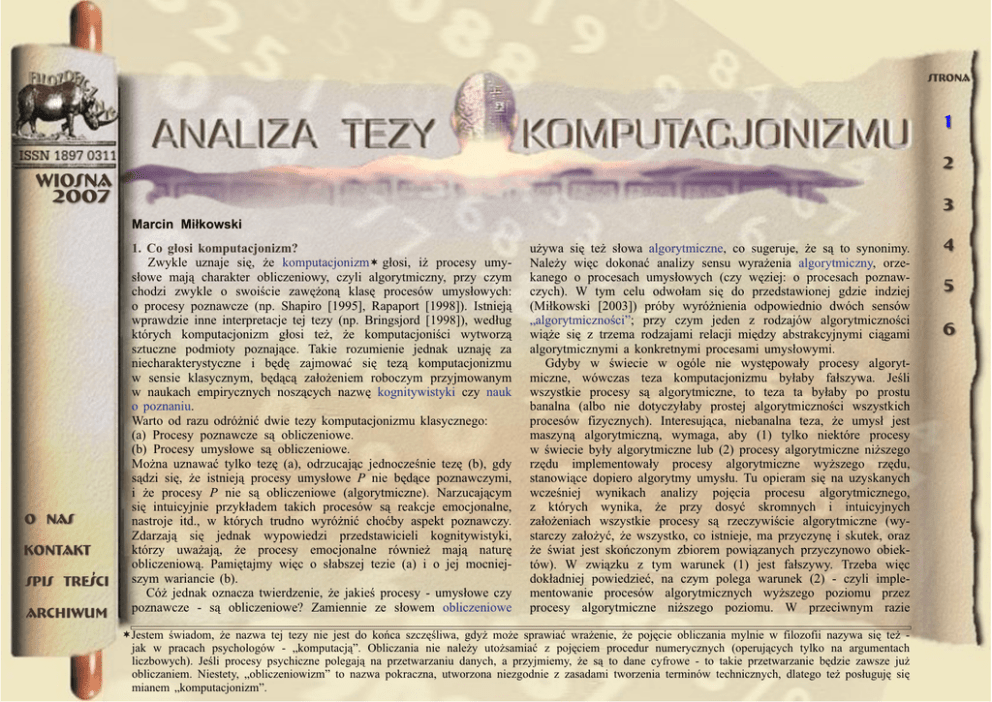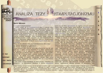 strona 1 2 wiosna 2007 3 Marcin Miłkowski o nas kontakt , spis tresci archiwum 1. Co głosi komputacjonizm? Zwykle uznaje się, że komputacjonizm¬ głosi, iż procesy umysłowe mają charakter obliczeniowy, czyli algorytmiczny, przy czym chodzi zwykle o swoiście zawężoną klasę procesów umysłowych: o procesy poznawcze (np. Shapiro [1995], Rapaport [1998]). Istnieją wprawdzie inne interpretacje tej tezy (np. Bringsjord [1998]), według których komputacjonizm głosi też, że komputacjoniści wytworzą sztuczne podmioty poznające. Takie rozumienie jednak uznaję za niecharakterystyczne i będę zajmować się tezą komputacjonizmu w sensie klasycznym, będącą założeniem roboczym przyjmowanym w naukach empirycznych noszących nazwę kognitywistyki czy nauk o poznaniu. Warto od razu odróżnić dwie tezy komputacjonizmu klasycznego: (a) Procesy poznawcze są obliczeniowe. (b) Procesy umysłowe są obliczeniowe. Można uznawać tylko tezę (a), odrzucając jednocześnie tezę (b), gdy sądzi się, że istnieją procesy umysłowe P nie będące poznawczymi, i że procesy P nie są obliczeniowe (algorytmiczne). Narzucającym się intuicyjnie przykładem takich procesów są reakcje emocjonalne, nastroje itd., w których trudno wyróżnić choćby aspekt poznawczy. Zdarzają się jednak wypowiedzi przedstawicieli kognitywistyki, którzy uważają, że procesy emocjonalne również mają naturę obliczeniową. Pamiętajmy więc o słabszej tezie (a) i o jej mocniejszym wariancie (b). Cóż jednak oznacza twierdzenie, że jakieś procesy - umysłowe czy poznawcze - są obliczeniowe? Zamiennie ze słowem obliczeniowe używa się też słowa algorytmiczne, co sugeruje, że są to synonimy. Należy więc dokonać analizy sensu wyrażenia algorytmiczny, orzekanego o procesach umysłowych (czy węziej: o procesach poznawczych). W tym celu odwołam się do przedstawionej gdzie indziej (Miłkowski [2003]) próby wyróżnienia odpowiednio dwóch sensów „algorytmiczności”; przy czym jeden z rodzajów algorytmiczności wiąże się z trzema rodzajami relacji między abstrakcyjnymi ciągami algorytmicznymi a konkretnymi procesami umysłowymi. Gdyby w świecie w ogóle nie występowały procesy algorytmiczne, wówczas teza komputacjonizmu byłaby fałszywa. Jeśli wszystkie procesy są algorytmiczne, to teza ta byłaby po prostu banalna (albo nie dotyczyłaby prostej algorytmiczności wszystkich procesów fizycznych). Interesująca, niebanalna teza, że umysł jest maszyną algorytmiczną, wymaga, aby (1) tylko niektóre procesy w świecie były algorytmiczne lub (2) procesy algorytmiczne niższego rzędu implementowały procesy algorytmiczne wyższego rzędu, stanowiące dopiero algorytmy umysłu. Tu opieram się na uzyskanych wcześniej wynikach analizy pojęcia procesu algorytmicznego, z których wynika, że przy dosyć skromnych i intuicyjnych założeniach wszystkie procesy są rzeczywiście algorytmiczne (wystarczy założyć, że wszystko, co istnieje, ma przyczynę i skutek, oraz że świat jest skończonym zbiorem powiązanych przyczynowo obiektów). W związku z tym warunek (1) jest fałszywy. Trzeba więc dokładniej powiedzieć, na czym polega warunek (2) - czyli implementowanie procesów algorytmicznych wyższego poziomu przez procesy algorytmiczne niższego poziomu. W przeciwnym razie ¬Jestem świadom, że nazwa tej tezy nie jest do końca szczęśliwa, gdyż może sprawiać wrażenie, że pojęcie obliczania mylnie w filozofii nazywa się też - jak w pracach psychologów - „komputacją”. Obliczania nie należy utożsamiać z pojęciem procedur numerycznych (operujących tylko na argumentach liczbowych). Jeśli procesy psychiczne polegają na przetwarzaniu danych, a przyjmiemy, że są to dane cyfrowe - to takie przetwarzanie będzie zawsze już obliczaniem. Niestety, „obliczeniowizm” to nazwa pokraczna, utworzona niezgodnie z zasadami tworzenia terminów technicznych, dlatego też posługuję się mianem „komputacjonizm”. 4 5 6 strona wszelkie odmiany komputacjonizmu okażą się nieinteresujące. wiosna 2007 o nas kontakt , spis tresci archiwum 2. Sensy „algorytmiczności” Przez pojęcie „algorytmiczność” można rozumieć cechę polegającą na: (a) Obliczeniowej naturze procesu, czyli jego rekurencyjności. (b) Kompresowalności informacji o procesie, czyli jego algorytmicznej upraszczalności. Pierwsze pojęcie algorytmiczności wiąże się z klasycznym pojęciem algorytmu jako funkcji przejścia maszyny Turinga o określonym alfabecie, mającej przynajmniej jeden argument wyjściowy i zero lub więcej argumentów wejściowych. Nie chodzi w tym wypadku o ewentualne algorytmy nierekurencyjne czy też algorytmy maszyn analogowych, lecz o najbardziej klasyczne funkcje rekurencyjne maszyn cyfrowych. Stan badań nad maszynami analogowymi nie pozwala, moim zdaniem, wnioskować, że miałyby one gruntownie większą moc obliczeniową od cyfrowych lub też w zasadniczo inny sposób byłyby algorytmiczne. Tezy, iż istnieją analogowe maszyny o większej mocy obliczeniowej od każdego możliwego komputera cyfrowego, wkładam między bajki. Podobnie traktuję tezy dotyczące komputerów kwantowych. Swoją drogą, komputacjonizm analogowy lub komputacjonizm kwantowy są możliwymi stanowiskami w filozofii umysłu. Tu jednak chodzi mi o trudniejszy - z powodu angażowania sporu w uniwersalia - problem cyfrowej natury obliczeniowej umysłu. Przez algorytmiczność rozumie się więc efektywną obliczalność, czyli rekurencyjność. Często stosuje się też odróżnienie między algorytmami a procedurami heurystycznymi, gdzie algorytm rozwiązujący problem P różni się tym od procedury heurystycznej, że zawsze dostarcza poprawnego wyniku (por. np. Newell, Shaw, Simon [1972], s. 123). Niemniej, zarówno procedury heurystyczne, jak algorytmy są efektywnie obliczalne przez maszyny Turinga: to, co jest algorytmem dla problemu P', może być procedurą heur