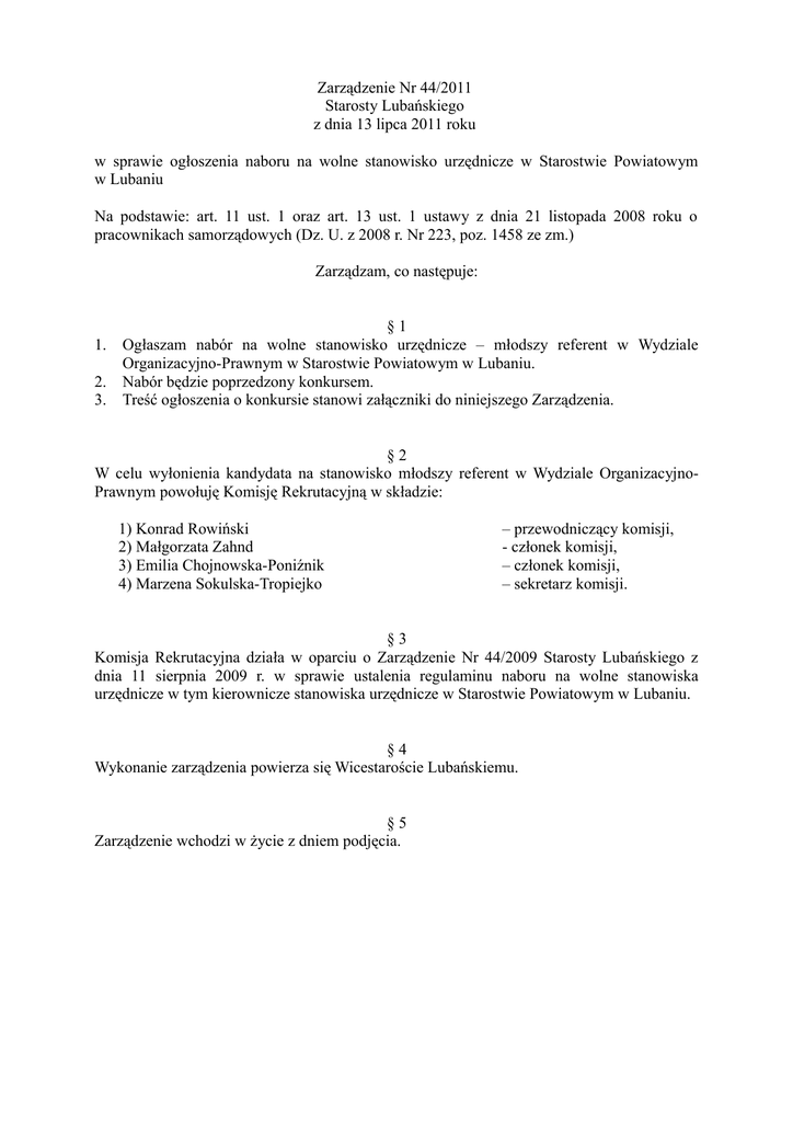 Zarządzenie Nr 44/2011 Starosty Lubańskiego z dnia 13 lipca 2011 roku w sprawie ogłoszenia naboru na wolne stanowisko urzędnicze w Starostwie Powiatowym w Lubaniu Na podstawie: art. 11 ust. 1 oraz art. 13 ust. 1 ustawy z dnia 21 listopada 2008 roku o pracownikach samorządowych (Dz. U. z 2008 r. Nr 223, poz. 1458 ze zm.) Zarządzam, co następuje: 1. 2. 3. §1 Ogłaszam nabór na wolne stanowisko urzędnicze – młodszy referent w Wydziale Organizacyjno-Prawnym w Starostwie Powiatowym w Lubaniu. Nabór będzie poprzedzony konkursem. Treść ogłoszenia o konkursie stanowi załączniki do niniejszego Zarządzenia. §2 W celu wyłonienia kandydata na stanowisko młodszy referent w Wydziale OrganizacyjnoPrawnym powołuję Komisję Rekrutacyjną w składzie: 1) Konrad Rowiński 2) Małgorzata Zahnd 3) Emilia Chojnowska-Poniźnik 4) Marzena Sokulska-Tropiejko – przewodniczący komisji, - członek komisji, – członek komisji, – sekretarz komisji. §3 Komisja Rekrutacyjna działa w oparciu o Zarządzenie Nr 44/2009 Starosty Lubańskiego z dnia 11 sierpnia 2009 r. w sprawie ustalenia regulaminu naboru na wolne stanowiska urzędnicze w tym kierownicze stanowiska urzędnicze w Starostwie Powiatowym w Lubaniu. §4 Wykonanie zarządzenia powierza się Wicestaroście Lubańskiemu. §5 Zarządzenie wchodzi w życie z dniem podjęcia. Załącznik do Zarządzenia Nr 44/2011 Starosty Lubańskiego z dnia 13.07.2011r. OGŁOSZENIE STAROSTY LUBAŃSKIEGO NA WOLNE STANOWISKO URZĘDNICZE młodszy referent w Wydziale Organizacyjno-Prawnym 1. Nazwa i adres jednostki: Starostwo Powiatowe w Lubaniu, ul. Mickiewicza 2,59-800 Lubań. 2. Wymagania niezbędne: 1) obywatelstwo polskie, 2) pełna zdolność do czynności prawnych oraz korzystanie z pełni praw publicznych, 3) nieposzlakowana opinia, 4) wykształcenie wyższe, 5) biegła umiejętność obsługi komputera z systemem Microsoft Windows XP lub nowszym, 6) umiejętność zastosowania przepisów niezbędnych do właściwego wykonywania obowiązków, 7) umiejętność podejmowania decyzji w sposób bezstronny i obiektywny, 8) posiadanie następujących cech osobowościowych: uczciwość, bezstronność, kultura osobista, odpowiedzialność, kreatywność i samodzielność. 3. Wymagania dodatkowe: nie dotyczy 4. Zadania wykonywane na stanowisku: 1) Udzielanie pozwoleń na przeprowadzenie zbiórki publicznej na obszarze powiatu lub jego części obejmującej więcej niż jedną gminę, 2) Wydawanie pozwoleń na przewożenie zwłok i szczątków ludzkich z zagranicy, 3) Organizowanie przewozu zwłok osób zmarłych lub zabitych w miejscach publicznych przed ich pochowaniem, na wniosek właściwego organu, do zakładu medycyny sądowej, a w razie jego braku na obszarze powiatu do najbliższego szpitala mającego prosektorium, celem ustalenia przyczyny zgonu, 4) Nadzorowanie działalności stowarzyszeń działających na terenie powiatu, 5) Nadzorowanie działalności fundacji na terenie powiatu, 6) Udział w pracach związanych z wyborami prezydenckimi, parlamentarnymi i samorządowymi oraz w organizacji referendum, 7) Prowadzenie archiwum zakładowego zgodnie z instrukcją archiwalną przyjętą rozporządzeniem Prezesa Rady Ministrów z dnia 18 stycznia 2011r. w sprawie instrukcji kancelaryjnej, jednolitych rzeczowych wykazów akt oraz instrukcji w sprawie organizacji i zakresu działania archiwów zakładowych (Dz.U. Nr 14, poz.67 z późn. zm.), 8) Prowadzenie spraw z zakresu tajemnicy skarbowej, 9) Prowadzenie biblioteki urzędowej w tym: − prowadzenie rejestru zakupionych wydawnictw − kompletowanie zakupionych Dzienników Ustaw, Monitorów itp. 10) Prenumerata prasy zakupionej na potrzeby Starostwa, 11) Rozliczanie faktur związanych z zakupami jak w pkt. 9, 10. 12) Prowadzenie spraw z zakresu umów podpisanych przez Starostwo z TP S.A., Dialog, ERA i Orange- komórki, 13) Analiza i rozliczanie rozmów prywatnych telefonów stacjonarnych i komórkowych, 14) Prowadzenie spraw związanych z zaopatrzeniem w materiały biurowe, 15) Wykonywanie innych zadań zleconych przez Naczelnika Wydziału i jego Zastępcę. 5. Wymagane dokumenty: 1) życiorys (CV), 2) list motywacyjny, 3) kwestionariusz osobowy – według wzoru dostępnego na stronie internetowej Starostwa Powiatowego w Lubaniu oraz w Dziale Kadr, 4) kopia dokumentu tożsamości, 5) kopie dokumentów potwierdzających: wykształcenie ( kserokopia dyplomu ukończenia studiów wyższych), doświadczenie zawodowe (kserokopie świadectw pracy lub zaświadczeń), kwalifikacje i umiejętności, 6) oświadczenie o treści: „Posiadam pełną zdolność do czynności prawnych oraz korzystam w pełni z praw publicznych, nie byłam (byłem) skazana(y) prawomocnym wyrokiem sądu za umyślne przestępstwo ścigane z oskarżenia publicznego lub umyślne przestępstwo skarbowe” opatrzone własnoręcznym podpisem, 7) oświadczenie o stanie zdrowia pozwalającym na wykonywanie pracy na stanowisku młodszego referenta.. 6. Warunki zatrudnienia: a) sposób zatrudnienia: umowa o pracę na czas określony, b) wymiar czasu pracy: pełny etat, c) wynagrodzenie stosowne do zajmowanego stanowiska oraz posiadanych kwalifikacji, zgodnie z zasadami określonymi w Zarządzeniu Nr 32/2009 Starosty Lubańskiego z dnia 8 czerwca 2009 roku w sprawie ustalenia Regulaminu wynagradzania pracowników Starostwa Powiatowego w Lubaniu ( z późn. zm.), d) termin rozpoczęcia pracy: do uzgodnienia, e) w przypadku, kiedy jest to pierwsza praca na stanowisku urzędniczym w jednostkach samorządowych, obowiązuje odbycie służby przygotowawczej. 7. Miejsce i termin złożenia dokumentów: a) wymagane dokumenty aplikacyjne należy składać w sekretariacie Starostwa Powiatowego w Lubaniu, pocztą elektroniczną na adres: [email protected] w przypadku posiadanych uprawnień do podpisu elektronicznego lub korespondencyjnie na adres urzędu ( ul. Mickiewicza 2, 59-800 Lubań) z dopiskiem „Nabór na stanowisko MŁODSZEGO REFERENTA W W