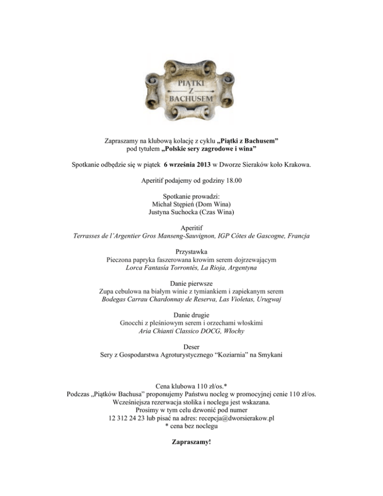 Zapraszamy na klubową kolację z cyklu „Piątki z Bachusem” pod tytułem „Polskie sery zagrodowe i wina” Spotkanie odbędzie się w piątek 6 września 2013 w Dworze Sieraków koło Krakowa. Aperitif podajemy od godziny 18.00 Spotkanie prowadzi: Michał Stępień (Dom Wina) Justyna Suchocka (Czas Wina) Aperitif Terrasses de l’Argentier Gros Manseng-Sauvignon, IGP Côtes de Gascogne, Francja Przystawka Pieczona papryka faszerowana krowim serem dojrzewającym Lorca Fantasía Torrontés, La Rioja, Argentyna Danie pierwsze Zupa cebulowa na białym winie z tymiankiem i zapiekanym serem Bodegas Carrau Chardonnay de Reserva, Las Violetas, Urugwaj Danie drugie Gnocchi z pleśniowym serem i orzechami włoskimi Aria Chianti Classico DOCG, Włochy Deser Sery z Gospodarstwa Agroturystycznego “Koziarnia” na Smykani Cena klubowa 110 zł/os.* Podczas „Piątków Bachusa” proponujemy Państwu nocleg w promocyjnej cenie 110 zł/os. Wcześniejsza rezerwacja stolika i noclegu jest wskazana. Prosimy w tym celu dzwonić pod numer 12 312 24 23 lub pisać na adres: [email protected] * cena bez noclegu Zapraszamy!