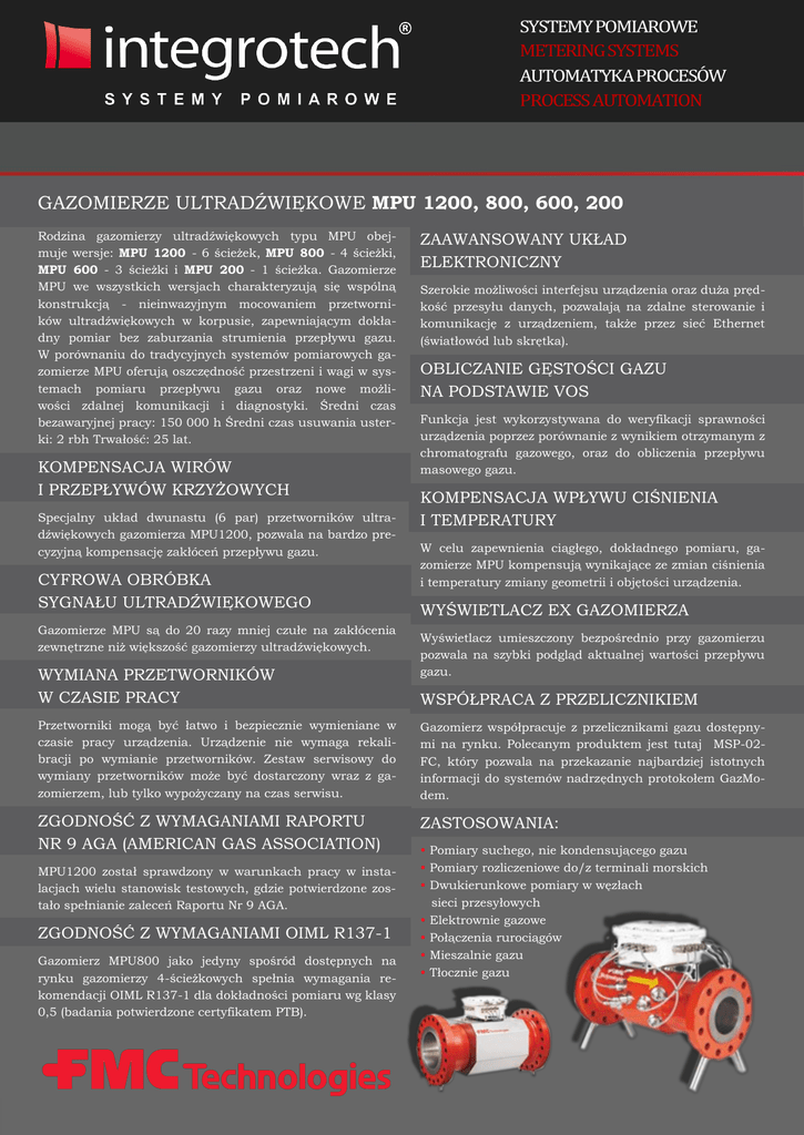 SYSTEMY POMIAROWE METERING SYSTEMS AUTOMATYKA PROCESOW PROCESS AUTOMATION GAZOMIERZE ULTRADŹWIĘKOWE MPU 1200, 800, 600, 200 Rodzina gazomierzy ultradźwiękowych typu MPU obejmuje wersje: MPU 1200 - 6 ścieżek, MPU 800 - 4 ścieżki, MPU 600 - 3 ścieżki i MPU 200 - 1 ścieżka. Gazomierze MPU we wszystkich wersjach charakteryzują się wspólną konstrukcją - nieinwazyjnym mocowaniem przetworników ultradźwiękowych w korpusie, zapewniającym dokładny pomiar bez zaburzania strumienia przepływu gazu. W porównaniu do tradycyjnych systemów pomiarowych gazomierze MPU oferują oszczędność przestrzeni i wagi w systemach pomiaru przepływu gazu oraz nowe możliwości zdalnej komunikacji i diagnostyki. Średni czas bezawaryjnej pracy: 150 000 h Średni czas usuwania usterki: 2 rbh Trwałość: 25 lat. KOMPENSACJA WIRÓW I PRZEPŁYWÓW KRZYŻOWYCH Specjalny układ dwunastu (6 par) przetworników ultradźwiękowych gazomierza MPU1200, pozwala na bardzo precyzyjną kompensację zakłóceń przepływu gazu. CYFROWA OBRÓBKA SYGNAŁU ULTRADŹWIĘKOWEGO Gazomierze MPU są do 20 razy mniej czułe na zakłócenia zewnętrzne niż większość gazomierzy ultradźwiękowych. WYMIANA PRZETWORNIKÓW W CZASIE PRACY ZAAWANSOWANY UKŁAD ELEKTRONICZNY Szerokie możliwości interfejsu urządzenia oraz duża prędkość przesyłu danych, pozwalają na zdalne sterowanie i komunikację z urządzeniem, także przez sieć Ethernet (światłowód lub skrętka). OBLICZANIE GĘSTOŚCI GAZU NA PODSTAWIE VOS Funkcja jest wykorzystywana do weryfikacji sprawności urządzenia poprzez porównanie z wynikiem otrzymanym z chromatografu gazowego, oraz do obliczenia przepływu masowego gazu. KOMPENSACJA WPŁYWU CIŚNIENIA I TEMPERATURY W celu zapewnienia ciągłego, dokładnego pomiaru, gazomierze MPU kompensują wynikające ze zmian ciśnienia i temperatury zmiany geometrii i objętości urządzenia. WYŚWIETLACZ EX GAZOMIERZA Wyświetlacz umieszczony bezpośrednio przy gazomierzu pozwala na szybki podgląd aktualnej wartości przepływu gazu. WSPÓŁPRACA Z PRZELICZNIKIEM Przetworniki mogą być łatwo i bezpiecznie wymieniane w czasie pracy urządzenia. Urządzenie nie wymaga rekalibracji po wymianie przetworników. Zestaw serwisowy do wymiany przetworników może być dostarczony wraz z gazomierzem, lub tylko wypożyczany na czas serwisu. Gazomierz współpracuje z przelicznikami gazu dostępnymi na rynku. Polecanym produktem jest tutaj MSP-02FC, który pozwala na przekazanie najbardziej istotnych informacji do systemów nadrzędnych protokołem GazModem. ZGODNOŚĆ Z WYMAGANIAMI RAPORTU NR 9 AGA (AMERICAN GAS ASSOCIATION) ZASTOSOWANIA: MPU1200 został sprawdzony w warunkach pracy w instalacjach wielu stanowisk testowych, gdzie potwierdzone zostało spełnianie zaleceń Raportu Nr 9 AGA. ZGODNOŚĆ Z WYMAGANIAMI OIML R137-1 Gazomierz MPU800 jako jedyny spośród dostępnych na rynku gazomierzy 4-ścieżkowych spełnia wymagania rekomendacji OIML R137-1 dla dokładności pomiaru wg klasy 0,5 (badania potwierdzone certyfikatem PTB). • Pomiary suchego, nie kondensującego gazu • Pomiary rozliczeniowe do/z terminali morskich • Dwukierunkowe pomiary w węzłach sieci przesyłowych • Elektrownie gazowe • Połączenia rurociągów • Mieszalnie gazu • Tłocznie gazu SYSTEMY POMIAROWE METERING SYSTEMS AUTOMATYKA PROCESOW PROCESS AUTOMATION RODZINA GAZOMIERZY ULTRADŹWIĘKOWYCH MPU DANE TECHNICZNE WARUNKI PRACY DOKŁADNOŚĆ (DANE DLA MPU1200) • ZAKRES PRZEPŁYWU: Wielkość gazomierza* Przepływ [m/s] DN150÷DN400 0,4 ÷ 30 (45)** DN450÷DN750 0,3 ÷ 26 (40) DN800÷DN1400 0,2 ÷ 20 (30) Na zamówienie dostępne są korpusy o dowolnej wielkości przyłącza. ** W nawiasach podano wartości maksymalne uzyskane w warunkach eksploatacyjnych, które nie są ostatecznym limitem. • ZAKRES CIŚNIEŃ PRACY: 0 ÷ 420 bar* Ciśnienia powyżej tego zakresu dostępne są po konsultacji. • TEMPERATURA: Temperatura pracy -20 °C ÷ 70° C Temperatura otoczenia -30 °C ÷ 60° C Temperatura przechowywania -20 °C ÷ 70° C • PRZYŁĄCZA: • Po „suchej kalibracji”: ≤ ±0,5% wartości mierzonej. • Po kalibracji przepływowej: ≤ ±0,1% wartości mierzonej. • Powtarzalność: ≤ ±0,05% wartości mierzonej. DOPUSZCZENIA I CERTYFIKATY Ex d IIB T5 • DOPUSZCZENIA ELEKTRYCZNE: CENELEC (NEMKO), FM, CSA • ZATWIERDZENIA TYPU: Niemcy: PTB 7.241 00.03 Holandia: NMi B28 Rosja: Gosstandart NO.C.29.004.A No. 10209 Indonezja: MIGAS 309738.04-DMT/1999 Malezja: SIRIM NMC/448/12/4 Chiny: CPA 2002-F235 Znak CE i Zatwierdzonie CRN WIN SCREEN WinScreen jest interfejsem graficznym gazomierzy MPU, zapewniającym dostęp do bieżących parametrów eksploatacyjnych gazomierzy oraz wykorzystywanym do konfiguracji i diagnostyki zdalnego wsparcia serwisowego. Kołnierze - dowolne. • WILGOTNOŚĆ: Do 95%, bez kondensacji • KORPUS: Stal węglowa (standard), Stal SS lub Duplex, zgodnie ze specyfikacją zamawiającego. Długość korpusu - 3D (możliwość 2D) Program jest dostępny w polskiej wersji językowej • PRZETWORNIKI: Piezoelektryczne, w obudowie tytanowej. • ZASILANIE: 24 VDC, 230 VAC. INTERFEJS KOMUNIKACYJNY • ETHERNET: Światłowód (100Base-FL) Skrętka (10Base-T) • PORTY SZEREGOWE: 2 porty do dowolnej konfiguracji RS-485 lub RS-232 (wykorzystanie protokołu MODBUS RTU lub ASCII). • WYJŚCIA IMPULSOWE: 4 dowolnie konfigurowalne wyjścia impulsowe typu OC mogą służyć do porównania z przepływem gazomierza turbinowego. • WYJŚCIA STANOWE 2 wyjścia dowolnie konfigurowalne • WEJŚCIA/WYJŚCIA ANALOGOWE (4-20 mA) Do 2 wejść/wyjść analogowych - mogą służyć do połączenia ze sterownikiem, zewnętrznym wyświetlaczem lub wprowadzenia sygnału P i T w celu wyliczenia przez gazomierz przepływu normalnego. Możliwości programu WinScreen obejmują m.in. podgląd funkcji autodiagnostycznych gazomierza oraz rejestracji zdarzeń uporządkowanych według czasu wystąpienia, rodzaju zdarzenia lub za