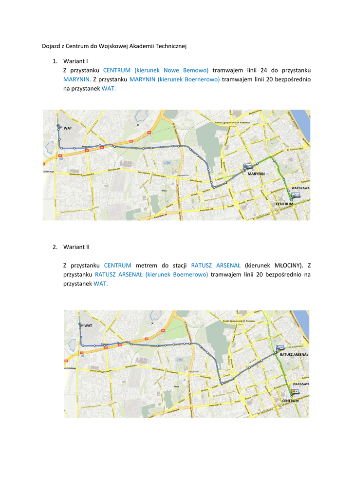 Dojazd z Centrum do Wojskowej Akademii Technicznej 1. Wariant I Z przystanku CENTRUM (kierunek Nowe Bemowo) tramwajem linii 24 do przystanku MARYNIN. Z przystanku MARYNIN (kierunek Boernerowo) tramwajem linii 20 bezpośrednio na przystanek WAT. 2. Wariant II Z przystanku CENTRUM metrem do stacji RATUSZ ARSENAŁ (kierunek MŁOCINY). Z przystanku RATUSZ ARSENAŁ (kierunek Boernerowo) tramwajem linii 20 bezpośrednio na przystanek WAT.
