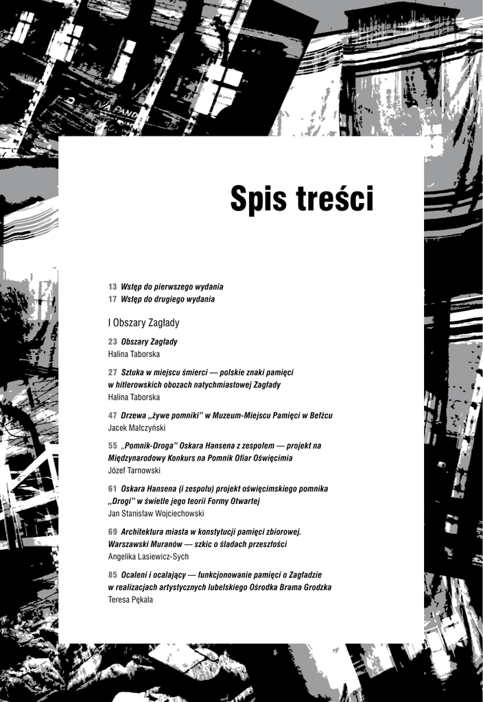 Spis treści 13 Wstęp do pierwszego wydania 17 Wstęp do drugiego wydania I Obszary Zagłady 23 Obszary Zagłady Halina Taborska 27 Sztuka w miejscu śmierci — polskie znaki pamięci w hitlerowskich obozach natychmiastowej Zagłady Halina Taborska 47 Drzewa „żywe pomniki” w Muzeum-Miejscu Pamięci w Bełżcu Jacek Małczyński 55 „Pomnik-Droga” Oskara Hansena z zespołem — projekt na Międzynarodowy Konkurs na Pomnik Ofiar Oświęcimia Józef Tarnowski 61 Oskara Hansena (i zespołu) projekt oświęcimskiego pomnika „Drogi” w świetle jego teorii Formy Otwartej Jan Stanisław Wojciechowski 69 Architektura miasta w konstytucji pamięci zbiorowej. Warszawski Muranów — szkic o śladach przeszłości Angelika Lasiewicz-Sych 85 Ocaleni i ocalający — funkcjonowanie pamięci o Zagładzie w realizacjach artystycznych lubelskiego Ośrodka Brama Grodzka Teresa Pękala 99 Nowoczesna przestrzeń Zagłady? Piotr Winskowski 115 Trzy zderzenia trzech reprezentacji z trzema świadkami Piotr Winskowski 119 Wokół „Twarzy innego” i jej twórcy Halina Taborska, Jan Stanisław Wojciechowski II Litzmannstadt Ghetto 127 Ghetto Litzmannstadt Tomasz Majewski 133 Chaim Rumkowski jako mówca Paweł Spodenkiewicz 147 Elementy języka propagandy w Kronice getta łódzkiego Monika Polit 163 Środowisko literackie w getcie łódzkim Małgorzata Kozieł 189 Ostatnie drogi sióstr Franza Kafki Grzegorz Gazda 205 Teren Wiktor Skok 209 Ulice bez pamięci Tomasz Majewski 213 „Jude” Wiktor Skok 217 Obrazy z getta [Jude] Krystyna Wilkoszewska 219 Raport Piotr Winskowski 221 Egzorcyzmowanie miasta. Public Movement w Łodzi Agata Siwiak 233 Łódź Bałuty. Pamięć Zagłady w pejzażu miejskim Piotr Piluk 237 Pamięć getta w Łodzi Joanna Podolska III Dyskurs publiczny po Shoah 251 Dyskurs publiczny po Shoah Tomasz Majewski 259 Perspektywa filozoficzna w dyskursie publicznym na temat Zagłady Jan P. Hudzik 279 Zachodnioniemiecka recepcja serialu „Holocaust” Magdalena Saryusz-Wolska 287 Spór o niemiecką pamięć w kontekście mowy Martina Walsera z 11.10.1998 r. (Friedenspreisrede) Joanna Jabłkowska 303 Przeszłość w austriackim dyskursie publicznym — przypadek „Heldenplatz” Thomasa Bernharda Karol Franczak 321 Shoah w austriackiej pamięci zbiorowej na przykładzie „Stecken, Stab und Stangl” Elfriede Jelinek Artur Pełka 331 Lyoński proces Klausa Barbiego — rozgrywanie pęknięć pamięci Tomasz Majewski 337 Próby legitymizacji władzy w Polsce po zniesieniu stanu wojennego: przypadek „Shoah” Claude’a Lanzmanna Ewa Ochman 361 Prawdy niechciane i potrzeba ich społecznej artykulacji Sławomir Buryła 371 Holocaust i religia publiczna Szewach Weiss IV Wokół (nie)pamięci Zagłady 377 Wokół (nie)pamięci Zagłady Włodzimierz Mich 381 Problem pamięci Zagłady na łamach prasy polskiej po roku 1989 Włodzimierz Mich 401 Sposoby zaprzeczania Zagładzie Żydów: przypadek środowisk neoendeckich Ewa Maj 421 Czas wyboru. Publicyści „Prosto z Mostu” wobec Zagłady Małgorzata Domagalska 431 Iluzoryczne „oczyszczanie” pamięci stosunków polsko‑żydowskich w dekadę po upadku komunizmu w Europie Wschodniej Ewa Ochman V Punkty odniesienia 443 Punkty odniesienia Anna Zeidler-Janiszewska 453 Historiografia Auschwitzu: od krytycznej negacji do instrumentalizacji Jacek Zychowicz 475 Czy możliwa jest poezja po Holocauście? Agneš Heller, Ferenc Fehér 483 Pisanie historii, pisanie traumy Dominick LaCapra 513 Fikcjonalne i niefikcjonalne dyskursy historyczne: historiograficzne i literackie przedstawienia Zagłady Anna Ziębińska-Witek 525 O myszach i mimesis. Czytając Spiegelmana z Adornem Andreas Huyssen 539 Siegfried Kracauer: teoria filmu po Zagładzie Tomasz Majewski 553 Między pamięcią o Shoah a pamięcią obietnicy mesjańskiej Katarzyna Liszka 577 Żydzi — chrześcijanie: dwie pamięci Ks. Romuald Jakub Weksler-Waszkinel 589 Ocaleni z Holocaustu w oczach psychiatry, czyli o milczeniu i pamięci Krzysztof Szwajca 597 Naturalna Historia Zła Zygmunt Bauman VI Doświadczenie pamięci, doświadczenie pustki 615 Doświadczenie pamięci, doświadczenie pustki Ewa Rewers 621 Pustka i forma Ewa Rewers 631 Architektura trwogi Krzysztof Lenartowicz 647 O nowy kształt pamięci. Muzeum Żydowskie w Berlinie Jarosław Lubiak 657 Przestrzenie pamięci: żydowskie muzea Daniela Libeskinda Maria Popczyk 665 Jasna przestrzeń, biel i szarość, historia i przyszłość Piotr Winskowski 675 „Auschwitz Apel” Wojciecha Prażmowskiego Agnieszka Rejniak-Majewska VII Pamięć poprzez sztukę 683 Pamięć przez sztukę Alicja Kuczyńska 687 Oczy pamięci Alicja Kuczyńska 695 Implozje Holocaustu w próżnię współczesności. Kontrowersyjne wątki w dyskursie Zagłady Jacek Zydorowicz 705 Władysław Strzemiński i jego artystyczny dokument Zagłady Katarzyna Bojarska 719 Józef Szajna: nasycenie formy Krystyna Wilkoszewska 725 Pamięć i kontrpamięć w przekazie artystycznym. Wokół prac Christiana Boltanski’ego Jolanta Dąbkowska-Zydroń 735 Ruckleitung des Leerzuges. O malarstwie Luca Tuymansa Rafał Jakubowicz 747 Sztuka dokumentu — fotografia i trauma Marianna Michałowska 759 O pamięci i statusie obrazu (na przykładzie prac Zbigniewa Libery i Rolanda Schefferskiego) Beata Frydryczak 767 Pamięć Shoah? Roland Schefferski 769 Ślady na poboczu (uwagi na temat instalacji Rolanda Schefferskiego) Blanka Brzozowska VIII Literatura wobec Zagłady 775 Literatura wobec Zagłady Przemysław Czapliński 785 Holocaust jako nowe doświadczenie literackie Henryk Grynberg 797 „Życie z gwiazdą” Jiříego Weila i temat Holocaustu w literaturze czeskiej Jiří Holý 805 Literatura wobec Zagłady: w poszukiwaniu kanonu Monika Adamczyk-Garbowska 815 Słowa do ciszy. Poetyki Shoah w liryce polskiej — rekonesans Katarzyna Kuczyńska–Koschany 827 Pamięć ocalonych w twórczości Henryka Grynberga, Hanny Krall i Bogdana Wojdowskiego Monika Szabłowska 837 Małe na