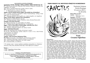 OGŁOSZENIA DUSZPASTERSKIE Poniedziałek 13.06 Św. Antoniego z Padwy, prezbitera i doktora Kościoła (wsp. ob. ob.) 800 + Annę, Henryka Baryckich, Agnieszkę, Jana, Stanisława Węgrzynów, Mariannę, Józefa Rabiejów z int. rodziny 1200 + Do Św. Antoniego dziękczynna z prośbą o zdrowie i opiekę 1600 1) Annę Skowron (11 r. śm.) z int. Skowrona 2) + Mieczysława Jaszewskiego z int. rodziny Wtorek 14.06 Bł. Michała Kozala, biskupa i męczennika (wsp. obowiązkowe) 1730 + Leokadię, Stanisława Domagałów, Stefana Wojcieszyńskiego, Jadwigę, Józefa Gniewskich z int. Wojcieszyńskich. 1800 + Katarzynę, Stanisława, Jana Zegadłów zm. z rodziny Zegadłów z int. Zegadłowej Środa 15.06 Bł. Jolanty, zakonnicy (wsp. obowiązkowe) 700 + Władysława i Feliksę Mazurów z int. syna 1800 + Mariannę, Genowefę, Andrzeja, Władysława, Janinę, Marianna Ślusarczyków Czwartek 16.06 Dzień Powszedni 700 + Henryka Góreckiego z int. siostry Janiny z int. rodziną 1800 + Stanisława Kaczora, Kazimierę Stokowiec z int. Kaczorowej Piątek 17.06 Św. Brata Brata Alberta Chmielowskiego, zakonnika (wsp. obow.) 1730 + Stanisława, Janinę Tkaczów z int. rodziny 1800 + Stanisławę, Władysława Mrolów z int. rodziny z Łazisk. Sobota 18.06 Dzień Powszedni 1500 Do SPJ i MB dziękczynna z prośbą o bł. dla dzieci i wnuków 1530 Do SPJ i MB dziękczynna z prośbą o dalsze bł. w życiu w 15-tą r. ślubu Wioletty i Jacka Więcków z int. rodziców 1600 ślub Stachura i Karpiński 1700 ślub Słowińska i Woś Niedziela 19.06 Uroczystość Najświętszej Trójcy 800 + Mariana Gawiora zm. z rodz. Rabiejów z int. Gawiorowej z dziećmi 1000 + Władysława Malickiego i Stanisławę Malicką z int. Kubickich. 1200 + Józefę i Stanisława Adamczyków z int. córki z rodziną 1600 + Franciszka Kołka z int. Kołkowej † W ostatnim czasie z naszej wspólnoty parafialnej pożegnaliśmy śp. Mirosława Gawrysia z Nidy, który odszedł do domu Ojca. Niech odpoczywa w pokoju † Ekstra… × 12.06 - Święto Biura Ochrony Rządu × 15.06 - Dzień Wiatru Parafia p.w. Wszystkich Świętych Brzeziny ul. Chęcińska 312, 26-026 Morawica, e-mail: [email protected] nr tel. ks. Proboszcz 41 311 42 59, ks. Wikariusz 41 311 48 98 Numer konta: Bank Spółdzielczy w Kielcach Oddział w Morawicy 08 84930004 0070 0205 4104 0001 D O U Ż Y T K U W E W N Ę T R Z N E G O PISMO PARAFII P.W. WSZYSTKICH ŚWIĘTYCH W BRZEZINACH SANC SANCTUS Niedziela Zesłania Ducha Świętego 12 czerwca 2011 r. Nr 29 (133) Słowo Boże na dziś… Czytania: Dz 2,1-11 1 Kor 12,3b-7.12-13 Ewangelia: J 20,19-23 „Wieczorem w dniu Zmartwychwstania, tam gdzie przebywali uczniowie, gdy drzwi były zamknięte z obawy przed Żydami, przyszedł Jezus, stanął pośrodku i rzekł do nich: Pokój wam! A to powiedziawszy, pokazał im ręce i bok. Uradowali się zatem uczniowie ujrzawszy Pana. A Jezus znowu rzekł do nich: Pokój wam! Jak Ojciec Mnie posłał, tak i Ja was posyłam. Po tych słowach tchnął na nich i powiedział im: Weźmijcie Ducha Świętego! Którym odpuścicie grzechy, są im odpuszczone, a którym zatrzymacie, są im zatrzymane.” Veni Creator Spiritus Komentarz… Możemy sobie wyobrazić Boga jako starca z brodą. Jezusa, który stał się Człowiekiem. Nie sposób wyobrazić sobie Ducha Świętego – strażnika duchowej, niewyobrażalnej wielkości Boga. Ze znanych mi widzialnych znaków Ducha Świętego najbardziej odpowiadają mi trzy: wiatr, woda i ogień. Wiatr. Święty Jan zapisał: „Wiatr wieje tam, gdzie chce”. Ducha Świętego nie można przywiązać w jednym miejscu. Jest tu i tam. Woda. Jezus stale mówił o źródle wody żywej. Ogień. W dniu Zesłania Ducha Świętego nad głowami Apostołów pokazały się języki ognia. Poprzez te znaki szukamy po omacku Boga, jak niewidomy, który dotyka przedmiotów, żeby się nie przewrócić. Wiatr przelatuje, jest powietrzem, które się spieszy; nie widzimy go, ale widzimy kołyszące się od jego powiewu liście. Mocy wody też nie możemy zobaczyć, ale widzimy, jak wszystko wokół dzięki niej żyje. Ksiądz machnie kropidłem – ludzie od razu się uśmiechają, bo spadają na nich krople żywiołu, który odradza świat. Ogień wypala na proch, „idzie na całość”. Duch Święty kojarzy się też z ogniem, który przynosi ciepło, światło, dobro, miłość, poświęcenie bez końca. Przypomina lampkę oliwną na grobie, która ogrzewa zziębnięte dusze. Ogień nigdy nie powie „dosyć”. W Pieśni nad Pieśniami Bóg jest ogniem pożerającym. Bogu nie można się oddać na piętnaście procent. Ileż można powiedzieć o Duchu Świętym nie posługując się słowami. /ks. Jan Twardowski/ A w parafii… Boży człowiek… - św. Elżbieta z Schonau (18 czerwca) ▪ 1 czerwca nasz kościół zwiedzała 22-osobowa delegacja uczniów i nauczycieli z hiszpańskiego Agramunt i tureckiego Tirebolu, którzy przyjechali na tydzień do szkoły w Kowali w ramach programu „Comenius”. ▪ 5 czerwca odbyły się ostatnie poświęcenia pól w naszej parafii. Księża odmówili modlitwy i błogosławieństwa w Brzezinach i na Podwolu. Elżbieta urodziła się około 1129 r. zapewne w niemieckim Bonn.. Była jeszcze dzieckiem, kiedy pobożni rodzice zwyczajem ówczesnym oddali ją na naukę i wychowanie do klasztoru benedyktynek w Schönau nad Renem. Tu pozostała na zawsze. W roku 1147 jako 18-letnie dziewczę przywdziała welon zakonny, by niedługo potem złożyć śluby. Po 10 latach została wybrana na mistrzynię nowicjatu, a potem na przełożoną. W pięć lat po wstąpieniu do klasztoru Elżbieta zapadła na ciężką chorobę, którą znosiła przez 12 lat z heroiczną cierpliwością. Kiedy cierpienia się wzmagały i nie mogła chodzić o własnych nogach, wykorzystywała cenny czas na słodką modlitwę z Bogiem. Obdarzona darem wysokiej kontemplacji doznawała daru objawień Pana Jezusa, Matki Bożej i świętych Pańskich. Obdarzy