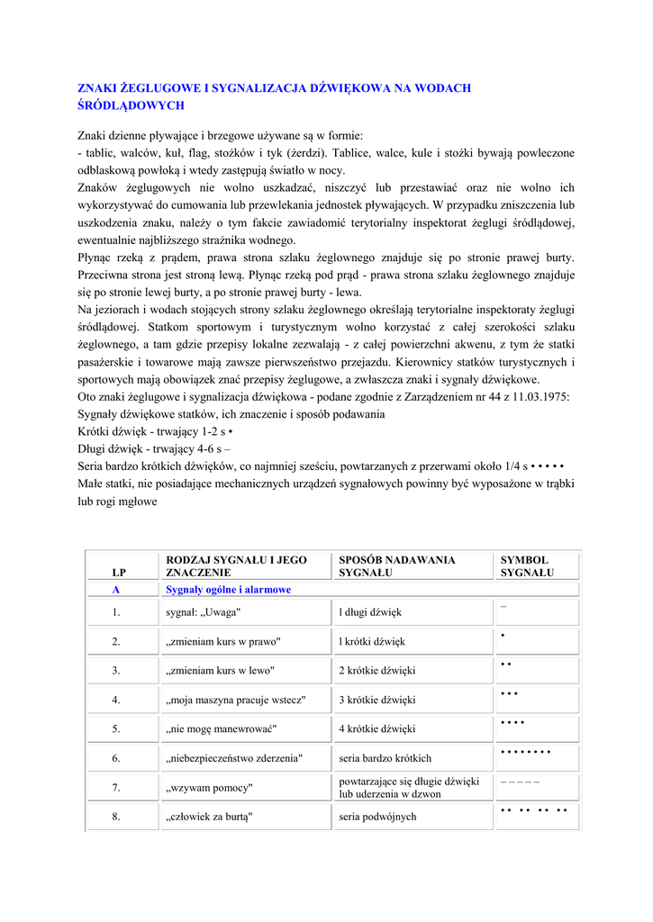ZNAKI ŻEGLUGOWE I SYGNALIZACJA DŹWIĘKOWA NA WODACH ŚRÓDLĄDOWYCH Znaki dzienne pływające i brzegowe używane są w formie: - tablic, walców, kuł, flag, stożków i tyk (żerdzi). Tablice, walce, kule i stożki bywają powleczone odblaskową powłoką i wtedy zastępują światło w nocy. Znaków żeglugowych nie wolno uszkadzać, niszczyć lub przestawiać oraz nie wolno ich wykorzystywać do cumowania lub przewlekania jednostek pływających. W przypadku zniszczenia lub uszkodzenia znaku, należy o tym fakcie zawiadomić terytorialny inspektorat żeglugi śródlądowej, ewentualnie najbliższego strażnika wodnego. Płynąc rzeką z prądem, prawa strona szlaku żeglownego znajduje się po stronie prawej burty. Przeciwna strona jest stroną lewą. Płynąc rzeką pod prąd - prawa strona szlaku żeglownego znajduje się po stronie lewej burty, a po stronie prawej burty - lewa. Na jeziorach i wodach stojących strony szlaku żeglownego określają terytorialne inspektoraty żeglugi śródlądowej. Statkom sportowym i turystycznym wolno korzystać z całej szerokości szlaku żeglownego, a tam gdzie przepisy lokalne zezwalają - z całej powierzchni akwenu, z tym że statki pasażerskie i towarowe mają zawsze pierwszeństwo przejazdu. Kierownicy statków turystycznych i sportowych mają obowiązek znać przepisy żeglugowe, a zwłaszcza znaki i sygnały dźwiękowe. Oto znaki żeglugowe i sygnalizacja dźwiękowa - podane zgodnie z Zarządzeniem nr 44 z 11.03.1975: Sygnały dźwiękowe statków, ich znaczenie i sposób podawania Krótki dźwięk - trwający 1-2 s • Długi dźwięk - trwający 4-6 s – Seria bardzo krótkich dźwięków, co najmniej sześciu, powtarzanych z przerwami około 1/4 s • • • • • Małe statki, nie posiadające mechanicznych urządzeń sygnałowych powinny być wyposażone w trąbki lub rogi mgłowe LP RODZAJ SYGNAŁU I JEGO ZNACZENIE SPOSÓB NADAWANIA SYGNAŁU A Sygnały ogólne i alarmowe 1. sygnał: „Uwaga" l długi dźwięk 2. „zmieniam kurs w prawo" l krótki dźwięk 3. „zmieniam kurs w lewo" 2 krótkie dźwięki 4. „moja maszyna pracuje wstecz" 3 krótkie dźwięki 5. „nie mogę manewrować" 4 krótkie dźwięki 6. „niebezpieczeństwo zderzenia" seria bardzo krótkich 7. „wzywam pomocy" powtarzające się długie dźwięki lub uderzenia w dzwon 8. „człowiek za burtą" seria podwójnych SYMBOL SYGNAŁU – • •• ••• •••• •••••••• ––––– •• •• •• •• 9. „zatrzymajcie natychmiast statek" B Sygnały mijania 10. Sygnał zapowiadający zasadę mijania, nadawany przez statek płynący w górę: a) „chcę minąć wzdłuż lewej burty" b) „chcę minąć wzdłuż prawej burty" 11. Sygnał uzgadniający zasadę mijania nadawany przez statek płynący w dół: a) „zgadzam się, mijajcie mnie wzdłuż lewej burty" b) „zgadzam się, mijajcie mnie wzdłuż prawej burty" 12. sygnał proponujący odstępstwo od zasady mijania nadawany przez statek płynący w dół: a) „nie zgadzam się, mijajcie wzdłuż prawej burty" b) „nie zgadzam się, mijajcie wzdłuż lewej burty" 13. Sygnał proponujący odstępstwo od zasady mijania nadawany przez statek płynący w górę: a) „zgadzam się, mijam wzdłuż prawej burty" b) „zgadzam się, mijam wzdłuż lewej burty" l krótki, l długi i 2 krótkie dźwięki l krótki dźwięk 2 krótkie dźwięki l krótki dźwięk 2 krótkie dźwięki 2 krótkie dźwięki l krótki dźwięk 2 krótkie dźwięki l krótki dźwięk •–•• • •• •• •• •• • •• • C Sygnały wyprzedzania 14. Sygnał zapowiadający zasadę wyprzedzania nadawany przez statek wyprzedzający a) „chcę wyprzedzić wzdłuż waszej lewej burty" b) „chcę wyprzedzić wzdłuż waszej prawej burty" 15. Sygnał uzgadniający zasadę wyprzedzania nadawany przez statek wyprzedzany: a) „zgadzam się, wyprzedzajcie wzdłuż mojej lewej burty" b) „zgadzam się, wyprzedzajcie wzdłuż mojej prawej burty" 16. Sygnał proponujący odstępstwo od zasady wyprzedzania nadawany przez statek wyprzedzany: a) „nie zgadzam się, wyprzedzajcie wzdłuż mojej prawej burty" b) „nie zgadzam się, wyprzedzajcie wzdłuż mojej lewej burty" 17. Sygnał potwierdzający odstępstwo od zasad wyprzedzania nadawany przez statek wyprzedzający: a) „zgadzam się, wyprzedzam wzdłuż waszej prawej burty" b) „zgadzam się, wyprzedzam wzdłuż waszej lewej burty" 18. Sygnał braku możliwości wyprzedzania: „nie można mnie wyprzedzać" 2 długie i 2 krótkie dźwięki 2 długie i l krótki dźwięk ––•• ––• • l krótki dźwięk 2 krótkie dźwięki 2 krótkie dźwięki l krótki dźwięk l krótki dźwięk 2 krótkie dźwięki 5 krótkich dźwięków D Sygnały zawracania 19. „mam zamiar zawrócić w prawo" l dźwięk długi i l dźwięk krótki 20. „mam zamiar zawrócić w lewo" l dźwięk długi i 2 dźwięki krótkie E Sygnały wejście lub wyjścia do lub z portów i bocznych dróg 21. „mam zamiar skierować się w prawo" 3 długie i l krótki dźwięk •• •• • • •• ••••• –• –•• –––• 22. „mam zamiar skierować się w lewo" 3 długie i 2 krótkie dźwięki 23. „mam zamiar przejść w poprzek drogi" 3 długie dźwięki F 24. Sygnały podczas ograniczonej widzialności l długi dźwięk powtarzający się „pojedynczy statek w ruchu" co l minutę 25. „pociąg holowniczy, zestaw pchany lub zespól sprzężony w ruchu" 2 długie dźwięki powtarzające się co l minutę G Sygnały statków na postoju 26. „znajduję się na postoju po lewej stronie szlaku żeglownego" Seria uderzeń w dzwon powtarzająca się co l minutę 27. „znajduję się na postoju po prawej stronie szlaku żeglownego" 2 serie uderzeń w dzwon powtarzające się co l minutę 28. „znajduję się na postoju w nie określonym położeniu" 3 serie uderzeń w dzwon powtarzające się co l minutę –––•