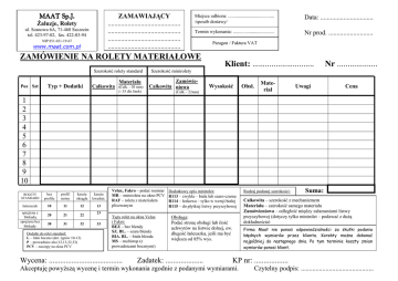 MAAT Sp.J. ZAMAWIAJĄCY ............................................ ............................................ ............................................ ............................................ Żaluzje, Rolety ul. Sosnowa 6A, 71-468 Szczecin tel. 423-97-02, fax. 422-03-94 NIP 851-031-19-67 www.maat.com.pl Miejsce odbioru: ....................................... /sposób dostawy/ Data: ................................ Termin wykonania: ................................... Nr prod. ........................... ZAMÓWIENIE NA ROLETY MATERIAŁOWE Szerokość rolety standard Poz Szt Typ + Dodatki Całkowita Materiału (Całk. - 30 mm) (- 35 dla linek) Paragon / Faktura VAT Klient: ............................. Nr ................... Materiał Cena Szerokość minirolety ZamówieCałkowita niowa Wysokość (Całk. - 22mm) Obsł. Uwagi 1 2 3 4 5 6 7 8 9 10 ROLETY STANDARD bez profilu profil nośny kaseta okrągła kaseta kwadrat. łańcuszek 10 11 12 13 20 21 22 30 31 32 sprężyna z blokadą sprężyna bez blokady Dodatki do rolet standard: L – linki boczne (dot. typów 10-13) P – prowadnice alu (12,13,32,33) PCV – zaczepy na okna PCV Velux, Fakro – podać rozmiar MR – miniroleta na okno PCV RAF – roleta z materiałem plisowanym Dodatkowy opis minirolet: R113 – zwykła – biała lub szaro-czarna R114 – łezkowa – tylko w wersji białej R115 – do płytkiej listwy przyszybowej 23 33 Typy rolet na okna Velux i Fakro: BEZ – bez blendy SZ. BL. – szara blenda BIA. BL. – biała blenda MS – multistop (z prowadnicami bocznymi) Wycena: ....................................... Obsługa: Podać stronę obsługi lub ilość uchwytów na listwie dolnej, ew. długość łańcuszka, jeśli ma być większa od 85% wys. Zadatek: .................... Rodzaj podanej szerokości: Suma: Całkowita – szerokość z mechanizmem Materiału – szerokość samego materiału Zamówieniowa – odległość między załamaniami listwy przyszybowej (dotyczy tylko minirolet – podawać z dużą dokładnością) Firma Maat nie ponosi odpowiedzialności za skutki podania błędnych wymiarów przez klienta. Korekty można dokonać najpóźniej do następnego dnia. Po tym terminie koszty zmian wymiarów ponosi klient. KP nr: .................. Akceptuję powyższą wycenę i termin wykonania zgodnie z podanymi wymiarami. Czytelny podpis: ............................................