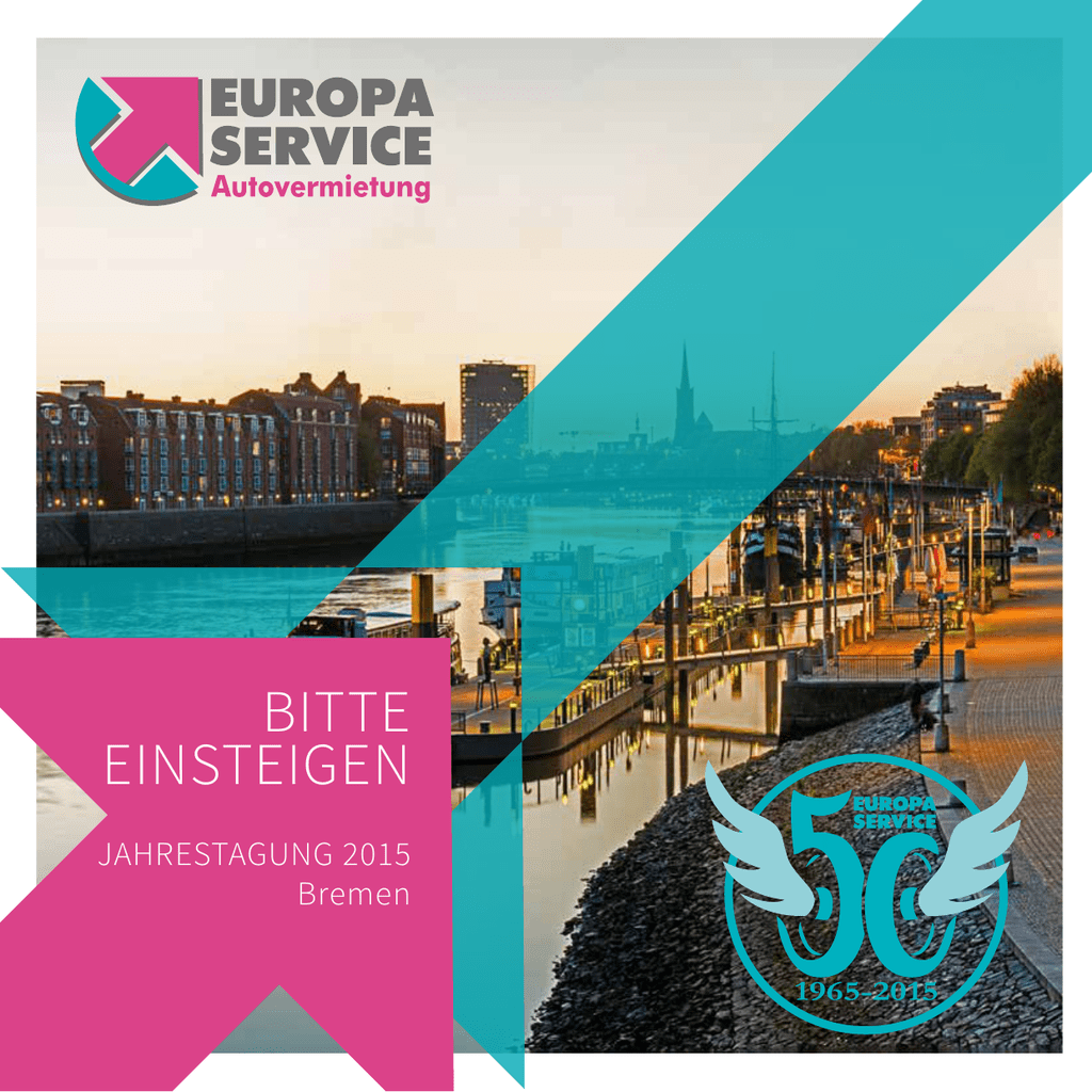 BITTE EINSTEIGEN JAHRESTAGUNG 2015 Bremen 4 50 JAHRE EUROPA SERVICE AUTOVERMIETUNG AG 1965 – vor mittlerweile einem halben Jahrhundert wurde die EUROPA SERVICE Autovermietung AG in Bremen gegründet. Vom 24. bis zum 27. September 2015 haben wir dieses besondere Ereignis dort mit 500 Personen gebührend gefeiert. Wir danken allen Herstellern, Kooperationspartnern, Lizenznehmern, Freunden und Familien für die vier schönen gemeinsamen Tage in Bremen und für die vertrauensvolle und überaus erfolgreiche Zusammenarbeit in den letzten 50 Jahren. Wir freuen uns sehr, auch künftig gemeinsam mit Ihnen partner- und branchenübergreifend die Kompetenzen zu bündeln und mit frischen Ideen die Zeichen auf Erfolg zu setzen. Lassen Sie uns die gemeinsamen Tage noch einmal Revue passieren ... Markus Hoff Vorstand Jens E. Hilgerloh Vorstandsvorsitzender und das gesamte Team der EUROPA SERVICE Autovermietung AG Detlef Kehler Vorstand 6 DONNERSTAG 24.09. 2 0 1 5 17:00 Uhr Welcome im Steigenberger Hotel 19:00 Uhr Gemeinsames Abendessen im Restaurant GOP 21:00 Uhr Varieté-Theater GOP anschl. „Auto-Zeilinger”-Party im ADIAMO Dance Club 1 8 2 1 Manfred & Monika Töller (Autovermietung Töller) 2 Markus Hoff (EUROPA SERVICE) 3 Gert Hilgerloh & Anni Leitner 4 Tom Sterck (Kölner Flitzer Service), Markus Hoff (EUROPA SERVICE), Katja Hauser (ŠKODA AUTO Deutschland) 3 4 1 1 2 3 4 5 2 3 4 Thomas Hillus & Gabriela Kiss (PSA Peugeot Citroën Deutschland) 5 Peter & Brigitte Hauck (MAN Truck & Bus) 6Marcus Hausendorf (Renault Deutschland) & Yvonne Langer-Quandt (EUROPA SERVICE) Anders Hollbrink & Tommy Östlund (MABI) Marius Klosa (GKK Gutachten) Frank & Ingrid Thies 6 1 2 3 4 10 5 1Gertrud Landwehr (Auto Landwehr) 2Gerhard Janssen & Teelke Budde (Autovermietung Herbert Janssen) 3Manfred Twardon & Joachim Streit (Auto-Zeilinger) 4 Kai Hesselbach (XLS) 5 Martin Otto (Volkswagen) 6 Bodo & Kirsten Anneken 7Petra & Klaus Wilmink (Daimler) 6 7 1 4 6 2 3 1Esther Unger & Yvonne Langer-Quandt (EUROPA SERVICE) 2Jochen Welling & Tina Zervas (Commerzbank) 3 Christoph Muhr (Autoverleih Muhr) 4Horst Micket (Kia Motors Deutschland) 5Anette Bülte & Thomas Reichert (Lufthansa AirPlus) 6Ralf Katzur (ehem. Vorstandsmitglied EUROPA SERVICE) & Bernd Adelheim (ALIS Autovermietung Adelheim) 7Dr. Ulrich Götte (Aufsichtsratsmitglied EUROPA SERVICE), Malena & Gesa Marie Götte 7 5 1 2 1Jörn Schmiedehausen & Marietta Chmielewski (Tober Autovermietung) 2Bernd Behrens (Bernd Behrens Automotive Consultant) 3 Dieter & Karin Müller (Merkur Autovermietung) 4Markus Hoff (EUROPA SERVICE), Marius Klosa (GKK Gutachten), Joachim Streit (Auto-Zeilinger), Horst Micket (Kia Motors Deutschland) 5 Frank Zender (KM) 6David Rampone, Maria Rosa Patti, Fausto Sarzi, Irina Kazyk (EUROPA SERVICE Italia) 7 Atilio Marinelli & Christy Caldwell 4 12 5 3 6 7 1 1 Monika & Norbert Schefter (Schefter Autovermietung) 2Willi Schweizer (XXL Autovermietung Schweizer) & Bernd Adelheim (ALIS Autovermietung Adelheim) 3Ralf Katzur (ehem. Vorstandsmitglied EUROPA SERVICE), Sandra & Alessandro Costiera (EUROPA SERVICE Italia) 4Britta Heins, Jens E. Hilgerloh (Vorstandsvorsitzender EUROPA SERVICE), Kirsten Anneken 5Ulrich Stamfus, Bodo Anneken, Klaus Wilmink (Daimler) 6Rainer & Mechthild Pflips (Your Look) 5 2 3 4 6 1 3 14 5 2 1 Prof. Dr. Michael Schreckenberg 2Reiner Bauer, Eugenia Langer, Jens Langer, Claudia Bauer (Langer-Miet-Service) 3Kai Schmedes, Gerda Kohle, Andreas Sudkämper (Die Sparkasse Bremen) 4Patrick Knödler & Michael Borner (Renault Deutschland) 5Heinz Weilnböck (Swing Autovermietung & Leasing), Norbert & Monika Schefter (Schefter Autovermietung), Petra & Joachim Müller (KM) 6Maik & Manuela Grabow (STARCAR) 4 6 1 2 1 Detlef Kelhler (EUROPA SERVICE) & Elke Koch-Kehler 2Bernd Kronwald (First Class Autovermietung), Kurt Boesler (BAV), Gertrud Landwehr (Auto Landwehr) 3 Regina Kronwald, Peter Banderob, Maren Dechow (First Class Autovermietung) 3 5 4Hilde & Helmut Meyer (Autovermietung Auto-Meyer), Anette Bülte & Denis Spiers (Lufthansa AirPlus) 5Norbert & Monika Schefter (Schefter Autovermietung), Karola & Josef Andraschko (Autovermietung Josef Andraschko) 6Jan Ermeling (Atlas Auto-Leasing) & Alexander Mages (Eugen Mages Autovermietung) 4 6 1 2 3 1Silke Götz (Götz), Teelke Budde & Gerhard Janssen (Autovermietung Herbert Janssen), Christian Treber (Schmitz Horn Treber), Marietta Chmielweski (Tober Autovermietung) 2Karin Zeilinger & Elke Twardon (Auto-Zeilinger) 3Heinz Weilnböck (Swing Autovermietung und Leasing), Gillian Habenbacher, Margit Schoch (Swing Autovermietung und Leasing), Helmut Habenbacher 4Miriam, Kerstin, Dirk & Philipp Meyer (Autovermietung Auto-Meyer) 5Martina Bödeker, Inge Stüttgen (Stüttgen & Partner) 4 5 16 1Ralf Bödeker (Aufsichtsratsvorsitzender EUROPA SERVICE), Torsten Horn (Schmitz Horn Treber), Andreas Sudkämper (Die Sparkasse Bremen) 2 Henk (Aufsichtsratsmitglied EUROPA SERVICE) & Lidy Princen 1 2 1 2 1Yvonne Langer-Quandt (EUROPA SERVICE), Frank Zender (KM), Carsten Landwehr & Manuela Ziemons (EUROPA SERVICE) 2Thomas & Lorena Steidl (Mietpark Rent 2000) 3 Auto-Rent Systems 3 18 1 3 1Natalija Cergol & Jürgen Ludwig (Autoverleih Helmut Ludwig) 2Gianluca Fissore, Domenico Francese, Davide Solavagione, Alessandro Costiera (EUROPA SERVICE Italia) 3Michael Borner (Renault Deutschland), Martin Otto (Volkswagen), Katja Hauser (ŠKODA AUTO Deutschland), Kai Hesselbach (XLS), Jens Bahrmann (Volvo Group Trucks Central Europe), Markus Hoff (EUROPA SERVICE), Horst Micket (Kia Motors Deutschland), Thomas Hillus (PSA Peugeot Citroën Deutschland), Patrick Knödler (Renault Deutschland), Jens E. Hilgerloh (EUROPA SERVICE) 2 20 1 2 1Jens Langer, Reiner & Claudia Bauer, Eugenia Langer (Langer-Miet-Service) 2Robert & Katja Lachmann (ABC UNIX RENT), Peter Kuhn (ES Autovermietung München Haaf-Kuhn) 22 24 1 2 5 7 3 1Jens E. Hilgerloh (Vorstandsvorsitzender EUROPA SERVICE) 2Anna Laurentinsson, Stefan Sarin, Anders Hollbrink (MABI) 3Peter Dal