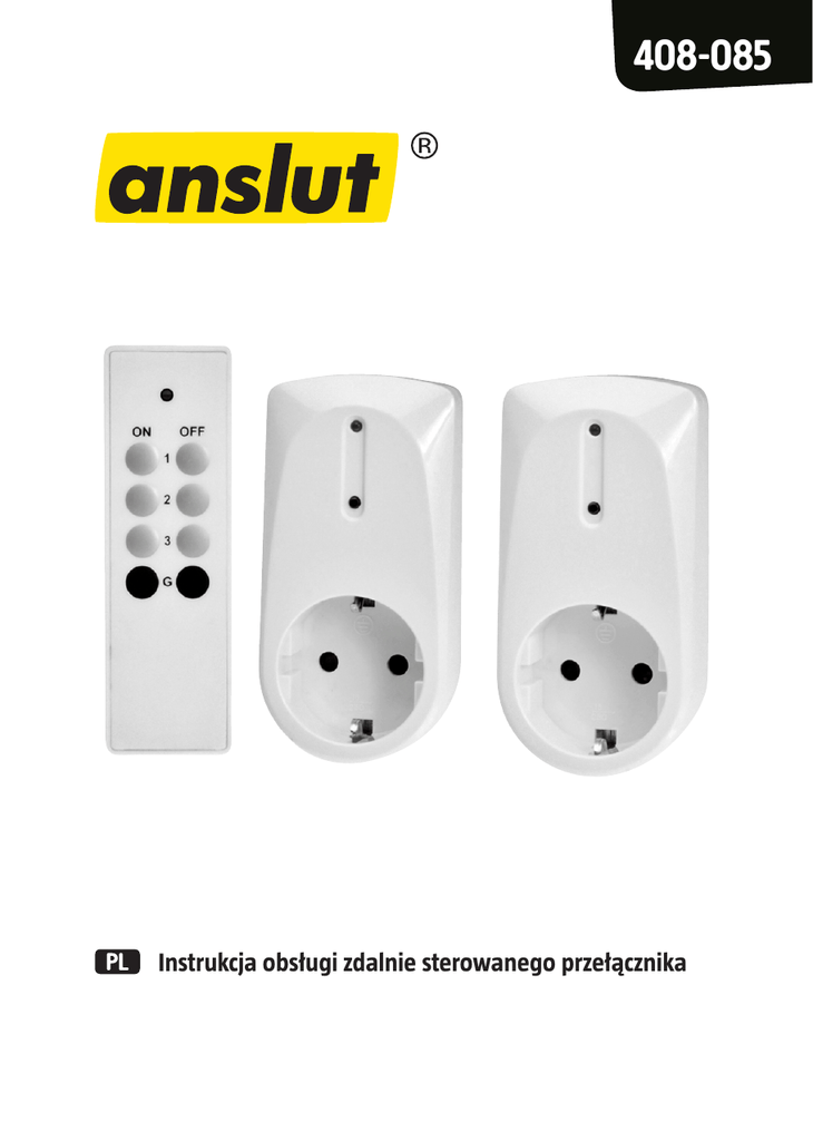408-085 Instrukcja obsługi zdalnie sterowanego przełącznika SE - NO - PL - EN - Bruksanvisning i original Bruksanvisning (Oversettelse av original bruksanvisning) Instrukcja obsługi (Tłumaczenie oryginalnej instrukcji) Operating instructions (Translation of the original instructions) Date of production: 2015-06-18 © Jula AB POLSKI���������������������������������������������������������������������������������������������������������������������� 4 ZASADY BEZPIECZEŃSTWA����������������������������������������������������������������������������������������������������������������������4 DANE TECHNICZNE����������������������������������������������������������������������������������������������������������������������������������4 OBSŁUGA������������������������������������������������������������������������������������������������������������������������������������������������4 SPOSÓB UŻYCIA PILOTA I ZDALNIE STEROWANEGO GNIAZDA Z FUNKCJĄ WŁĄCZANIA/WYŁĄCZANIA����4 INSTALACJA ��������������������������������������������������������������������������������������������������������������������������������������������5 WYKRYWANIE USTEREK������������������������������������������������������������������������������������������������������������������������� 6 PL Instrukcja obsługi zdalnie sterowanego przełącznika POLSKI ZASADY BEZPIECZEŃSTWA Przed użyciem uważnie przeczytaj instrukcję obsługi! Zachowaj ją na przyszłość. • Nie przeciążaj systemu! • Systemu nie należy używać w wilgotnych miejscach, np. na zewnątrz pomieszczeń, w stodołach i piwnicach ani w pobliżu łatwopalnych cieczy, rozpuszczalników, farb i podobnych substancji. DANE TECHNICZNE Napięcie znamionowe 230 V AC/50 Hz Maksymalne obciążenie 1000 W Stopień ochrony IP20 Klasa ochronności I Częstotliwość433,92 MHz Zasięg ok. 30 m (przy braku przeszkód) Temperatura robocza maks. 40°C Bateria pilota 3 V CR2032 OBSŁUGA Funkcje zdalnie sterowanego gniazda • Prosta instalacja bez użycia złączy. • Urządzenie samoprogramujące – 67 milionów kodów. • Dwie konfiguracje pamięci. • Zielona dioda (4) sygnalizuje URUCHOMIENIE i tryb programowania. SPOSÓB UŻYCIA PILOTA I ZDALNIE STEROWANEGO GNIAZDA Z FUNKCJĄ WŁĄCZANIA/WYŁĄCZANIA Pilot ON (1) – odbiornik (Wł.) OFF (2) – wyłączanie (Wył.) GROUP (3) – jednoczesne włączanie lub wyłączanie wszystkich odbiorników. Zapalanie/gaszenie lampy 1. Naciśnij przycisk ON (WŁ.) na pilocie, aby zapalić lampę. 2. Naciśnij przycisk OFF (WYŁ.), aby zgasić lampę. UWAGA! Odbiorniki i pilot nie są fabrycznie zaprogramowane. Aby sterowanie odbiornikami było możliwe, należy je najpierw zsynchronizować z pilotem. 4 PL INSTALACJA Zdalnie sterowane gniazdo 1. Podłącz odbiornik do zasilania. 2. Podłącz lampę (rys. 1) do odbiornika. Pilot • Zasięg pilota wynosi do 30 metrów (przy braku przeszkód). • Ma on trzy kanały i funkcję sterowania grupowego. Synchronizacja pilota i odbiorników 1. Rozpocznij od zaprogramowania pilota do użytku z odbiornikiem. 2. Uruchom odbiornik (rys. 1). 3. Zbliż pilot do odbiornika i wciśnij przycisk programowania (5) na odbiorniku na trzy sekundy (rys. 2), aż dioda na odbiorniku zacznie powoli migać. 4. Naciśnij przycisk ON (WŁ.) na pilocie. 5. Powtórz procedurę, by zaprogramować pozostałe odbiorniki. Usuwanie pojedynczego kodu 1. Wciśnij przycisk programowania na trzy sekundy, aż dioda zacznie powoli migać (rys. 2). 2. Naciśnij przycisk OFF (WYŁ.) na pilocie, a zaprogramowany kod zostanie usunięty. Dwie konfiguracje pamięci odbiornika Samoprogramujący odbiornik ma dwie konfiguracje pamięci. Służą one do programowania wybranych efektów specjalnych. Możliwe jest zaprogramowanie jednorazowego zapalania lub zapalania i gaszenia w różnych kombinacjach. Oznacza to, że w jednym odbiorniku można zaprogramować maksymalnie dwie różne kombinacje. Przykład: przyjmijmy, że mamy trzy odbiorniki, przy czym odbiornik 1 steruje lampą stołową, odbiornik 2 steruje oświetleniem nocnym, a odbiornik 3 oświetleniem sufitowym. • Odbiornikami 1, 2 i 3 można sterować osobno za pomocą przycisków 1, 2 i 3 na pilocie. • Odbiorniki 1 i 3 można zaprogramować przyciskiem 1 na pilocie. Lampa stołowa i oświetlenie sufitowe będą włączane/wyłączane jednocześnie. • Odbiorniki 1, 2 i 3 można także zaprogramować przy użyciu funkcji stero