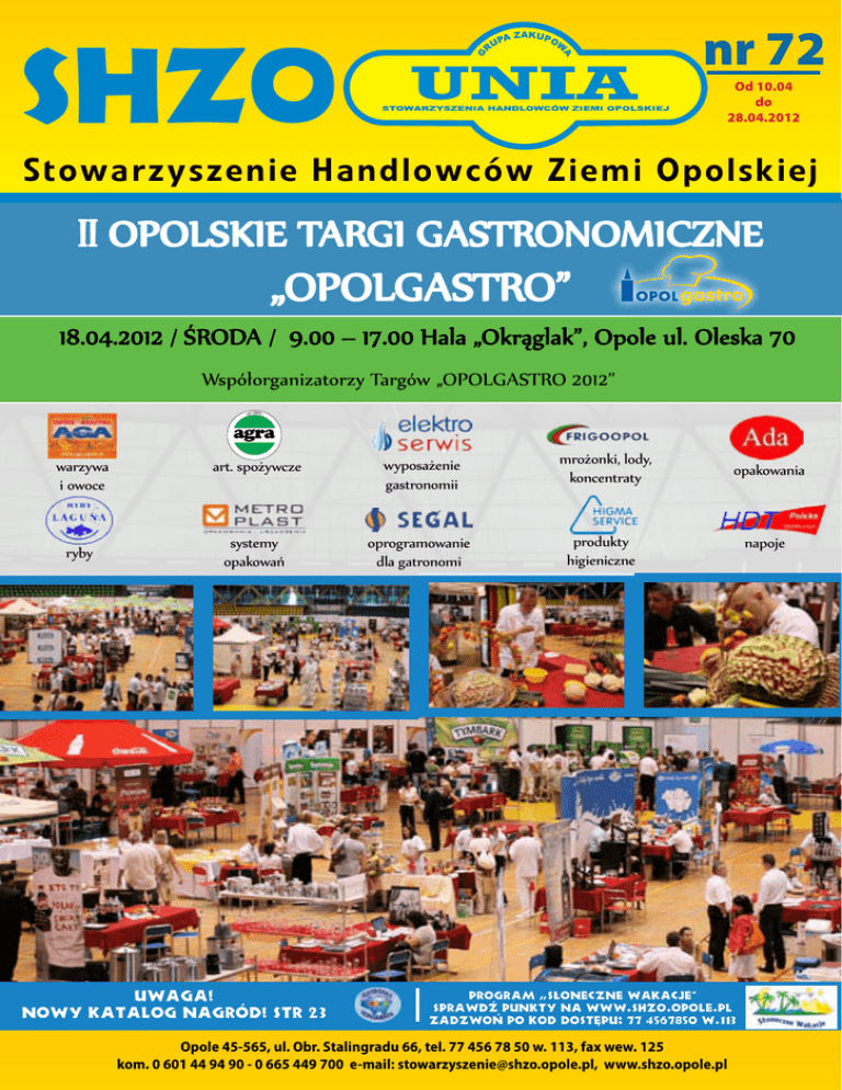 nr 72 SHZO Od 10.04 do 28.04.2012 Stowarzyszenie Handlowców Ziemi Opolskiej II OPOLSKIE TARGI GASTRONOMICZNE „OPOLGASTRO” 18.04.2012 / ŚRODA / 9.00 – 17.00 Hala „Okrąglak”, Opole ul. Oleska 70 Współorganizatorzy Targów „OPOLGASTRO 2012” od 1989r. agra warzywa i owoce ryby art. spożywcze wyposażenie gastronomii mrożonki, lody, koncentraty systemy opakowań oprogramowanie dla gatronomi produkty higieniczne UWAGA! NOWY KATALOG NAGRÓD! str 23 opakowania Program „Słoneczne Wakacje” Sprawdź punkty na www.shzo.opole.pl Zadzwoń po kod dostępu: 77 4567850 w.113 Opole 45-565, ul. Obr. Stalingradu 66, tel. 77 456 78 50 w. 113, fax wew. 125 kom. 0 601 44 94 90 - 0 665 449 700 e-mail: [email protected], www.shzo.opole.pl napoje od 1989r. agra agra oferta ważna 10.04 - 28.04 Agra Opole Telefon: +48 (0-77) 456 78 50, fax: +48 (0-77) 453-05-76 45-565 Opole, ul. Obrońców Stalingradu 66, [email protected], www.agra.opole.pl 6,75* KASZANKA SWOJSKA KRZYŚ POLĘDWICA Z KURCZAK A YANO 9,99* netto PASZTET Z PIECA 17,27* SZ.YNKA Z BECZKI HERMAR ŚĆ ! 9,95* 4,39 zł 4,74 zł BLOK SZYNKOWY * cena netto Przyjmowanie zamówienia tel , fax lub e-mail [email protected] Od godziny 5 rano do godziny 20.30 Tel 71 36 05 600, 71 36 05 601, 71 36 05 602,71 36 05 603, 71 36 05 604, Fax 071 36 05 606 brutto KIEŁBASA OGNISKOWA 10,15* N O WO GERBER 6,75* Budyń czekoladowy, waniliowy, bananowo-czekoladowy, z bananami i sokiem wiśniowym 12x125g Ziemniaczki z gotowana rybka i n pietruszki, Wiosenna zupka z indykiem i koperkiem, Bukiet warzyw z rybką w s pomidorowym, Jarzynki z delikatnym schabem, Tradycyjny schab ze śliwką i warzywami, Delikatny kurczak z ziemniaczkami, Krupniczek z cielęciną, Rosołek z kurczakiem, Pomidorowa z indykiem i ryżem, Domowa zupka kalafiorowa z królikiem, Tradycyjny krupniczek drobiowy, Wołowina po staropolsku z kaszą 12x190g od 1989r. www.agra.opole.pl, Telefon: +48 (0-77) 456 78 50, fax: +48 (0-77) 453-05-76 netto Smakowite jarzynki z cielęcina 12x130g, Rosołek drobiowo - wołowy 12x130g 2,65 zł brutto 3,23 zł 2,45 zł brutto 2,99 zł netto Zamówienia: Bruno-Tassi Sp. z o.o. ul.Wymysłowskiego 4, 55-080 Nowa Wieś Wrocławska Bruno-Tassi Sp. z o.o. oddział Wrocław Tel. 071 36-05-600, 660 540-235 www.brunotassi.pl agra Popc.do mikr.15x100g maślany, solony netto 1,91 zł Napój izotoniczny 750ml cytryna, cytryna-mięta, grejfrut, pomarańcz, wieloowocowy, wiśnia nowo ść! netto Pomidory krojone, całe 425ml netto 2,02 zł 2,18 zł brutto netto 3,34 zł brutto 1,86 zł 3,09 zł netto Seler z porem 370ml Koncentrat barszczu 330ml 1,72 zł brutto 2,43 zł netto Pieczarki marynowane 370ml 2,25 zł brutto 1,97 zł t k p 0 0 0 4 1800 pkt 1,82 zł brutto 3,66 zł brutto Lwów netto 3,39 zł ROLNIK Cho a j c rwa 1,55 zł brutto 1,46 zł netto 1,39 zł brutto Maroko OSHEE t 6500 pk KARO SŁONECZNE WA KACJE 2012 Kukurydza 425ml Mandarynki 314ml Wafel Góralka czekoladowa, Jajko z zabawką Bob Budowniczy, Fiti, kokosowa, mleczna, Tomek i przyjaciele 20g, Charmmy orzechowa 50g Kitty, The Dog 18g 0,63 zł 0,38 zł 0,47 zł netto netto netto 0,51 zł brutto 2,24 zł Zaprawa cytrynowa 1000ml brutto 1,82 zł brutto netto brutto Zaprawa cytrynowa 500ml netto brutto 0,75 zł 2,11 zł Banan, Orange Wafel Attack czekoladowy, miętobaton w czekol. 35*25g wy, orzechowy, mleczny 30g od 1989r. www.agra.opole.pl, Telefon: +48 (0-77) 456 78 50, fax: +48 (0-77) 453-05-76 agra POLONIA IDC 0,61 zł netto Zaprawa cytrynowa 200ml 1,35 zł 1,95 zł brutto 0,85 zł 1,25 zł brutto 0,79 zł netto 100 zł netto = 1 pkt SW 3,60 zł Kart. 1L jablko 100% netto brutto netto brutto netto netto brutto 1,94 zł Tiger 700 ml water energ. Cytryna, klasyczny butelka Kart. 0.2L multiwitamina, jabłko, pomarańcza, wieloowocowy mały Kart. 1L pomarancz clasic, cz.porzeczka 1,58 zł brutto 0,90 zł 2,44 zł 3,08 zł 2,64 zł netto 2,77 zł brutto 3,23 zł Butelka 2L jabłko-białe winogrono, jabłko-brzoskwinia, jabłko-czerwonaporzeczka, jabłko-mieta, jabłko-wiśnia, pomarańcz-brzoskwinia 2,45 zł 2,57 zł netto Makaron 250g Dwupak krajanka x 2 + Kucharek gratis brutto brutto Mąka tortowa puszysta 1kg 3,43 zł 3,35 zł netto netto 2,19 zł brutto 2,09 zł 0,86 zł netto Mąka pełnoziar 3 zboża 1kg netto 3,14 zł brutto 2,99 zł 3,19 zł 1,98 zł Tiger classic 250ml GOLD puszka brutto Mąka Pszenna pełnoziar. 1kg netto 2,82 zł brutto 2,51 zł netto brutto Kakao Puchatek 150g torba 2,39 zł 2,69 zł netto TYM NEXT Ziel herb brzoskw z cytr, Kart. 1L jabłko-brzoskwinia, jabłko-b.winogrono, jabłko-czer.pocytr z limon, żuraw z grej 500ml butel rzeczka, jabłok-mięta, jabłko-wiśnia, pomarańcza-brzoskwinia brutto netto 2,69 zł 2,04 zł brutto 2,19 zł 1,94 zł netto Kakao Puchatek 300g torba Kakao Puchatek 350g tuba netto 3,92 zł 1,83 zł brutto LUBELLA DM Owoce Agrest, porzeczka, skórka pomarańczowa, wiśnia w czekoladzie 80g 3,19 zł brutto netto 6,26 zł netto 3,51 zł 5,09 zł brutto 2,85 zł brutto 1,49 zł MASPEX MOKRY MASPEX SUCHY PROM OCJA 3+1! Kubuś 0,9L b-j-brzoskwinia biały, banan-truskawka, m-j-banan, m-j-brzoskwinia, m-j-malina, m-j-pomarańcza Paluszki 250g JUNIOR Paluszki 200g słone Paluchy 125g Przyprawa do potraw z grilla klasyczna, pikantna, zioło- Przyprawa do karkówki, do żeberek, do wa, do sosu tzatzyki, skrzydełka ogniste, szaszłyki z szaszłyków, grill klasyczny, pikantny, grilla, grzanki złociste 20g, do żeberek barbeque 25g ognisty 20g www.agra.opole.pl, Telefon: +48 (0-77) 456 78 50, fax: +48 (0-77) 453-05-76 www.agra.opole.pl, Telefon: +48 (0-77) 456 78 50, fax: +48 (0-77) 453-05-76 2,95 zł 3,19 zł Przyprawa do grilla klasyczna, pikantna 100g (tuba) od 1989r. agra netto netto netto 0,82 zł brutto 1,59 zł 0,76 zł brutto netto Przyprawa do potraw z grilla klasyczna, pikantna, do karkówki, do szaszłyków 80g (tuba) od 1989r. agra brutto netto netto 1,47 zł brutto 2,45 zł netto 2,40 zł 1,99 zł brutto 3,06 zł netto 1,95 zł brutto 2,4