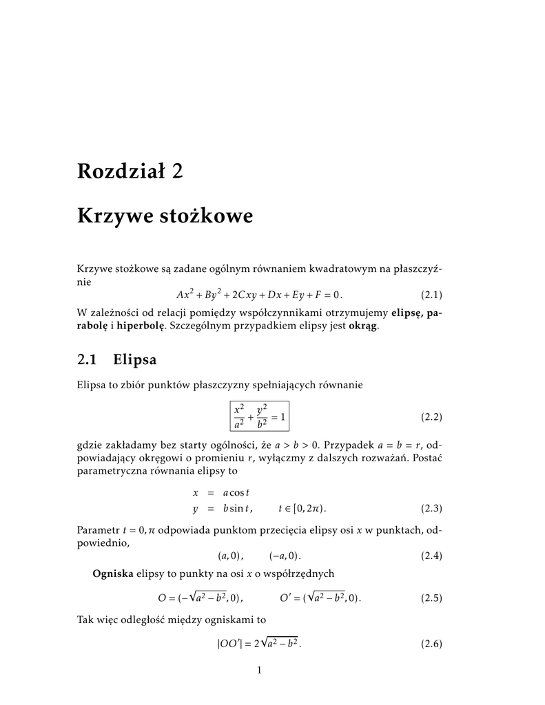 Rozdział 2 Krzywe stożkowe Krzywe stożkowe są zadane ogólnym równaniem kwadratowym na płaszczyźnie Ax2 + By 2 + 2Cxy + Dx + Ey + F = 0 . (2.1) W zależności od relacji pomiędzy współczynnikami otrzymujemy elipsę, parabolę i hiperbolę. Szczególnym przypadkiem elipsy jest okrąg. 2.1 Elipsa Elipsa to zbiór punktów płaszczyzny spełniających równanie x2 y 2 + =1 a2 b2 (2.2) gdzie zakładamy bez starty ogólności, że a > b > 0. Przypadek a = b = r, odpowiadający okręgowi o promieniu r, wyłączmy z dalszych rozważań. Postać parametryczna równania elipsy to x = a cos t y = b sin t , t ∈ [0, 2π) . (2.3) Parametr t = 0, π odpowiada punktom przecięcia elipsy osi x w punktach, odpowiednio, (a, 0) , (−a, 0) . (2.4) Ogniska elipsy to punkty na osi x o współrzędnych √ √ O0 = ( a2 − b2 , 0) . O = (− a2 − b2 , 0) , Tak więc odległość między ogniskami to √ |OO0 | = 2 a2 − b2 . 1 (2.5) (2.6) 6 k k’ 4 A P A’ 2 0 -a O O’ a -2 -4 -6 -8 -6 -4 -2 0 2 4 6 8 Rysunek 2.1: Elipsa o parametrach a = 5, b = 3 i mimośrodzie e = 0.8. Suma odległość dowolnego punktu elipsy P od jej ognisk jest stała i wynosi (patrz Rys. 2.1) |OP | + |O0 P | = 2a . (2.7) Mimośrodem e nazywamy stosunek odległości między ogniskami do odległości między punktami przecięcia elipsy z osia x, co daje √ a2 − b2 |OO0 | = . (2.8) e= 2a a Zauważmy, że e < 1. Ogniska leżą więc wewnątrz elipsy w punktach o współrzędnych O = (−ea, 0) , O0 = (ea, 0) . (2.9) Kierownicą elipsy k sprzężną z ogniskiem O jest prosta równoległa do osi y i przechodząca przez punkt a x=− , (2.10) e natomiast kierownicą k 0 sprzężona z ogniskiem O0 jest prosta a x= . (2.11) e Obie kierownice leżą na zewnątrz elipsy. Odległość ognisk od sprzężnych z nimi kierownic wynosi a b2 d = − ea = √ (2.12) e a2 − b2 2 Wzory (2.8) i (2.12) pozwalają wyliczyć wartości długości półosi elipsy w funkcji parametrów e i d, a= ed , 1 − e2 b= √ ed 1 − e2 . (2.13) Stosunek odległości dowolnego punktu elipsy od ogniska do odległości tego punktu od sprzężonej z ogniskiem kierownicy jest równy mimośrodowi elipsy, |OP | |O0 P | = = e. (2.14) |AP | |A0 P | Ćwiczenie - Udowodnić relacje (2.7) i (2.14) wykorzystując postać parametryczną (2.3) równania paraboli. 2.2 Hiperbola Hiperbola zadana jest równaniem na płaszczyźnie x2 y 2 − =1 a2 b2 Hiperbola ma dwie gałęzie o dodatnich i ujemnych wartościach x, r y2 x = ±a 1 + 2 . b (2.15) (2.16) Obie gałęzie posiadają asymptoty do których dążą gdy x → ±∞, b y = ± x. a (2.17) Postać parametryczna dodatniej gałęzi hiperboli to x = a cosh t y = b sinh t , t ∈ (−∞, ∞) . (2.18) Dla ujemnej gałęzi znak zmiennej x jest przeciwny. Wartość parametru t = 0 odpowiada punktom przecięcia gałęzi hiperboli z osią x o współrzędnych (±a, 0) . (2.19) Ogniska hiperboli to punkty O0 dla gałęzi ujemnej i O dla gałęzi dodatniej o współrzędnych √ √ O0 = (− a2 + b2 , 0) , O = ( a2 + b2 , 0) . (2.20) 3 15 k’ k 10 A P 5 0 -a O’ a O -5 -10 -15 -8 -6 -4 -2 0 2 4 6 8 Rysunek 2.2: Hiperbola o parametrach a = 3, b = 6 i mimośrodzie e = 2.24. Odległość między ogniskami to √ |OO0 | = 2 a2 + b2 . (2.21) Moduł różnicy odległości dowolnego punktu hiperboli P od obu ognisk jest stały i wynosi (patrz Rys. 2.2) |O0 P | − |OP | = 2a . (2.22) Mimośród, zdefiniowany jako stosunek odległości ognisk do odległości między punktami przecięcia gałęzi hiperboli z osią x, wynosi √ |OO0 | a2 + b2 e= = > 1. (2.23) 2a a Podobnie jak dla elipsy ogniska leżą w punktach O0 = (−ea, 0) , O = (ea, 0) . (2.24) Kierownice hiperboli są prostymi równoległymi do osi x, przechodzącymi przez punkt a (2.25) x=± , e 4 gdzie znak (+) odnosi się do kierownicy k sprzężonej z ogniskiem O, natomiast znak (−) do kierownicy k 0 sprzężonej z ogniskiem O0 . Odległość ognisk od sprzężonych co nich kierownic wynosi a b2 d = ea − = √ . e a2 + b2 (2.26) Relacje (2.23) i (2.26) pozwalają wyliczyć parametry a i b hiperboli w funkcji parametrów e i d, ed ed a= 2 , b= √ . (2.27) e −1 e2 − 1 Stosunek odległości dowolnego punktu P dodatniej gałęzi hiperboli od ogniska O do odległości tego punktu od kierownicy k jest stały i równy mimośrodowi hiperboli, |OP | = e. (2.28) |AP | Podobnie dla punktów ujemnej gałęzi, ogniska O0 i kierownicy k 0 . Ćwiczenie - Udowodnić relacje (2.22) i (2.28) wykorzystując postać parametryczną (2.18) równania hiperboli. 2.3 Parabola Równanie paraboli na płaszczyźnie to x = ay 2 a > 0. (2.29) t ∈ (−∞, ∞) . (2.30) Równanie parametryczne to x = at 2 y = t, Ognisko paraboli O leży na osi x i ma współrzędne 1 O= ,0 . 4a (2.31) Kierownica k paraboli to prosta równoległa do osi y o równaniu x=− 1 . 4a (2.32) Odległość ogniska od kierownicy wynosi d= 1 , 2a 5 (2.33) 5 k 4 A P 3 2 1 0 O -1 -2 -3 -4 -5 -5 -4 -3 -2 -1 0 1 2 3 4 5 Rysunek 2.3: Parabola o parametrze a = 1/5. natomiast punkt przecięcia paraboli z osią x znajduje się w połowie odległości między ogniskiem a kierownicą. Zauważmy, że dla d → 0 elipsa staje się coraz szersza, gdyż a → ∞. Dowolny punkt P hiperboli jest równo odległy od ogniska O i kierownicy k (patrz Rys. 2.3), |OP | = 1. (2.34) |AP | Stosunek ten określa też mimośród paraboli, e = 1. Ćwiczenie - Udowodnić relację (2.34) wykorzystując postać parametryczną (2.30) równania paraboli. 2.4 Postać biegunowa krzywych stożkowych Krzywe stożkowe można określić przy pomocy jednego wzoru wprowadzając kierownicę k i ognisko O odległe od kierownicy o odległość d. Krzywą stożkową definiujemy wtedy jako zbiór punktów P płaszczyzny, dla których stosunek odległości od ogniska O do odległości do kierownicy k jest stały i równy 6 5 k 4 A P A P A P 3 2 1 O d 0 e=0.5 -1 -2 e=1 -3 -4 e=2 -5 -1 0 1 2 3 4 5 Rysunek 2.4: Krzywe stożkowe. Zwróć uwagę, że dla wybrany