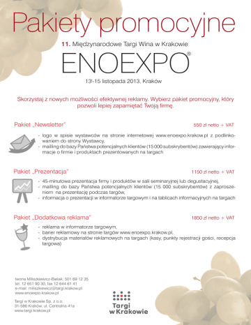 Pakiety promocyjne 11. Międzynarodowe Targi Wina w Krakowie ENOEXPO ® 13t-15 listopada 2013, Kraków Skorzystaj z nowych możliwości efektywnej reklamy. Wybierz pakiet promocyjny, który pozwoli lepiej zapamiętać Twoją firmę. Pakiet „Newsletter” 550 zł netto + VAT - logo w spisie wystawców na stronie internetowej www.enoexpo.krakow.pl z podlinko waniem do strony Wystawcy, - mailling do bazy Państwa potencjalnych klientów (15 000 subskrybentów) zawierający infor macje o firmie i produktach prezentowanych na targach Pakiet „Prezentacja” 1150 zł netto + VAT - 45-minutowa prezentacja firmy i produktów w sali seminaryjnej lub degustacyjnej, - mailling do bazy Państwa potencjalnych klientów (15 000 subskrybentów) z zaprosze niem na prezentację podczas targów, - informacja o prezentacji w informatorze targowym i na tablicach informacyjnych na targach Pakiet „Dodatkowa reklama” 1850 zł netto + VAT - reklama w informatorze targowym, - baner reklamowy na stronie targów www.enoexpo.krakow.pl, - dystrybucja materiałów reklamowych na targach (kasy, punkty rejestracji gości, recepcja targowa) Iwona Miliszkiewicz-Bielak: 501 69 12 35 tel. 12 651 90 30, fax 12 644 61 41 e-mail: [email protected] www.enoexpo.krakow.pl Targi w Krakowie Sp. z o.o. 31-586 Kraków, ul. Centralna 41a www.targi.krakow.pl