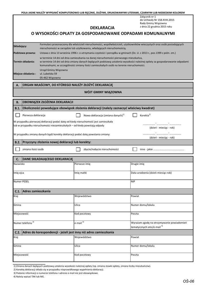 POLA JASNE NALEŻY WYPEŁNIĆ KOMPUTEROWO LUB RĘCZNIE, DUŻYMI, DRUKOWANYMI LITERAMI, CZARNYM LUB NIEBIESKIM KOLOREM Załącznik nr 1 do Uchwały Nr 158.XVIII.2015 Rady Gminy Wiązowna z dnia 22 grudnia 2015 roku DEKLARACJA O WYSOKOŚCI OPŁATY ZA GOSPODAROWANIE ODPADAMI KOMUNALNYMI Składający: Formularz przeznaczony dla właścicieli nieruchomości, współwłaścicieli, użytkowników wieczystych oraz osób posiadających nieruchomości w zarządzie lub użytkowaniu, władających nieruchomością. Podstawa prawna: Ustawa z dnia 13 września 1996 r. o utrzymaniu czystości i porządku w gminach (Dz. U. z 2013 r., poz.1399 z późn. zm.) Termin składania: w terminie 14 dni od dnia zamieszkania na danej nieruchomości pierwszego mieszkańca, w terminie 14 dni od dnia zmiany danych będących podstawą ustalenia wysokości należnej opłaty za gospodarowanie odpadami komunalnymi, w szczególności zmiany ilości zamieszkałych osób na terenie nieruchomości. Miejsce składania : Urząd Gminy Wiązowna ul. Lubelska 59 05-462 Wiązowna A. ORGAN WŁAŚCIWY, DO KTÓREGO NALEŻY ZŁOŻYĆ DEKLARACJĘ WÓJT GMINY WIĄZOWNA B. OBOWIĄZEK ZŁOŻENIA DEKLARACJI B.1. Okoliczności powodujące obowiązek złożenia deklaracji (należy zaznaczyć właściwy kwadrat) Pierwsza deklaracja Nowa deklaracja (zmiana danych) 1) Korekta W przypadku pierwszej deklaracji podać datę od kiedy nieruchomość jest zamieszkała lub w przypadku nieruchomości niezamieszkałych – od kiedy powstają odpady 2) …..…..….....¯……...........¯……………… (dzień - miesiąc - rok) …..…..….....¯……...........¯……………… (dzień - miesiąc - rok) W przypadku zmiany danych bądź korekty deklaracji podać datę powstania zmiany: B.2. Przyczyny złożenia nowej deklaracji lub korekty: zmiana ilości osób C. zbycie/nabycie nieruchomości inne - jakie ……………………………………….. DANE SKŁADAJĄCEGO DEKLARACJĘ Nazwisko Pierwsze imię Drugie imię Imię ojca Imię matki Data urodzenia (dzień-miesiąc-rok) Numer PESEL NIP C.1. Adres zamieszkania Kraj Województwo Powiat Gmina Ulica Numer domu/lokalu Miejscowość Kod pocztowy Poczta Numer telefonu 3) e-mail 3) Wyrażam zgodę na otrzymywanie powiadomień tematycznych sms/e-mail 4) C.2. Adres do korespondencji - jeżeli jest inny niż adres zamieszkania Kraj Województwo Powiat Gmina Ulica Numer domu/lokalu Miejscowość Kod pocztowy Poczta 1) Zmiana danych będących podstawą ustalenia wysokości należnej opłaty (np. zmiana stawki opłaty, zmiana liczby mieszkańców). 2) Korektę deklaracji składa się w przypadku nieprawidłowego wypełnienia deklaracji. 3) Podanie informacji o numerze telefonu i adresie e-mail nie jest obowiązkowe. 4) Należy wpisać TAK lub NIE. OŚ-06 D DANE DOTYCZĄCE NIERUCHOMOŚCI, NA KTÓREJ POWSTAJĄ ODPADY KOMUNALNE D.1. Rodzaj składającego deklarację (należy zaznaczyć właściwy kwadrat) Osoba prawna Osoba fizyczna D.2. Rodzaj własności (należy zaznaczyć właściwy kwadrat) Właściciel Współwłaściciel Inny ………………………………………………………….. D.3. Adres nieruchomości, na której powstają odpady komunalne Miejscowość Ulica Numer domu/lokalu Kod pocztowy Poczta Numer ewidencyjny działki D.4. Rodzaj nieruchomości Nieruchomość, na której znajdują się domki letniskowe, lub inne nieruchomości wykorzystywane na cele rekreacyjno-wypoczynkowe, użytkowane jedynie przez część roku Nieruchomość zamieszkała D.5. Dane dotyczące nieruchomości zamieszkałych Oświadczam, że na terenie nieruchomości wskazanej w części D4 niniejszej deklaracji odpady komunalne będą gromadzone w sposób: (proszę wskazać właściwy kwadrat w poz. 1 lub 2) 1. SELEKTYWNY 2. ZMIESZANY Oświadczam, że na terenie nieruchomości wskazanej w części D4 niniejszej deklaracji zamieszkuje następująca ilość osób: ………………………………………………… (należy podać liczbę mieszkańców) Miesięczna stawka opłaty za gospodarowanie odpadami komunalnymi, określona w uchwale Rady Gminy Wiązowna …………………………………………………………zł/miesiąc Miesięczna kwota opłaty za gospodarowanie odpadami komunalnymi, wynikająca z iloczynu liczby mieszkańców i stawki opłaty, wyrażona w złotych …………………………………………………………zł/miesiąc Dane dotyczące nieruchomości, na której znajdują się domki letniskowe, lub inne nieruchomości wykorzystywane D.6. na cele rekreacyjno-wypoczynkowe, użytkowanych jedynie przez część roku Oświadczam, że na terenie nieruchomości wskazanej w części D4 niniejszej deklaracji odpady komunalne będą gromadzone w sposób: (proszę wskazać właściwy kwadrat w poz. 1 lub 2) 1. SELEKTYWNY 2. ZMIESZANY ………………………………………………… Ilość domków letniskowych, lub innych nieruchomości: (należy podać liczbę domków) Stawka ryczałtowa opłaty za gospodarowanie odpadami komunalnymi, określona w uchwale Rady Gminy Wiązowna ………………………………………………………….……zł/rok Roczny wymiar opłaty wynikający z iloczynu liczby domków letniskowych i stawki ryczałtowej opłaty, wyrażonej w złotych ………………………………………………………….……zł/rok F. INFORMACJA O ZAŁĄCZNIKACH G. PODPIS SKŁADAJĄCEGO DEKLARACJĘ/OSOBY REPREZENTUJĄCEJ SKŁADAJĄCEGO DEKLARACJĘ Oświadczam, że dane wykazane przeze mnie w niniejszym dokumencie zgodne są ze stanem faktycznym. Świadomy/świadoma jestem odpowiedzialności za podanie zeznań niezgodnych z rzeczywistością. Data wypełnienia deklaracji: (dzień - miesiąc - rok) …….…....¯…….......¯……………… H. …………………………………………………………………………………………………. ADNOTACJE URZĘDU Data przyjęcia deklaracji: (dzień - miesiąc - rok