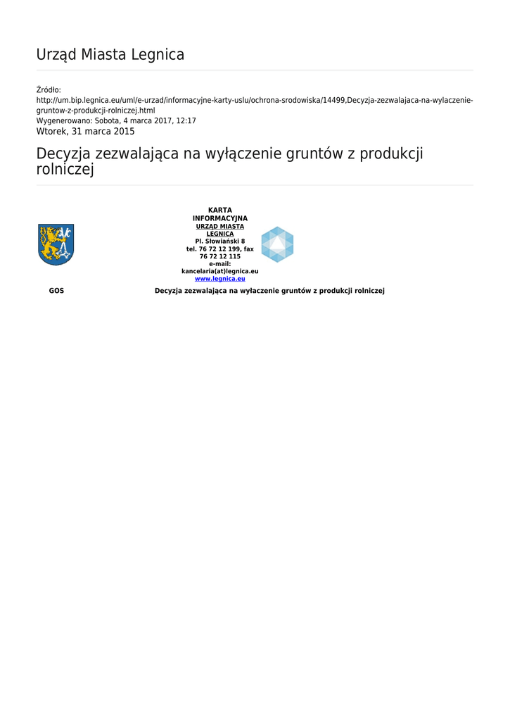 Urząd Miasta Legnica Źródło: http://um.bip.legnica.eu/uml/e-urzad/informacyjne-karty-uslu/ochrona-srodowiska/14499,Decyzja-zezwalajaca-na-wylaczeniegruntow-z-produkcji-rolniczej.html Wygenerowano: Sobota, 4 marca 2017, 12:17 Wtorek, 31 marca 2015 Decyzja zezwalająca na wyłączenie gruntów z produkcji rolniczej KARTA INFORMACYJNA URZĄD MIASTA LEGNICA Pl. Słowiański 8 tel. 76 72 12 199, fax 76 72 12 115 e-mail: kancelaria(at)legnica.eu www.legnica.eu GOS Decyzja zezwalająca na wyłaczenie gruntów z produkcji rolniczej Wymagane dokumenty: Wniosek, który powinien zawierać: • Dane osoby wyłączającej grunty (inwestora), • Powierzchnię gruntów rolnych do wyłączenia w rozbiciu na użytki rolne i klasy bonitacyjne, • Numer działki i obręb geodezyjny, • Cel wyłączenia (rodzaj inwestycji), • Termin wyłączenia gruntów (planowany termin rozpoczęcia inwestycji: miesiąc i rok), • Nazwę miejscowego planu zagospodarowania przestrzennego, zgodnie z którym teren objęty wnioskiem przeznaczony został na cele nierolnicze lub numer i datę decyzji o warunkach zabudowy, • Oświadczenie o wartości rynkowej gruntów objętych wnioskiem, ustalonej w/g cen rynkowych stosowanych w obrocie gruntami lub na podstawie aktu notarialnego lub opinii rzeczoznawcy (należy podać cenę 1 m2).W przypadku budownictwa mieszkaniowego jednorodzinnego oświadczenie jest wymagane wówczas, gdy powierzchnia gruntów wnioskowanych do wyłączenia przekracza 0,05 ha... Do wniosku należy dołączyć: • Wypis i wyrys z miejscowego planu zagospodarowania przestrzennego dla działki objętej wnioskiem lub w przypadku jego braku ostateczną decyzj o warunkach zabudowy i zagospodarowania terenu, • Projekt zagospodarowania działki z wyliczeniem powierzchni do wyłączenia w rozbiciu na użytki rolne i klasy bonitacyjne (sporządzony i podpisany przez architekta). Powierzchnia do wyłączenia powinna tworzyć figurę geometryczną o regularnym kształcie. • Dokument stwierdzający prawo do dysponowania nieruchomością (np. akt notarialny, wypis z ewidencji gruntów, odpis księgi wieczystej itp.), • Dokument określający wartość rynkową gruntu tj. opinia rzeczoznawcy, akt notarialny nabycia gruntu (jeżeli oświadczenie o wartości rynkowej gruntów objętych wnioskiem złożone zostało na podstawie tych dokumentów). Opłaty: Nie pobiera się Miejsce załatwienia sprawy: • Złożenie wniosku w Kancelarii Urzędu Miasta, parter • Odbiór decyzji w pokoju nr 307, tel. 76 72 12 345. Termin załatwienia sprawy Do 30 dni, a sprawy szczególnie skomplikowanej - nie później niż w ciągu dwóch miesięcy. Jednostka odpowiedzialna: Wydział Środowiska i Gospodarowania Odpadami, pokój nr 307, tel. 76 72 12 345. Tryb odwoławczy: Od wydanej decyzji służy stronom prawo wniesienia odwołania do Samorządowego Kolegium Odwoławczego w Legnicy, w terminie 14 dni od daty jej otrzymania. Podstawa prawna: art.11 ust.1 ustawy z dnia 3 lutego 1995 r. o ochronie gruntów rolnych i leśnych (tekst jedn. Dz. U. z 2015 poz.909) Inne informacje: Decyzja zezwalająca na wyłączenie gruntów z produkcji rolniczej dot. użytków rolnych wytworzonych z gleb pochodzenia mineralnego zaliczonych do klas I, II, III, III a, III b oraz użytków rolnych klas IV, IV a, IV b, V i VI wytworzonych z gleb pochodzenia organicznego, przeznaczonych na cele nierolnicze w miejscowych planach zagospodarowania przestrzennego lub w decyzjach o warunkach zabudowy i zagospodarowania terenu. Wyłączenie gruntów może być trwałe i nietrwałe. Wydanie takiej decyzji następuje przed uzyskaniem pozwolenia na budowę/ przyjęciem zgłoszenia robót budowlanych. Wyłączenie gruntów może być trwałe i nietrwałe. W decyzji określa się obowiązki związne z tym wyłączeniem. Osoba, która uzyskała zezwolenie na wyłączenie gruntów z produkcji, jest obowiązana uiścić należność i opłaty roczne. Obowiązek taki powstaje od dnia faktycznego wyłączenia gruntów z produkcji. W przypadku trwałego wyłączenia gruntów z produkcji rolniczej powstaje obowiązek uiszczenia należności oraz opłaty rocznej, która stanowi 10 % należności i uiszczana jest przez okres 10 lat. Należność pomniejsza się o wartość gruntu, ustaloną według cen rynkowych stosowanych w danej miejscowości w obrocie gruntami, w dniu faktycznego wyłączenia tego gruntu z produkcji. Natomiast w przypadku nietrwałego (czasowego) wyłączenie gruntów powstaje obowiązek uiszczenia opłaty rocznej przez okres faktycznego wyłączenia, jednak nie dłużej jak przez okres 20 lat. Obowiązek uiszczenia należności i opłat rocznych nie dotyczy wyłączenia gruntów z produkcji rolniczej na cele budownictwa mieszkaniowego: • do 0,05 ha w przypadku budynku jednorodzinnego • do 0,02 ha, na każdy lokal mieszkalny, w przypadku budynku wielorodzinnego. W decyzji można nałożyć obowiązek zdjęcia oraz wykorzystania na cele poprawy wartości użytkowej gruntów próchnicznej warstwy gleby. Powierzchnia gruntów do wyłączenia jest to teren inwestycji wraz z terenem niezbędnym do jej funkcjonowania. W przypadku budownictwa mieszkaniowego powierzchnia gruntów do wyłączenia stanowi teren zajęty pod budynek mieszkalny, budynek gospodarczy związany funkcjonalnie z budynkiem mieszkalnym oraz urządzenia, a w szczególności podwórza, dojazdy, przejścia, studnie, zbiorniki, urządzenia do gromadzenia i oczyszczania ścieków, śmietniki, ogrodzenia, oczka wodne itp.(za wyjątkiem powierzchni biologicznie czynnej tj. trawniki, rabaty kwietniki i warzywniki, sad) Zezwolenie na wyłączenie gruntu rolnego z produkcji nie skutkuje automatycznie zmianą użytków gruntowych w operacie ewidencji gruntów i budynków. Dopiero rozpoczęcie inwestycji (pierwszy wpis w dzienniku budowy) powoduje faktyczne wyłączanie gruntu rolnego z produkcji oraz konieczność aktualizacji danych dotyczących użytków gruntowych. Aktualizacja taka je