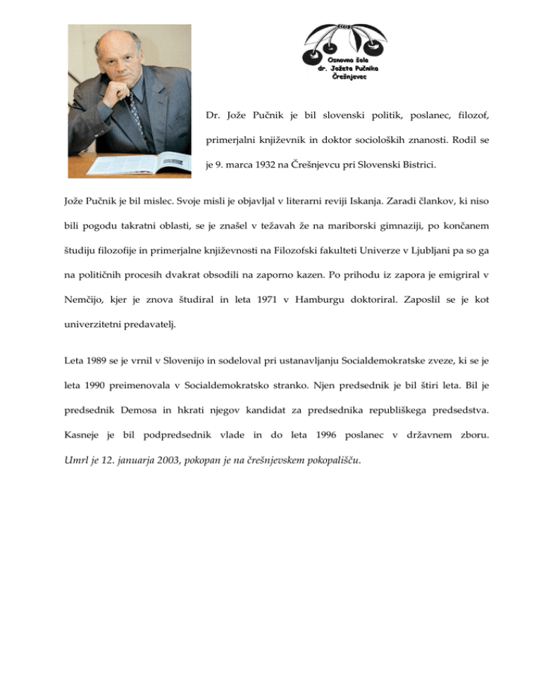 Dr. Jože Pučnik je bil slovenski politik, poslanec, filozof, primerjalni književnik in doktor socioloških znanosti. Rodil se je 9. marca 1932 na Črešnjevcu pri Slovenski Bistrici. Jože Pučnik je bil mislec. Svoje misli je objavljal v literarni reviji Iskanja. Zaradi člankov, ki niso bili pogodu takratni oblasti, se je znašel v težavah že na mariborski gimnaziji, po končanem študiju filozofije in primerjalne književnosti na Filozofski fakulteti Univerze v Ljubljani pa so ga na političnih procesih dvakrat obsodili na zaporno kazen. Po prihodu iz zapora je emigriral v Nemčijo, kjer je znova študiral in leta 1971 v Hamburgu doktoriral. Zaposlil se je kot univerzitetni predavatelj. Leta 1989 se je vrnil v Slovenijo in sodeloval pri ustanavljanju Socialdemokratske zveze, ki se je leta 1990 preimenovala v Socialdemokratsko stranko. Njen predsednik je bil štiri leta. Bil je predsednik Demosa in hkrati njegov kandidat za predsednika republiškega predsedstva. Kasneje je bil podpredsednik vlade in do leta 1996 poslanec v državnem zboru. Umrl je 12. januarja 2003, pokopan je na črešnjevskem pokopališču.
