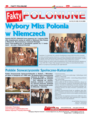 12 FAKTY POLONIJNE 15 kwietnia 2006 www.fakty.biz Wybory Miss Polonia w Niemczech Nr 52 (15-128) 15.IV.2006 O godzinie 15-tej dostojne Jury wybrało 6 kandydatek do finału MISS POLONIA Germany. A wybór nie był łatwy, pytano dosłownie o wszystko. Panie miały okazję zaprezentować nie tylko wdzięk i urodę. Zainteresowania, znajomość języka polskiego, plany na przyszłość - to tylko przykłady pytań, które dawały możliwość zdobycia odpowiedniej ilości punktów. Wyniki castingu juz wkrótce trafią do kandydatek pocztą. Wielki finał natomiast odbędzie się 7 maja 2006 roku w Hagen (http://gsagentur.de/miss-polonia-in-deutschland/index.htm). Bilety na tą imprezę już sprzedają się jak cieple bułeczki! Polskie Stowarzyszenie Społeczno-Kulturalne Cele Stowarzyszenia : - pielęgnacja i rozwój życia społecznego i kulturalnego wśród Polaków w Niemczech, - tworzenie i popieranie polsko – niemieckiego dialogu kulturalnego i społecznego, - udział w życiu interkulturalnym w Niemczech. Kultura polska jest dla nas podstawą zachowania własnej tożsamości indywidualnej i grupowej umożliwiającą jednocześnie właściwy stosunek do niemieckiego otoczenia, poznanie siebie i innych poprzez kulturę i historię obu narodów, polskiego i niemieckiego. Powinna ona służyć otwartości i prawdziwej, twórczej przyjaźni. Działalność Stowarzyszenia bazuje na współpracy jego członków i sympatyków i jest finansowana ze składek członkowskich, datków i ewentualnych dotacji na poszczególne przedsięwzięcia programowe. Stowarzyszenie jest organizacją użyteczności publicznej, niezależną od partii politycznych, grup gospodarczych, organizacji religijnych i interesów indywidualnych. Zarząd Polskiego Stowarzyszenia Społeczno – Kulturalnego w Badenii – Wirtembergii. Kalendarz Polonijny: www.kongres.org/kalendarz.htm Robisz imprezę? Przyślij informacje Polonia.org Świata www.polonia.org www.glos-online.de Instytucje i Organizacje Polonijne Redagują: Zbigniew Kostecki – [email protected], Maciej Budniewski – [email protected], Bogdan Miller – [email protected]