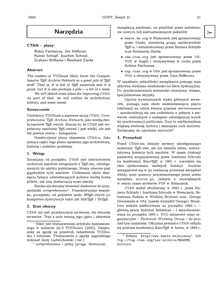 2004 GUST, Zeszyt 21 Narzędzia CTAN – plany∗ Robin Fairbairns, Jim Hefferon, Rainer Schöpf, Joachim Schrod, Graham Williams i Reinhard Zierke Abstract The readers of TUGboat likely know the Comprehensive TEX Archive Network as a great pile of TEX stuff. That is, it is full of TEX materials and it is great, but it is also perhaps a pile — a bit of a mess. We will sketch some plans for improving CTAN. As part of that, we will outline its architecture, history, and some issues. Streszczenie Czytelnicy TUGboat-a zapewne znają CTAN, Comprehensive TEX Archive Network, jako wielką stertę zasobów TEX-owych. Znaczy to, że CTAN jest wypełniony zasobami TEX-owymi i jest wielki, ale jest też pewnie stertą – bałaganem. Naszkicujemy plany ulepszenia CTAN-u. Jako jedną z części tego planu opiszemy jego architekturę, historię i niektóre problemy. 1. Wstęp Zacznijmy od początku: CTAN jest internetowym archiwum zasobów związanych z TEX-em, udostępnionych do użytku publicznego. Mamy obecnie pięć gigabajtów tych zasobów. Codziennie około dziesięciu tysięcy odwiedzających pobiera wielką liczbę plików, zaś inni dostarczają nowe zasoby. Bardzo się staramy stosować dosłownie do przymiotnika comprehensive 1 . Przechowujemy wszystko, począwszy od pakietów makr LATEX-owych po kompletne dystrybucje takie jak MikTEX i TeTEX. 2. Stan obecny CTAN nie jest pojedynczym serwerem, ale zbiorem serwerów. Trzy z nich tworzą jego jądro i aktywnie Tekst jest tłumaczeniem artykułu zamieszczonego w numerze 24/2 TUGboata (2003). Dziękujemy za zgodę na przedruk redaktorom TUGboata i autorom. Tłumaczenia z języka angielskiego dokonał Jerzy Ludwichowski (red.). 1 comprehensive – pełny (przyp. tłumacza). ∗ 31 zarządzają zasobami, na przykład przez instalowanie nowych lub zaktualizowanych pakietów. dante.de.org w Niemczech jest sponsorowany przez Dante, niemiecką grupę użytkowników TEX-a, i administrowany przez Rainera Schöpfa oraz Reinharda Zierke. cam.ctan.org jest sponsorowany przez UKTUG w Anglii i utrzymywany w ruchu przez Robina Fairbainsa. tug.ctan.org w USA jest sponsorowany przez TUG a utrzymywany przez Jima Hefferona. W uzyskaniu jednolitości zarządzania pomaga nam aktywna wymiana wiadomości na liście dyskusyjnej. Do synchronizowania zawartości stosujemy własne, specjalizowane skrypty. Oprócz wymienionych wyżej głównych serwerów, pomaga nam około siedemdziesięciu pięciu lokalizacji na całym świecie poprzez mirrorowanie – synchronizują się one codziennie z jednym z serwerów centralnych a następnie udostępniają wynik tej synchronizacji publicznie. Daje to użytkownikom większą swobodę wyboru i zmniejsza ruch sieciowy. Zachęcamy do używania mirrorów2. 3. Przeszłość Przed CTAN-em istniały serwery udostępniające materiały TEX-owe, ale nie istniała jedna, autorytatywna kolekcja tych zasobów. W czasie dyskusji panelowej zorganizowanej przez Joachima Schroda na konferencji EuroTEX w 1991 r. narodziła się idea zjednoczenia osobnych kolekcji. Joachim zaangażował się w jej realizację ponieważ zarządzał wtedy, przy pomocy przystosowanego przez siebie narzędzia mirror.pl, jednym z największych w owym czasie serwerów FTP w Niemczech. CTAN został zbudowany w 1992 r. przez Rainera Schöpfa i Joachima Schroda w Niemczech, Sebastiana Rahtza w Wielkiej Brytanii oraz George Greenwada w USA (nazwę wymyślił George). Struktura została zdefiniowana na początku 1992 r. – główną pracę wykonał Sebastian – i zsynchronizowana na początku 1993 r. TUG ustanowił ramy organizacyjne – Technical Working Group – do prac nad tym zadaniem. Oficjalna premiera CTAN odbyła się podczas konferencji EuroTEX w Aston, w 1993 r. 2 Zobacz http//www.dante.de/mirmon/ lub ftp://tug.ctan.org/tex-archive/README. mirrors. 32 GUST, Zeszyt 21 Kiedy tworzono CTAN, główną metodą dostępu do jego plików poprzez sieć był FTP. System został więc zbudowany przy założeniu, że odwiedzający będą pobierać zasoby w taki właśnie sposób (być może założono również, że będą to użytkownicy doświadczeni). W roku 1999 na serwerze TUG podjęto próbę zastosowania bardziej rozbudowanego dostępu poprzez WWW, ale pomysł nie został podchwycony przez pozostałe dwa serwery ze względu na jego słabości realizacyjne. 4. Problemy Nikt nie lubi narzekających, ale aby opisać nasze plany musimy opisać problemy, których one dotyczą. Są to problemy zarówno z samą kolekcją jak również z jej zarządzaniem. Jednym z problemów jest to, że kolekcja jest duża. Wyrosła ona ze swojej dotychczasowej struktury, która wymaga zaktualizowania. Większość członków społeczności TEX-owej pewnie zna z własnego doświadczenia sytuację niemożności rozwiązania jakiegoś problemu TEX-owego, po której nastąpiło odkrycie, że rozwiązania istnieje na CTAN-ie. Tak więc stwierdziliśmy, że wraz z naszym rozwojem informacja dostępna dla użytkowników archiwum nie rosła wystarczająco szybko aby byli oni w stanie znajdować to, czego potrzebują. Sytuację złagodziły metadane3 zebrane przez Grahama Williamsa w jego Katalogu (Catalogue)4 . Mimo to musimy stać się informacyjnie bogatsi. Dawny postulat odnośnie kolekcji5 dotyczy utrzymywania przez CTAN historii pakietów w taki sposób, aby użytkownicy mogli kompilować dokumenty, które zależą od ich starszych wersji. W chwili obecnej, jeśli autor dostarczy aktualizację, nadpisujemy nią stary zasób. Inny problem w kategorii nie-pomyśleliśmy-że-urośniemy (lub się-zestarzejemy) dotyczy mirrorów. Dla użytkownika często najlepszym sposobem uzyskania pakietu z CTAN bez pominięcia jakiegoś pliku jest załadowanie całego folderu. Dla ułatwienia takiego podejścia, serwery centralne umożliwiają tworzenie skompresowanych paczek plików .zip i .tar.gz.6 Interfejs WWW 3 4 Dane o danych, czyli dane o pakietach. http://ctan.org/tex-archive/info/ Catalogue. 5 Poc