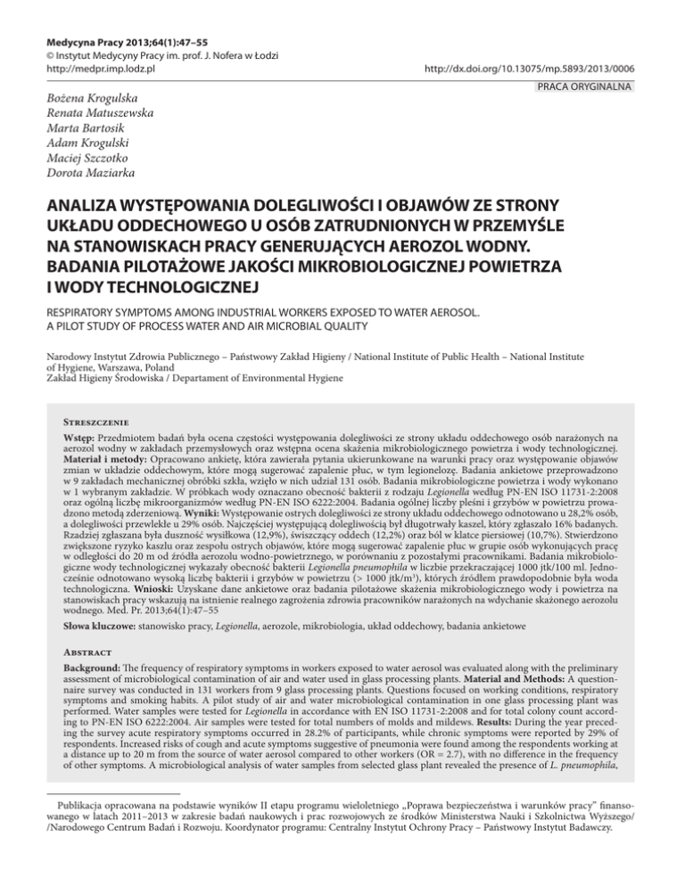 Medycyna Pracy 2013;64(1):47–55 © Instytut Medycyny Pracy im. prof. J. Nofera w Łodzi http://medpr.imp.lodz.pl http://dx.doi.org/10.13075/mp.5893/2013/0006 Bożena Krogulska Renata Matuszewska Marta Bartosik Adam Krogulski Maciej Szczotko Dorota Maziarka PRACA ORYGINALNA ANALIZA WYSTĘPOWANIA DOLEGLIWOŚCI I OBJAWÓW ZE STRONY UKŁADU ODDECHOWEGO U OSÓB ZATRUDNIONYCH W PRZEMYŚLE NA STANOWISKACH PRACY GENERUJĄCYCH AEROZOL WODNY. BADANIA PILOTAŻOWE JAKOŚCI MIKROBIOLOGICZNEJ POWIETRZA I WODY TECHNOLOGICZNEJ RESPIRATORY SYMPTOMS AMONG INDUSTRIAL WORKERS EXPOSED TO WATER AEROSOL. A PILOT STUDY OF PROCESS WATER AND AIR MICROBIAL QUALITY Narodowy Instytut Zdrowia Publicznego – Państwowy Zakład Higieny / National Institute of Public Health – National Institute of Hygiene, Warszawa, Poland Zakład Higieny Środowiska / Departament of Environmental Hygiene Streszczenie Wstęp: Przedmiotem badań była ocena częstości występowania dolegliwości ze strony układu oddechowego osób narażonych na aerozol wodny w zakładach przemysłowych oraz wstępna ocena skażenia mikrobiologicznego powietrza i wody technologicznej. Materiał i metody: Opracowano ankietę, która zawierała pytania ukierunkowane na warunki pracy oraz występowanie objawów zmian w układzie oddechowym, które mogą sugerować zapalenie płuc, w tym legionelozę. Badania ankietowe przeprowadzono w 9 zakładach mechanicznej obróbki szkła, wzięło w nich udział 131 osób. Badania mikrobiologiczne powietrza i wody wykonano w 1 wybranym zakładzie. W próbkach wody oznaczano obecność bakterii z rodzaju Legionella według PN-EN ISO 11731-2:2008 oraz ogólną liczbę mikroorganizmów według PN-EN ISO 6222:2004. Badania ogólnej liczby pleśni i grzybów w powietrzu prowadzono metodą zderzeniową. Wyniki: Występowanie ostrych dolegliwości ze strony układu oddechowego odnotowano u 28,2% osób, a dolegliwości przewlekłe u 29% osób. Najczęściej występującą dolegliwością był długotrwały kaszel, który zgłaszało 16% badanych. Rzadziej zgłaszana była duszność wysiłkowa (12,9%), świszczący oddech (12,2%) oraz ból w klatce piersiowej (10,7%). Stwierdzono zwiększone ryzyko kaszlu oraz zespołu ostrych objawów, które mogą sugerować zapalenie płuc w grupie osób wykonujących pracę w odległości do 20 m od źródła aerozolu wodno-powietrznego, w porównaniu z pozostałymi pracownikami. Badania mikrobiologiczne wody technologicznej wykazały obecność bakterii Legionella pneumophila w liczbie przekraczającej 1000 jtk/100 ml. Jednocześnie odnotowano wysoką liczbę bakterii i grzybów w powietrzu (> 1000 jtk/m3), których źródłem prawdopodobnie była woda technologiczna. Wnioski: Uzyskane dane ankietowe oraz badania pilotażowe skażenia mikrobiologicznego wody i powietrza na stanowiskach pracy wskazują na istnienie realnego zagrożenia zdrowia pracowników narażonych na wdychanie skażonego aerozolu wodnego. Med. Pr. 2013;64(1):47–55 Słowa kluczowe: stanowisko pracy, Legionella, aerozole, mikrobiologia, układ oddechowy, badania ankietowe Abstract Background: The frequency of respiratory symptoms in workers exposed to water aerosol was evaluated along with the preliminary assessment of microbiological contamination of air and water used in glass processing plants. Material and Methods: A questionnaire survey was conducted in 131 workers from 9 glass processing plants. Questions focused on working conditions, respiratory symptoms and smoking habits. A pilot study of air and water microbiological contamination in one glass processing plant was performed. Water samples were tested for Legionella in accordance with EN ISO 11731-2:2008 and for total colony count according to PN-EN ISO 6222:2004. Air samples were tested for total numbers of molds and mildews. Results: During the year preceding the survey acute respiratory symptoms occurred in 28.2% of participants, while chronic symptoms were reported by 29% of respondents. Increased risks of cough and acute symptoms suggestive of pneumonia were found among the respondents working at a distance up to 20 m from the source of water aerosol compared to other workers (OR = 2.7), with no difference in the frequency of other symptoms. A microbiological analysis of water samples from selected glass plant revealed the presence of L. pneumophila, Publikacja opracowana na podstawie wyników II etapu programu wieloletniego „Poprawa bezpieczeństwa i warunków pracy” finansowanego w latach 2011–2013 w zakresie badań naukowych i prac rozwojowych ze środków Ministerstwa Nauki i Szkolnictwa Wyższego/ /Narodowego Centrum Badań i Rozwoju. Koordynator programu: Centralny Instytut Ochrony Pracy – Państwowy Instytut Badawczy. 48 B. Krogulska i wsp. Nr 1 exceeding 1000 cfu/100 ml. The number of bacteria and fungi detected in air samples (above 1000 cfu/m3) suggested that water aerosol at workplaces can be one of the sources of the air microbial contamination. Conclusions: The questionnaire survey revealed an increased risk of cough and acute symptoms suggestive of pneumonia in the group working at a shortest distance form the source of water aerosol. Med Pr 2013;64(1):47–55 Key words: workplace, Legionella, aerosols, microbiology, respiratory system, self report Adres autorów: Narodowy Instytut Zdrowia Publicznego – Państwowy Zakład Higieny, Zakład Higieny Środowiska, ul. Chocimska 24, 01-791 Warszawa, e-mail: [email protected] Nadesłano: 19 października 2012, zatwierdzono: 5 grudnia 2012 WSTĘP Wyniki badań prowadzonych w ostatnich latach w wielu krajach wskazują, że około 87% czasu ludzie przebywają w pomieszczeniach budynków, z czego duża część przypada na czas spędzony w miejscu pracy. Jednym z czynników mogących stwarzać zagrożenie dla zdrowia na stanowiskach pracy są urządzenia wydzielające skażony aerozol wodny do powietrza. Mikroorganizmy występujące naturalnie w powietrzu są w większości nieszkodliw
