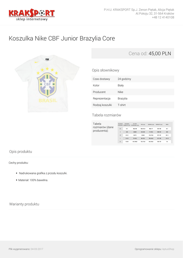 P.H.U. KRAKSPORT Sp.J. Zenon Piętak, Alicja Piętak Al.Pokoju 32, 31-564 Kraków +48 12 4140108 Koszulka Nike CBF Junior Brazylia Core Cena od: 45,00 PLN Opis słownikowy Czas dostawy 24 godziny Kolor Biały Producent Nike Reprezentacja Brazylia Rodzaj koszulki T-shirt Tabela rozmiarów Tabela rozmiarów (dane producenta): Opis produktu Cechy produktu: Nadrukowana grafika z przodu koszulki. Materiał: 100% bawełna. Warianty produktu Plik wygenerowano: 04-03-2017 Oprogramowanie sklepu: AptusShop P.H.U. KRAKSPORT Sp.J. Zenon Piętak, Alicja Piętak Al.Pokoju 32, 31-564 Kraków +48 12 4140108 M Plik wygenerowano: 04-03-2017 Powered by TCPDF (www.tcpdf.org) 45,00 PLN Oprogramowanie sklepu: AptusShop