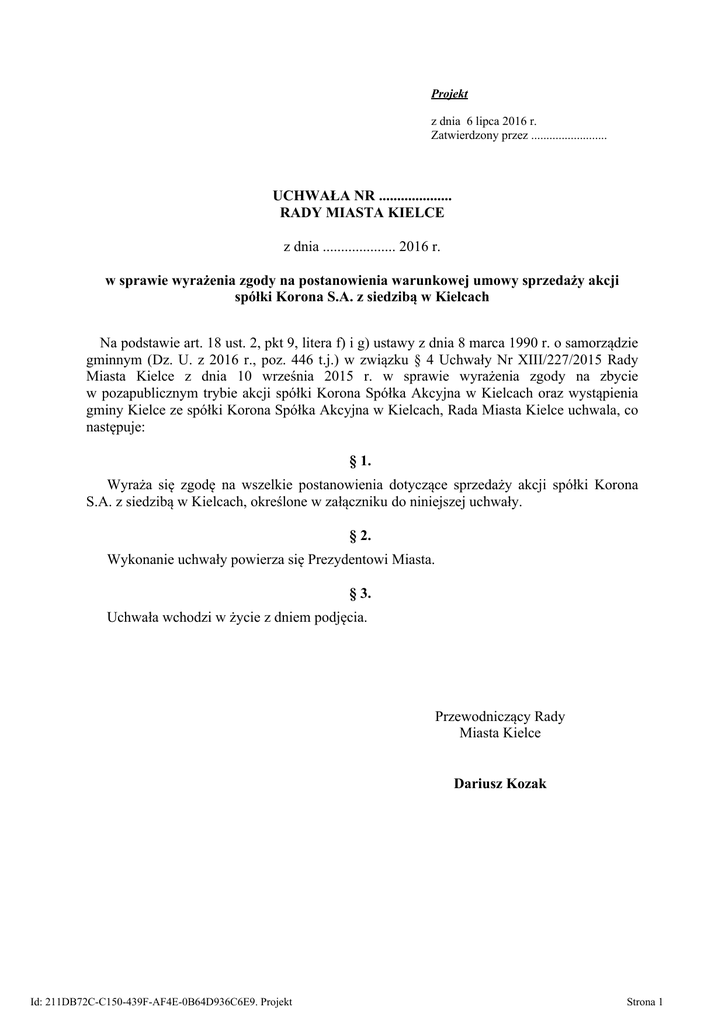 Projekt z dnia 6 lipca 2016 r. Zatwierdzony przez ......................... UCHWAŁA NR .................... RADY MIASTA KIELCE z dnia .................... 2016 r. w sprawie wyrażenia zgody na postanowienia warunkowej umowy sprzedaży akcji spółki Korona S.A. z siedzibą w Kielcach Na podstawie art. 18 ust. 2, pkt 9, litera f) i g) ustawy z dnia 8 marca 1990 r. o samorządzie gminnym (Dz. U. z 2016 r., poz. 446 t.j.) w związku § 4 Uchwały Nr XIII/227/2015 Rady Miasta Kielce z dnia 10 września 2015 r. w sprawie wyrażenia zgody na zbycie w pozapublicznym trybie akcji spółki Korona Spółka Akcyjna w Kielcach oraz wystąpienia gminy Kielce ze spółki Korona Spółka Akcyjna w Kielcach, Rada Miasta Kielce uchwala, co następuje: § 1. Wyraża się zgodę na wszelkie postanowienia dotyczące sprzedaży akcji spółki Korona S.A. z siedzibą w Kielcach, określone w załączniku do niniejszej uchwały. § 2. Wykonanie uchwały powierza się Prezydentowi Miasta. § 3. Uchwała wchodzi w życie z dniem podjęcia. Przewodniczący Rady Miasta Kielce Dariusz Kozak Id: 211DB72C-C150-439F-AF4E-0B64D936C6E9. Projekt Strona 1 UMOWA SPRZEDAŻY - WARUNKOWA akcji spółki Korona S.A. z siedzibą w Kielcach zawarta w dniu ……………………………………… roku w Kielcach pomiędzy: Gminą Kielce, Rynek 1, 25-303 Kielce, NIP: 657-261-73-25, REGON: 291009343, reprezentowaną przez Pana Wojciecha Lubawskiego – Prezydenta Miasta Kielce, zwaną dalej ,,Sprzedającym”, a ………………………………………………………………………………………………………………………………………………., reprezentowanym przez ………………………………………………………………………………………………………... zwanym dalej ,,Kupującym”, łącznie zwanych ,,Stronami”, a każdy z nich z osobna ,,Stroną”. Prezydent Miasta Kielce oświadcza, że działa na podstawie art. 31a ustawy z dnia 30 sierpnia 1996 r. o komercjalizacji i prywatyzacji (Dz.U.2015.747 z późn. zm.) w zw. z art. 12 ust. 3 ustawy z dnia 20 grudnia 1996 r. o gospodarce komunalnej (Dz.U.2016.573 z późn. zm.) oraz na podstawie Uchwały Nr XIII/227/2015 Rady Miasta Kielce z dnia 10 września 2015 r. w sprawie wyrażenia zgody na zbycie w pozapublicznym trybie akcji spółki Korona Spółka Akcyjna w Kielcach oraz wystąpienia gminy Kielce ze spółki Korona Spółka Akcyjna w Kielcach, zmienionej Uchwałą Nr ……… z dnia ……….. Wskazane uchwały stanowią Załączniki nr 4 i 5 do niniejszej umowy. §1 Oświadczenia Stron 1. Sprzedający oświadcza, że: a) jest właścicielem 6 490 000 (sześć milionów czterysta dziewięćdziesiąt tysięcy) akcji zwykłych imiennych o wartości nominalnej 10 zł. (dziesięć złotych) każda, w tym: 50 000 (pięćdziesiąt tysięcy) akcji serii A, 250 000 (dwieście pięćdziesiąt tysięcy) akcji serii B, 500 000 (pięćset tysięcy) akcji serii C, 220 000 (dwieście dwadzieścia tysięcy) akcji serii D, 400 000 (czterysta tysięcy) akcji serii E, 170 000 (sto siedemdziesiąt tysięcy) akcji serii F, 650 000 (sześćset pięćdziesiąt tysięcy) akcji serii G, 430 000 (czterysta trzydzieści tysięcy) akcji serii H, 420 000 (czterysta dwadzieścia tysięcy) akcji serii I, 380 000 (trzysta osiemdziesiąt tysięcy) akcji serii J, 480 000 (czterysta osiemdziesiąt tysięcy) akcji serii K, 320 000 (trzysta dwadzieścia tysięcy) akcji serii L, 500 000 (pięćset tysięcy) akcji serii M, 100 000 (sto tysięcy) akcji serii N, 180 000 (sto osiemdziesiąt tysięcy) akcji serii O, 300 000 (trzysta tysięcy) akcji serii P, 480 000 (czterysta osiemdziesiąt tysięcy) akcji serii R, 280 000 (dwieście osiemdziesiąt tysięcy) akcji serii S, 380 000 (trzysta osiemdziesiąt tysięcy) akcji serii T, które stanowią 100% kapitału zakładowego spółki Korona Spółka Akcyjna w Kielcach, wpisanej do rejestru przedsiębiorców Krajowego Rejestru Sądowego pod numerem 0000163712, dla której akta rejestrowe prowadzi Sąd Rejonowy w Kielcach, X Wydział Gospodarczy Krajowego Rejestru Sądowego, NIP: 9591579998, REGON: 292820120, zwanej dalej ,,Spółką”; 1 Id: 211DB72C-C150-439F-AF4E-0B64D936C6E9. Projekt Strona 2 b) w dniu 10 września 2015 r. Rada Miasta Kielce podjęła uchwałę Nr XIII/227/2015 w sprawie wyrażenia zgody na zbycie w pozapublicznym trybie akcji spółki Korona Spółka Akcyjna w Kielcach oraz wystąpienia gminy Kielce ze spółki Korona Spółka Akcyjna w Kielcach; w dniu ….. Rada Miasta Kielce podjęła uchwałę Nr ……., zmieniającą uchwałę Nr XIII/227/2015 z dnia 10 września; pierwsza z wymienionych uchwał stanowi Załącznik nr 4 do niniejszej umowy, druga z wymienionych uchwał stanowi Załącznik nr 5 do niniejszej umowy; c) w dniu …… Walne Zgromadzenie spółki Korona Spółka Akcyjna w Kielcach podjęło uchwałę w sprawie wyrażenia zgody na zbycie 75% akcji Spółki. Protokół z Walnego Zgromadzenia Spółki stanowi Załącznik nr 6 do niniejszej umowy; d) Korona Kielce Spółka Akcyjna nie została postawiona w stan upadłości, nie jest też prowadzone postępowanie układowe lub likwidacyjne wobec Spółki ani, według najlepszej wiedzy Sprzedającego, nikt nie wystąpił z wnioskiem o ogłoszenie upadłości Spółki. Sprzedający nie jest w posiadaniu informacji na temat jakichkolwiek okoliczności mogących spowodować wszczęcie takich postępowań zaś sytuacja finansowa Spółki nie uzasadnia wszczęcia żadnego z takich postępowań - oświadczenie Zarządu Korona Kielce S.A., stanowiące Załącznik nr 12 do niniejszej umowy; e) nie istnieją ustawowe ani umowne przeszkody w sprzedaży przez Sprzedającego akcji, z zastrzeżeniem §1 ust 2 pkt b) niniejszej umowy. 2. Kupujący oświadcza, że: a) zapoznał się z dokumentacją księgową i finansową Spółki i nie zgłasza do niej żadnych zastrzeżeń, a stan Spółki na dzień zawarcia umowy jest mu znany. W