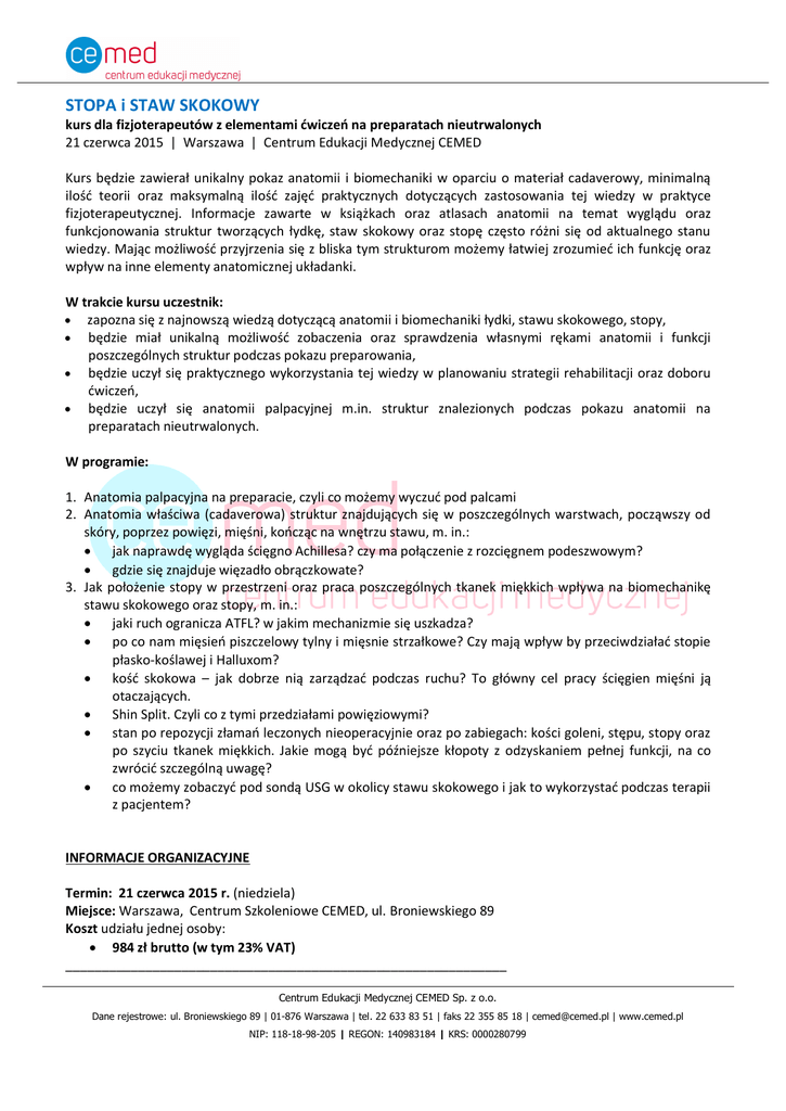 STOPA i STAW SKOKOWY kurs dla fizjoterapeutów z elementami ćwiczeń na preparatach nieutrwalonych 21 czerwca 2015 | Warszawa | Centrum Edukacji Medycznej CEMED Kurs będzie zawierał unikalny pokaz anatomii i biomechaniki w oparciu o materiał cadaverowy, minimalną ilość teorii oraz maksymalną ilość zajęć praktycznych dotyczących zastosowania tej wiedzy w praktyce fizjoterapeutycznej. Informacje zawarte w książkach oraz atlasach anatomii na temat wyglądu oraz funkcjonowania struktur tworzących łydkę, staw skokowy oraz stopę często różni się od aktualnego stanu wiedzy. Mając możliwość przyjrzenia się z bliska tym strukturom możemy łatwiej zrozumieć ich funkcję oraz wpływ na inne elementy anatomicznej układanki. W trakcie kursu uczestnik: zapozna się z najnowszą wiedzą dotyczącą anatomii i biomechaniki łydki, stawu skokowego, stopy, będzie miał unikalną możliwość zobaczenia oraz sprawdzenia własnymi rękami anatomii i funkcji poszczególnych struktur podczas pokazu preparowania, będzie uczył się praktycznego wykorzystania tej wiedzy w planowaniu strategii rehabilitacji oraz doboru ćwiczeń, będzie uczył się anatomii palpacyjnej m.in. struktur znalezionych podczas pokazu anatomii na preparatach nieutrwalonych. W programie: 1. Anatomia palpacyjna na preparacie, czyli co możemy wyczuć pod palcami 2. Anatomia właściwa (cadaverowa) struktur znajdujących się w poszczególnych warstwach, począwszy od skóry, poprzez powięzi, mięśni, kończąc na wnętrzu stawu, m. in.: jak naprawdę wygląda ścięgno Achillesa? czy ma połączenie z rozcięgnem podeszwowym? gdzie się znajduje więzadło obrączkowate? 3. Jak położenie stopy w przestrzeni oraz praca poszczególnych tkanek miękkich wpływa na biomechanikę stawu skokowego oraz stopy, m. in.: jaki ruch ogranicza ATFL? w jakim mechanizmie się uszkadza? po co nam mięsień piszczelowy tylny i mięsnie strzałkowe? Czy mają wpływ by przeciwdziałać stopie płasko-koślawej i Halluxom? kość skokowa – jak dobrze nią zarządzać podczas ruchu? To główny cel pracy ścięgien mięśni ją otaczających. Shin Split. Czyli co z tymi przedziałami powięziowymi? stan po repozycji złamań leczonych nieoperacyjnie oraz po zabiegach: kości goleni, stępu, stopy oraz po szyciu tkanek miękkich. Jakie mogą być późniejsze kłopoty z odzyskaniem pełnej funkcji, na co zwrócić szczególną uwagę? co możemy zobaczyć pod sondą USG w okolicy stawu skokowego i jak to wykorzystać podczas terapii z pacjentem? INFORMACJE ORGANIZACYJNE Termin: 21 czerwca 2015 r. (niedziela) Miejsce: Warszawa, Centrum Szkoleniowe CEMED, ul. Broniewskiego 89 Koszt udziału jednej osoby: 984 zł brutto (w tym 23% VAT) _____________________________________________________________ Centrum Edukacji Medycznej CEMED Sp. z o.o. Dane rejestrowe: ul. Broniewskiego 89 | 01-876 Warszawa | tel. 22 633 83 51 | faks 22 355 85 18 | [email protected] | www.cemed.pl NIP: 118-18-98-205 | REGON: 140983184 | KRS: 0000280799 Zgłoszenia: Warunkiem udziału jest przesłanie wypełnionego formularza zgłoszeniowego: lub elektronicznie: http://www.cemed.pl/spotkania/2015/rehstop/formularz.php Biuro organizacyjne: Centrum Edukacji Medycznej CEMED sp. z o.o. 01-876 Warszawa, ul. Broniewskiego 89 tel. 22 633 83 51 fax 22 355 85 18 e-mail: [email protected] www.cemed.pl Wszelkie informacje można uzyskać pisząc na adres [email protected] lub telefonicznie 506 168 451 Centrum Edukacji Medycznej CEMED Sp. z o.o. Dane rejestrowe: ul. Broniewskiego 89 | 01-876 Warszawa | tel. 22 633 83 51 | faks 22 355 85 18 | [email protected] | www.cemed.pl NIP: 118-18-98-205 | REGON: 140983184 | KRS: 0000280799
