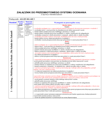 ZAŁĄCZNIK DO PRZEDMIOTOWEGO SYSTEMU OCENIANIA Z JĘZYKA NIEMIECKIEGO Podręcznik: ALLES KLAR 3 1 – Schulalltag ; Mobbing in der Schule ; Die Schule der Zukunft Rozdział Realizo Materiał wane gramatyc • zdania szkoła (np. przedmioty nauczania, oceny i wymagania, śycie szkoły, kształcenie pozaszkolne ); przydawkowe (względne) • zdania przydawkowe (względne) z przyimkami • czas przyszły Futur I Wymagania na poszczególne oceny Bardzo dobry Uczeń : - swobodnie posługuje się w wypowiedziach ustnych i pisemnych słownictwem zawartym w rozdziale 1 - swobodnie mówi , czym powinni się charakteryzować dobry nauczyciel i uczeń - bardzo dobrze podaje przyczyny mobbingu i przemocy w szkole - bardzo dobrze wskazuje przyczyny konfliktów w szkole i moŜliwości ich załagodzenia - swobodnie rozmawia o szkole przyszłości i zmianach , jakich sobie w szkole Ŝyczyłby - swobodnie prowadzi rozmowy sterowane, bezbłędnie pisze list oraz e-mail prywatny - bardzo dobrze tworzy zdania przydawkowe (względne ) - swobodnie wyraŜa przypuszczenia dotyczące przyszłości w czasie przyszłym Futur I. Dobry Uczeń: - dobrze posługuje się w wypowiedziach ustnych i pisemnych słownictwem zawartym w rozdziale 1 - dobrze mówi , czym powinni się charakteryzować dobry nauczyciel i uczeń – - dobrze podaje przyczyny mobbingu i przemocy w szkole - potrafi wskazać przyczyny konfliktów w szkole i moŜliwości ich załagodzenia - dobrze rozmawia o szkole przyszłości i zmianach , jakich sobie w szkole Ŝyczyłby - prowadzi rozmowy sterowane(realizuje trzy podpunkty), dobrze pisze list oraz e-mail prywatny - zna zdania przydawkowe (względne ) - dobrze wyraŜa przypuszczenia dotyczące przyszłości w czasie przyszłym Futur I. Dostateczny - wypowiedź ucznia ustna i pisemna zawiera podstawowy poziom znajomości słownictwa i struktur -uczeń potrafi powiedzieć czym powinni się charakteryzować dobry nauczyciel i uczeń - potrafi podać przyczyny mobbingu i przemocy w szkole - potrafi wskazać co najmniej trzy przyczyny konfliktów w szkole i moŜliwości ich załagodzenia - potrafi rozmawiać o zmianach - co najmniej trzy-, jakich Ŝyczyłby sobie w szkole - częściowo potrafi przeprowadzić rozmowę sterowaną (np. realizuje tylko dwa podpunkty), potrafi napisać list oraz e-mail prywatny - w większości poprawnie zna zdania przydawkowe (względne ) - tworzy bardzo proste przypuszczenia dotyczące przyszłości w czasie przyszłym Futur I. Dopuszczający wypowiedź ustna i pisemna zawiera ubogie słownictwo i bardzo proste struktury językowe pozwalające na przekazanie tylko nielicznych wymaganych informacji, często przy pomocy nauczyciela - uczeń potrafi wymienić niektóre cechy dobrego nauczyciela i ucznia - potrafi podać przyczyny mobbingu -wskazać co najmniej dwie przyczyny konfliktów w szkole i moŜliwości ich załagodzenia -umie podać dwie zmiany jakich Ŝyczyłby sobie w szkole - częściowo potrafi przeprowadzić rozmowę sterowaną (np. realizuje tylko jeden podpunkt), w liscie oraz e-mail prywatnym nie realizuje wszystkich podpunktów - zna zdania przydawkowe (względne ) oraz tworzy bardzo proste przypuszczenia dotyczące przyszłości w czasie przyszłym Futur I tylko przy pomocy nauczyciela Niedostateczny - w wypowiedzi ustnej i pisemnej znajomość słownictwa jest bardzo ograniczona, brakuje płynności wypowiedzi pomimo pomocy nauczyciela - uczeń nie spełnia kryteriów wymienionych na ocenę dopuszczającą praca 2- Traumberufe ; Auf der Arbeitssuche, Sich um eine Stelle bewerben (np. zawody i związane z nimi czynności, warunki pracy i zatrudnienia , praca dorywcza, rynek pracy);); •Przyimki łączace się z dopełniaczem: statt, trotz, während, wegen •Zdania porównawcze ze spójnikami: So..wie, als, je..desto/je.. umso. •Wyrazy przeczace: keinesfalls, nie/niemals, nirgends Bardzo dobry Uczeń : - swobodnie posługuje się w wypowiedziach ustnych i pisemnych słownictwem zawartym w rozdziale 2 - swobodnie mówi o cechach potrzebnych do wykonywania niektórych zawodów - potrafi swobodnie opowiadać o tym, kim chciałby zostać w przyszłości i dlaczego - swobodnie rozmawia na temat typowo męskich i typowo kobiecych zawodów - swobodnie mówi, jakie zawody cieszą się największym powaŜaniem w Niemczech i w Polsce - bardzo dobrze mówi o najskuteczniejszych metodach poszukiwania pracy - bardzo dobrze rozumie ogłoszenia z ofertami pracy - swobodnie prowadzi rozmowę z potencjalnym pracodawcą - swobodnie prowadzi rozmowy sterowane oraz rozmowę na podstawie ilustracji. Pisząc list prywatny, emaila prywatnego oraz list motywacyjny realizuje wszystkie podpunkty. -swobodnie stosuje przyimki łączące się z dopełniaczem: statt, trotz, während i wegen - bardzo dodrze tworzy zdania porównawcze - swobodnie uzywa wyrazów przeczących : keinesfalls, nie/niemals, nirgends Dobry Uczeń: - dobrze posługuje się w wypowiedziach ustnych i pisemnych słownictwem zawartym w rozdziale 2 - dobrze mówi o cechach potrzebnych do wykonywania niektórych zawodów - potrafi opowiadać o tym, kim chciałby zostać w przyszłości i dlaczego - rozmawia o typowo męskich i typowo kobiecych zawodach - potrafi powiedzieć jakie zawody cieszą się największym powaŜaniem w Niemczech i w Polsce - dobrze mówi o najskuteczniejszych metodach poszukiwania pracy - dobrze rozumie ogłoszenia z ofertami pracy - potrafi prowadzić rozmowę z potencjalnym pracodawcą prowadzi rozmowy sterowane (realizuje trzy podpunkty) oraz rozmowę na podstawie ilustracji. Pisząc list prywatny, e-maila prywatnego oraz list motywacyjny realizuje zazwyczaj wszystkie podpunkty. - -dobrze stosuje przyimki łączące się z dopełniaczem: statt, trotz, während i wegen - dodrze tworzy zdania porównawcze - umiejętnie uŜywa wyrazów przeczących : keinesfalls, nie/niemals, nirgends -nieliczne błędy, które mają charakter pomyłek i nie występują systematycznie Dostateczny - wypowied