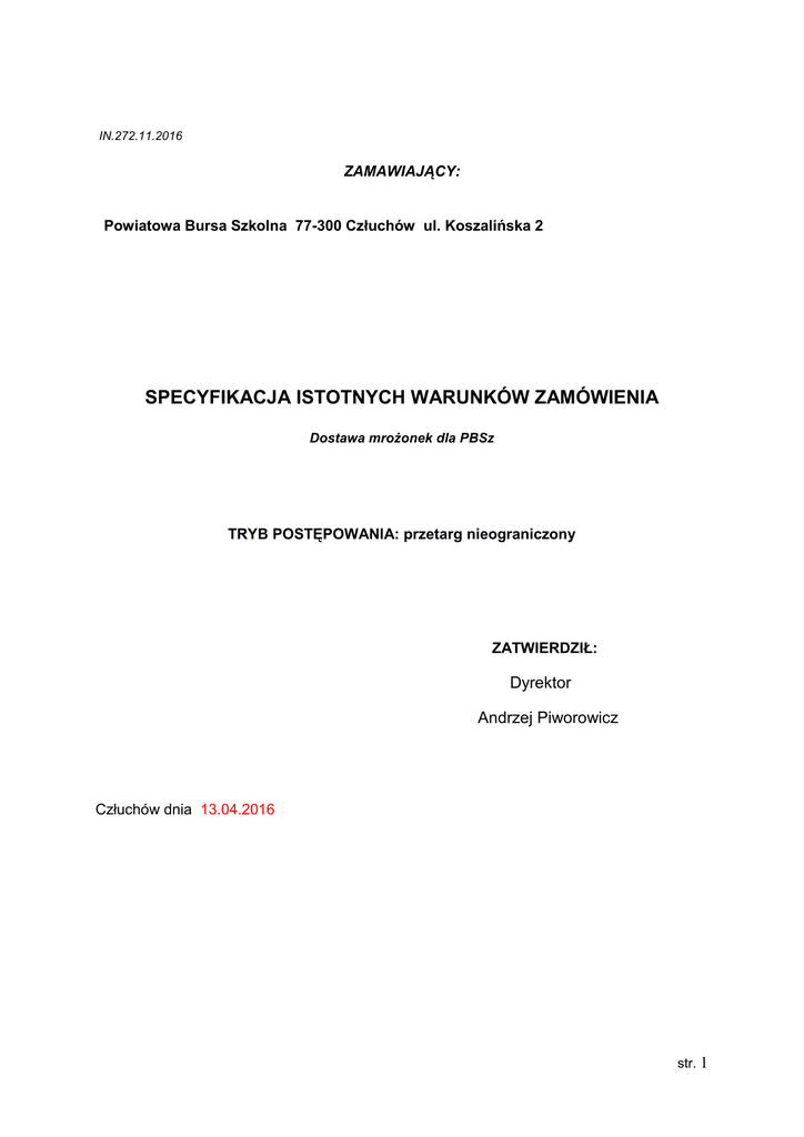 IN.272.11.2016 ZAMAWIAJĄCY: Powiatowa Bursa Szkolna 77-300 Człuchów ul. Koszalińska 2 SPECYFIKACJA ISTOTNYCH WARUNKÓW ZAMÓWIENIA Dostawa mrożonek dla PBSz TRYB POSTĘPOWANIA: przetarg nieograniczony ZATWIERDZIŁ: Dyrektor Andrzej Piworowicz Człuchów dnia 13.04.2016 str. 1 I. Przedmiot zamówienia Dostawa mrożonek dla PBSz II. Tryb udzielenia zamówienia Postępowanie prowadzone jest w trybie przetargu nieograniczonego o wartości szacunkowej poniżej progów określonych w przepisach wydanych na podstawie art. 11 ust. 8 Prawa zamówień publicznych tekst jednolity Dz.U. z dnia 22.12.2015 poz. 2164) Rozporządzenie Prezesa Rady Ministrów z dnia 19 lutego 2013 r. w sprawie rodzajów dokumentów, jakich może żądać zamawiający od wykonawcy oraz form, w jakich te dokumenty mogą być składane Dz. U. z 2013 r. poz. 231 Rozporządzenie Prezesa Rady Ministrów z dnia 31 grudnia 2013 r. w sprawie średniego kursu złotego w stosunku do euro stanowiącego podstawę przeliczania wartości zamówień publicznych (Dz. U. z 2013 r. poz.1692). Kodeks cywilny, Ustawa z dnia 16 kwietnia 1993 r. o zwalczaniu nieuczciwej konkurencji (t. j. Dz. U z, 2003r. Nr 153, poz. 1503 ze zm.). III. Opis przedmiotu zamówienia: 3.1. Przedmiotem zamówienia są sukcesywne dostawy między innymi ryb mrożonych, konserw rybnych, warzyw i owoców mrożonych, lodów, parówek bułek itp. dla Powiatowej Bursy Szkolnej w Człuchowie. Przedmiot zamówienia został określony w załączniku nr 2 do niniejszej siwz. 3.2. Wykonawca może zaproponować produkty o innej nazwie, jednak muszą one spełniać wymogi tej samej lub wyższej jakości. Zamawiający przez określenie „spełnienia wymogów jakości” rozumie artykuły spożywcze zachowujące istotne cechy gwarantujące tożsamość produktu w I gatunku, jego właściwy skład i świeżość, właściwą gramaturę, właściwy termin przydatności do spożycia tp. 3.3. Zamawiający informuje, że przy dostawie przedmiotu zamówienia stosuje prawo opcji, oznacza to, że podane ilości są wielkościami maksymalnymi, które należy wycenić w ofercie cenowej. Zamawiający będzie odbierał przedmiot zamówienia sukcesywnie w miarę potrzeb. Natomiast gwarantowana ilość artykułów, które zostaną odebrane to 60% przedmiotu zamówienia wymienionego w załączniku nr 2 do siwz (Formularz cenowy). Wymagania dotyczące transportu: 1. Wykonawca dostarczy przedmiot zamówienia specjalistycznym transportem przystosowanym do przewozu żywności, zgodnie z obowiązującymi przepisami. 2. Dowóz przedmiotu zamówienia odbędzie się ubezpieczonym transportem Wykonawcy do magazynów odbiorcy: Powiatowa Bursa Szkolna 77-300 Człuchów ul. Koszalińska 2 tel. 59 834 34 92 Zamawiający nie dopuszcza składania ofert częściowych Zamawiający przewiduje możliwości zmian postanowień umowy Zamawiający nie przewiduje możliwości złożenia oferty wariantowej CPV 15220000-6 ryby mrożone, filety rybne i pozostałe mięso z ryb 15200000-0 ryby przetworzone i konserwowane 15311000-1 Ziemniaki mrożone 15331170-9 Warzywa mrożone 15330000-0 Przetworzone owoce i warzywa 15812200-5 Ciasta 15555100-4 Lody 15896000-5 Produkty głęboko mrożone 18937000-6 Torebki do pakowania towarów 60000000-8 Usługi transportowe IV. Termin wykonania zamówienia Dostawy w ciągu 12 miesięcy od daty podpisania umowy. str. 2 V. Opis warunków udziału w postępowaniu oraz opis sposobu dokonywania oceny spełniania tych warunków: 5.1 O udzielenie zamówienia mogą ubiegać się wykonawcy, którzy spełniają warunki udziału w postępowaniu, w szczególności dotyczące: 1) posiadania uprawnień do wykonywania określonej działalności lub czynności, jeżeli przepisy prawa nakładają obowiązek ich posiadania: Zamawiający nie wyznacza szczegółowego warunku w tym zakresie. 2) posiadania wiedzy i doświadczenia: Zamawiający nie wyznacza szczegółowego warunku w tym zakresie. 3) dysponowania odpowiednim potencjałem technicznym oraz osobami zdolnymi do wykonania zamówienia, Potencjał techniczny Zamawiający uzna ten warunek za spełniony, jeżeli Wykonawca wykaże, nie później niż na dzień składania ofert, że dysponuje minimum jednym pojazdem wraz z decyzją administracyjną na środek transportu do przewozu środków spożywczych z Państwowej Powiatowej Inspekcji Sanitarnej na podległym terenie lub decyzją administracyjną wydaną po sierpniu 2006 r. przez Państwową Powiatową Inspekcję Sanitarną na zakład o spełnianiu wymogów higieny w obrocie środkami spożywczymi. Potencjał kadrowy Zamawiający nie wyznacza szczegółowego warunku w tym zakresie 4) sytuacji ekonomicznej i finansowej Zamawiający nie wyznacza szczegółowego warunku w tym zakresie 5.2. Wykonawca może polegać na wiedzy i doświadczeniu, potencjale technicznym, osobach zdolnych do wykonania zamówienia lub zdolnościach finansowych innych podmiotów, niezależnie od charakteru prawnego łączących go z nimi stosunków. Wykonawca w takiej sytuacji zobowiązany jest udowodnić zamawiającemu, iż będzie dysponował zasobami niezbędnymi do realizacji zamówienia, w szczególności przedstawiając w tym celu pisemne zobowiązanie tych podmiotów do oddania mu do dyspozycji niezbędnych zasobów na okres korzystania z nich przy wykonywaniu zamówienia. 5.3. Wykonawcy, którzy nie wykażą spełnienia warunków udziału w postępowaniu podlegać będą wykluczeniu z udziału w postępowaniu. 5.4. Z udziału w niniejszym postępowaniu wyklucza się wykonawców, którzy podlegają wykluczeniu na podstawie art. 24 ust. 1 i 2 Prawa zamówień publicznych. 5.5. Oferta wykonawcy wykluczonego uznana zostanie za odrzuconą. 5.6. Ocena spełnienia wyżej opisanych warunków udziału w postępowaniu dokonywana będzie w oparciu o złożone przez Wykonawcę w niniejszym postępowaniu dokumenty oraz oświadczenia. 5.7. Zamawiający odrzuci ofertę, jeżeli: 1) jest niezgodna z ustawą, 2) jej treść nie odpo