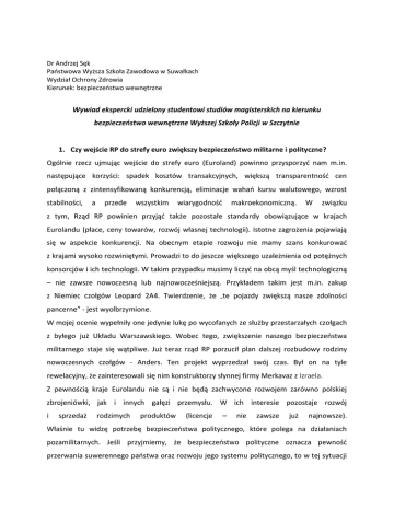 Dr Andrzej Sęk Państwowa Wyższa Szkoła Zawodowa w Suwałkach Wydział Ochrony Zdrowia Kierunek: bezpieczeństwo wewnętrzne Wywiad ekspercki udzielony studentowi studiów magisterskich na kierunku bezpieczeństwo wewnętrzne Wyższej Szkoły Policji w Szczytnie 1. Czy wejście RP do strefy euro zwiększy bezpieczeństwo militarne i polityczne? Ogólnie rzecz ujmując wejście do strefy euro (Euroland) powinno przysporzyć nam m.in. następujące korzyści: spadek kosztów transakcyjnych, większą transparentność cen połączoną z zintensyfikowaną konkurencją, eliminacje wahań kursu walutowego, wzrost stabilności, a przede wszystkim wiarygodność makroekonomiczną. W związku z tym, Rząd RP powinien przyjąć także pozostałe standardy obowiązujące w krajach Eurolandu (płace, ceny towarów, rozwój własnej technologii). Istotne zagrożenia pojawiają się w aspekcie konkurencji. Na obecnym etapie rozwoju nie mamy szans konkurować z krajami wysoko rozwiniętymi. Prowadzi to do jeszcze większego uzależnienia od potężnych konsorcjów i ich technologii. W takim przypadku musimy liczyć na obcą myśl technologiczną – nie zawsze nowoczesną lub najnowocześniejszą. Przykładem takim jest m.in. zakup z Niemiec czołgów Leopard 2A4. Twierdzenie, że „te pojazdy zwiększą nasze zdolności pancerne” - jest wyolbrzymione. W mojej ocenie wypełniły one jedynie lukę po wycofanych ze służby przestarzałych czołgach z byłego już Układu Warszawskiego. Wobec tego, zwiększenie naszego bezpieczeństwa militarnego staje się wątpliwe. Już teraz rząd RP porzucił plan dalszej rozbudowy rodziny nowoczesnych czołgów - Anders. Ten projekt wyprzedzał swój czas. Był on na tyle rewelacyjny, że zainteresowali się nim konstruktorzy słynnej firmy Merkavaz z Izraela. Z pewnością kraje Eurolandu nie są i nie będą zachwycone rozwojem zarówno polskiej zbrojeniówki, jak i innych gałęzi przemysłu. W ich interesie pozostaje rozwój i sprzedaż rodzimych produktów (licencje – nie zawsze już najnowsze). Właśnie tu widzę potrzebę bezpieczeństwa politycznego, które polega na działaniach pozamilitarnych. Jeśli przyjmiemy, że bezpieczeństwo polityczne oznacza pewność przerwania suwerennego państwa oraz rozwoju jego systemu politycznego, to w tej sytuacji potrzebna jest dyplomacja. Chodzi tu przede wszystkim o realizację na arenie międzynarodowej interesów narodowych (prezentacja własnej myśli technologicznej, poszukiwanie rynku zbytu i zawieranie stosownych umów). Ważne w tej kwestii pozostaną słowa Ferdinanda Focha, kiedy to po zakończeniu I Wojny Światowej, powiedział „To nie jest traktat pokojowy, to jest zawieszenie broni na 20 lat” . Więcej światła na bezpieczeństwo polityczne i militarne rzuca interpretacja wojny, która jest aktem przemocy, mającym na celu zmuszenia przeciwnika do spełnienia naszej woli1. Trzeba zauważyć, że wolę silniejszego państwa spełnia słabsze państwo. Nie chodzi tu tylko o wojnę militarną, bo nie powinna ona być traktowana jako czyn polityczny, ale także o konkurencję państw na arenie międzynarodowej. Wysoka samowystarczalność gospodarki państwa (państw), niewielki lub brak współzależności w dziedzinie gospodarczej odgrywa istotną rolę w realizacji celów politycznych. Stąd też państwa często stosują środki dyplomatyczne, a gdy te zawodzą, sięgają po wojsko. Na tym też przykładzie ukazuję wzajemne korelacje między bezpieczeństwem politycznym a militarnym. Reasumując, bezpieczeństwo polityczne i militarne Polski powinno zwiększyć się po uwzględnieniu powyższych rozważań. 2. Czy wejście RP do strefy euro zwiększa zagrożenia bezpieczeństwa politycznego i militarnego ze strony Federacji Rosyjskiej? Proszę uzasadnić. Nie widzę większych zagrożeń ze strony Federacji Rosyjskiej w sytuacji, gdyby Polska weszła do strefy euro. W aspekcie politycznym przyjęcie wspólnej waluty ograniczyłoby zakres instrumentów polityki gospodarczej, którymi moglibyśmy się posługiwać. Polityka pieniężna byłaby prowadzona przez Europejski Bank Centralny wspólnie dla całej strefy euro. Najważniejszym argumentem przemawiającym za tym było to, że wejście do strefy euro zapewniłoby nam dostęp na lepszych warunkach do finansowania wzrostu gospodarczego, czyli kapitału. Zakładając, że z tych powodów Polska szybciej by się rozwijała, mogłaby tym samym stać się m.in. silniejsza politycznie na arenie międzynarodowej. Jej głos byłby mocniejszy w sprawach międzynarodowych, zwiększyłby się jej wpływ na rozstrzyganie wielu spraw nie tylko w Europie, ale i być może w innych częściach świata. Mimo wielu sukcesów na arenie europejskiej, głos Polski nie ma jednak dużego znaczenia. Za przykład można podać 1 C. von Clausewitz. O wojnie, Wydawnictwo Test, Lublin 1995, s. 766. negocjacje pokojowe Rosji i Ukrainy, w których w początkowej fazie uczestniczył między innymi polski minister spraw zagranicznych Radosław Sikorski. Jak wszyscy pamiętamy z ust polskiego ministra padły mocne słowa. Jednak w miarę upływu czasu Polska za sprawą Rosji została „po cichu odsunięta od dalszych rozmów”. Można tu zacząć dyskusję od pytania, które w owym czasie zadawały polskie media: Do rozmowy trzeba czworga? Putin z Poroszenką porozmawia, ale w jakim gronie? Jak wiadomo, rozmowy pokojowe odbyły się bez udziału polskiego przedstawiciela Rządu. Za to, w proces pokojowy włączyli się przedstawiciele europejskich mocarstw: Angela Merkel i Francois Hollande. Może to oznaczać, że niezależnie od tego, czy Polska wejdzie do strefy euro, Rosja będzie miała znaczący wpływ na decyzje podejmowane przez naszych sojuszników. Stąd też, silniejsza Polska stanie się poważnym graczem na arenie międzynarodowej. Nie zawsze położenie geopolityczne będzie nam sprzyjać. Jak już pokazała historia, Polska może stać się „atrakcy