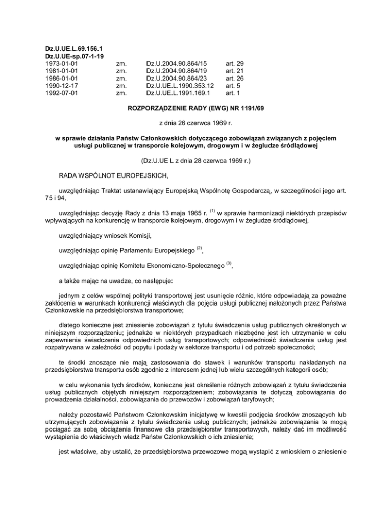 Dz.U.UE.L.69.156.1 Dz.U.UE-sp.07-1-19 1973-01-01 1981-01-01 1986-01-01 1990-12-17 1992-07-01 zm. zm. zm. zm. zm. Dz.U.2004.90.864/15 Dz.U.2004.90.864/19 Dz.U.2004.90.864/23 Dz.U.UE.L.1990.353.12 Dz.U.UE.L.1991.169.1 art. 29 art. 21 art. 26 art. 5 art. 1 ROZPORZĄDZENIE RADY (EWG) NR 1191/69 z dnia 26 czerwca 1969 r. w sprawie działania Państw Członkowskich dotyczącego zobowiązań związanych z pojęciem usługi publicznej w transporcie kolejowym, drogowym i w żegludze śródlądowej (Dz.U.UE L z dnia 28 czerwca 1969 r.) RADA WSPÓLNOT EUROPEJSKICH, uwzględniając Traktat ustanawiający Europejską Wspólnotę Gospodarczą, w szczególności jego art. 75 i 94, (1) uwzględniając decyzję Rady z dnia 13 maja 1965 r. w sprawie harmonizacji niektórych przepisów wpływających na konkurencję w transporcie kolejowym, drogowym i w żegludze śródlądowej, uwzględniający wniosek Komisji, uwzględniając opinię Parlamentu Europejskiego (2) , uwzględniając opinię Komitetu Ekonomiczno-Społecznego (3) , a także mając na uwadze, co następuje: jednym z celów wspólnej polityki transportowej jest usunięcie różnic, które odpowiadają za poważne zakłócenia w warunkach konkurencji właściwych dla pojęcia usługi publicznej nałożonych przez Państwa Członkowskie na przedsiębiorstwa transportowe; dlatego konieczne jest zniesienie zobowiązań z tytułu świadczenia usług publicznych określonych w niniejszym rozporządzeniu; jednakże w niektórych przypadkach niezbędne jest ich utrzymanie w celu zapewnienia świadczenia odpowiednich usług transportowych; odpowiedniość świadczenia usług jest rozpatrywana w zależności od popytu i podaży w sektorze transportu i od potrzeb społeczności; te środki znoszące nie mają zastosowania do stawek i warunków transportu nakładanych na przedsiębiorstwa transportu osób zgodnie z interesem jednej lub wielu szczególnych kategorii osób; w celu wykonania tych środków, konieczne jest określenie różnych zobowiązań z tytułu świadczenia usług publicznych objętych niniejszym rozporządzeniem; zobowiązania te dotyczą zobowiązania do prowadzenia działalności, zobowiązania do przewozów i zobowiązań taryfowych; należy pozostawić Państwom Członkowskim inicjatywę w kwestii podjęcia środków znoszących lub utrzymujących zobowiązania z tytułu świadczenia usług publicznych; jednakże zobowiązania te mogą pociągać za sobą obciążenia finansowe dla przedsiębiorstw transportowych, należy dać im możliwość wystąpienia do właściwych władz Państw Członkowskich o ich zniesienie; jest właściwe, aby ustalić, że przedsiębiorstwa przewozowe mogą wystąpić z wnioskiem o zniesienie zobowiązania z tytułu świadczenia usług publicznych tylko wtedy, gdy te zobowiązania pociągają za sobą niekorzystne skutki gospodarcze, ustalone na postawie wspólnych procedur określonych w niniejszym rozporządzeniu; w celu poprawy standardów działalności, przedsiębiorstwa transportowe powinny mieć możliwość zaproponowania w składanych wnioskach, aby był wykorzystany inny rodzaj transportu bardziej dostosowany do rozpatrywanego ruchu; decydując się na utrzymanie zobowiązania z tytułu świadczenia usług publicznych, właściwe władze Państw Członkowskich muszą być w stanie dołączyć do swojej decyzji warunki poprawiające rentowność danych rodzajów działalności; decydując się na zniesienie zobowiązania z tytułu świadczenia usług publicznych, właściwe władze Państw Członkowskich muszą być w stanie, w celu zapewnienia świadczenia odpowiednich usług transportowych, wprowadzić w to miejsce usługi zastępcze; w celu uwzględnienia interesów wszystkich Państw Członkowskich, należy wprowadzić procedurę wspólnotową stosowana w przypadku gdy zniesienie zobowiązania do prowadzenia działalności lub przewozu mogłoby zakłócić interesy innych Państw Członkowskich; pożądane jest, w celu umożliwienia odpowiedniego przeprowadzania badania wniosków o zniesienie zobowiązania z tytułu świadczenia usług publicznych składanych przez przedsiębiorstwa, ustanowienie terminów zarówno składania wniosków, jak i badania ich przez Państwa Członkowskie; na podstawie art. 5 decyzji Rady z dnia 13 maja 1965 r. w sprawie harmonizacji niektórych przepisów dotyczących konkurencji w transporcie kolejowym, drogowym i śródlądowym, każda podjęta przez właściwe władze decyzja o utrzymaniu zobowiązania z tytułu świadczenia usług publicznych określonego w niniejszym rozporządzeniu pociąga za sobą obowiązek wypłaty rekompensaty wyrównującej obciążenia finansowe nałożone na przedsiębiorstwa transportowe; prawo przedsiębiorstwa transportowego do rekompensaty powstaje w momencie podjęcia decyzji przez Państwo Członkowskie o utrzymaniu zobowiązania z tytułu świadczenia usług publicznych; jednakże, ponieważ budżety przygotowywane są w skali rocznej, takie prawo do rekompensaty nie może powstać w okresie wstępnym obowiązywania rozporządzenia, przed dniem 1 stycznia 1971 r.; przy czym ta data może być odroczona, w przypadku ewentualnego odroczenia terminu na badanie wniosków przedsiębiorstw transportowych; ponadto, art. 6 decyzji Rady z dnia 13 maja 1965 r. w sprawie harmonizacji niektórych przepisów dotyczących konkurencji w transporcie kolejowym, drogowym i śródlądowym zobowiązuje Państwa Członkowskie do rekompensaty za obciążenia finansowe w transporcie osób, wynikające ze stosowania stawek i warunków transportu nałożonych na przedsiębiorstwo w interesie szczególnej grupy osób; prawo do rekompensaty będzie obowiązywać od 1 stycznia 1971 r.; data rozpoczęcia obowiązywania może zostać odroczona o jeden rok, na podstawie procedury wspólnotowej, w przypadku napotkania przez Państwo Członkowskie szczególnych trudności; rekompensata za obciążenia finansowe nakładane na przedsiębiorstwa przewozowe w p