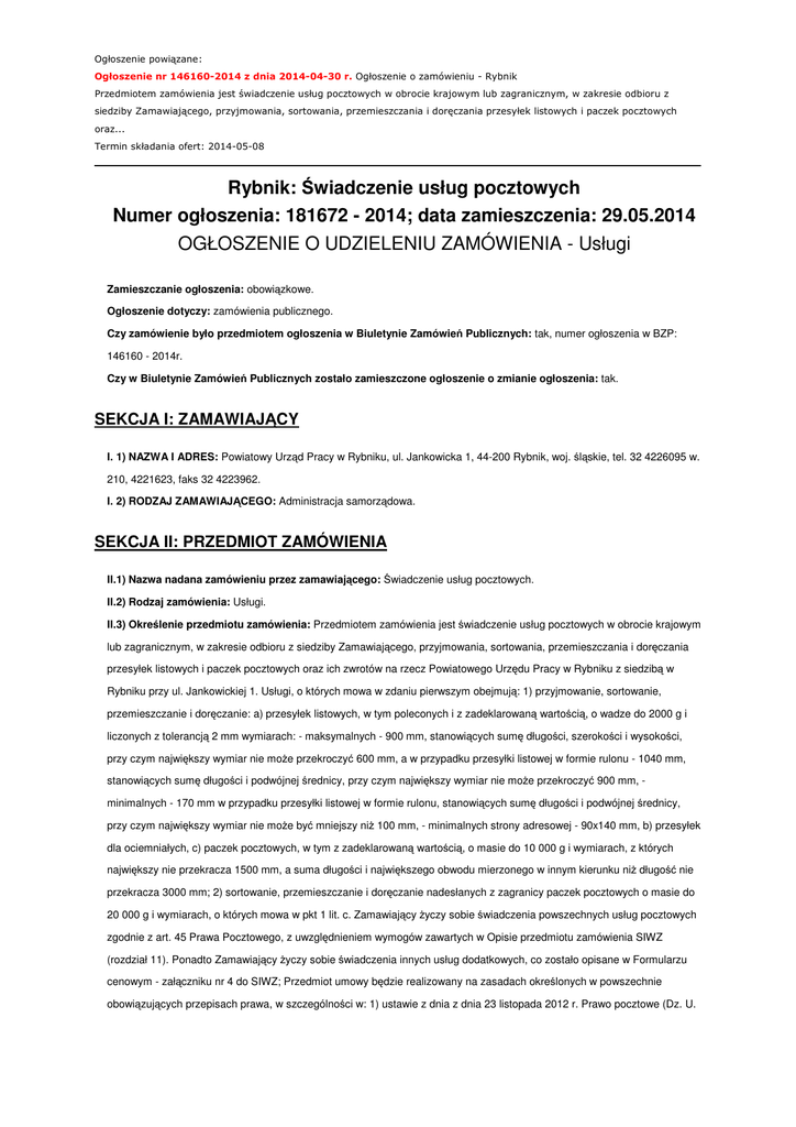 Ogłoszenie powiązane: Ogłoszenie nr 146160-2014 z dnia 2014-04-30 r. Ogłoszenie o zamówieniu - Rybnik Przedmiotem zamówienia jest świadczenie usług pocztowych w obrocie krajowym lub zagranicznym, w zakresie odbioru z siedziby Zamawiającego, przyjmowania, sortowania, przemieszczania i doręczania przesyłek listowych i paczek pocztowych oraz... Termin składania ofert: 2014-05-08 Rybnik: Świadczenie usług pocztowych Numer ogłoszenia: 181672 - 2014; data zamieszczenia: 29.05.2014 OGŁOSZENIE O UDZIELENIU ZAMÓWIENIA - Usługi Zamieszczanie ogłoszenia: obowiązkowe. Ogłoszenie dotyczy: zamówienia publicznego. Czy zamówienie było przedmiotem ogłoszenia w Biuletynie Zamówień Publicznych: tak, numer ogłoszenia w BZP: 146160 - 2014r. Czy w Biuletynie Zamówień Publicznych zostało zamieszczone ogłoszenie o zmianie ogłoszenia: tak. SEKCJA I: ZAMAWIAJĄCY I. 1) NAZWA I ADRES: Powiatowy Urząd Pracy w Rybniku, ul. Jankowicka 1, 44-200 Rybnik, woj. śląskie, tel. 32 4226095 w. 210, 4221623, faks 32 4223962. I. 2) RODZAJ ZAMAWIAJĄCEGO: Administracja samorządowa. SEKCJA II: PRZEDMIOT ZAMÓWIENIA II.1) Nazwa nadana zamówieniu przez zamawiającego: Świadczenie usług pocztowych. II.2) Rodzaj zamówienia: Usługi. II.3) Określenie przedmiotu zamówienia: Przedmiotem zamówienia jest świadczenie usług pocztowych w obrocie krajowym lub zagranicznym, w zakresie odbioru z siedziby Zamawiającego, przyjmowania, sortowania, przemieszczania i doręczania przesyłek listowych i paczek pocztowych oraz ich zwrotów na rzecz Powiatowego Urzędu Pracy w Rybniku z siedzibą w Rybniku przy ul. Jankowickiej 1. Usługi, o których mowa w zdaniu pierwszym obejmują: 1) przyjmowanie, sortowanie, przemieszczanie i doręczanie: a) przesyłek listowych, w tym poleconych i z zadeklarowaną wartością, o wadze do 2000 g i liczonych z tolerancją 2 mm wymiarach: - maksymalnych - 900 mm, stanowiących sumę długości, szerokości i wysokości, przy czym największy wymiar nie może przekroczyć 600 mm, a w przypadku przesyłki listowej w formie rulonu - 1040 mm, stanowiących sumę długości i podwójnej średnicy, przy czym największy wymiar nie może przekroczyć 900 mm, minimalnych - 170 mm w przypadku przesyłki listowej w formie rulonu, stanowiących sumę długości i podwójnej średnicy, przy czym największy wymiar nie może być mniejszy niż 100 mm, - minimalnych strony adresowej - 90x140 mm, b) przesyłek dla ociemniałych, c) paczek pocztowych, w tym z zadeklarowaną wartością, o masie do 10 000 g i wymiarach, z których największy nie przekracza 1500 mm, a suma długości i największego obwodu mierzonego w innym kierunku niż długość nie przekracza 3000 mm; 2) sortowanie, przemieszczanie i doręczanie nadesłanych z zagranicy paczek pocztowych o masie do 20 000 g i wymiarach, o których mowa w pkt 1 lit. c. Zamawiający życzy sobie świadczenia powszechnych usług pocztowych zgodnie z art. 45 Prawa Pocztowego, z uwzględnieniem wymogów zawartych w Opisie przedmiotu zamówienia SIWZ (rozdział 11). Ponadto Zamawiający życzy sobie świadczenia innych usług dodatkowych, co zostało opisane w Formularzu cenowym - załączniku nr 4 do SIWZ; Przedmiot umowy będzie realizowany na zasadach określonych w powszechnie obowiązujących przepisach prawa, w szczególności w: 1) ustawie z dnia z dnia 23 listopada 2012 r. Prawo pocztowe (Dz. U. z 2012 r. poz. 1529); 2) obowiązujących przepisach wykonawczych; 3) międzynarodowych przepisach pocztowych. 19. Szczegółowy opis przedmiotu zamówienia został określony w formularzu cenowym - Załącznik nr 4.. II.4) Wspólny Słownik Zamówień (CPV): 64.11.00.00-0, 64.10.00.00-7, 64.11.20.00-4, 64.11.30.00-1, 64.12.11.00-1. SEKCJA III: PROCEDURA III.1) TRYB UDZIELENIA ZAMÓWIENIA: Przetarg nieograniczony III.2) INFORMACJE ADMINISTRACYJNE Zamówienie dotyczy projektu/programu finansowanego ze środków Unii Europejskiej: nie • SEKCJA IV: UDZIELENIE ZAMÓWIENIA IV.1) DATA UDZIELENIA ZAMÓWIENIA: 28.05.2014. IV.2) LICZBA OTRZYMANYCH OFERT: 1. IV.3) LICZBA ODRZUCONYCH OFERT: 0. IV.4) NAZWA I ADRES WYKONAWCY, KTÓREMU UDZIELONO ZAMÓWIENIA: Poczta Polska S.A., ul. Stawki 2, 00-940 Warszawa, kraj/woj. mazowieckie. • IV.5) Szacunkowa wartość zamówienia (bez VAT): 465000,00 PLN. IV.6) INFORMACJA O CENIE WYBRANEJ OFERTY ORAZ O OFERTACH Z NAJNIŻSZĄ I NAJWYŻSZĄ CENĄ • Cena wybranej oferty: 460204,70 • Oferta z najniższą ceną: 460204,70 / Oferta z najwyższą ceną: 460204,70 • Waluta: PLN.