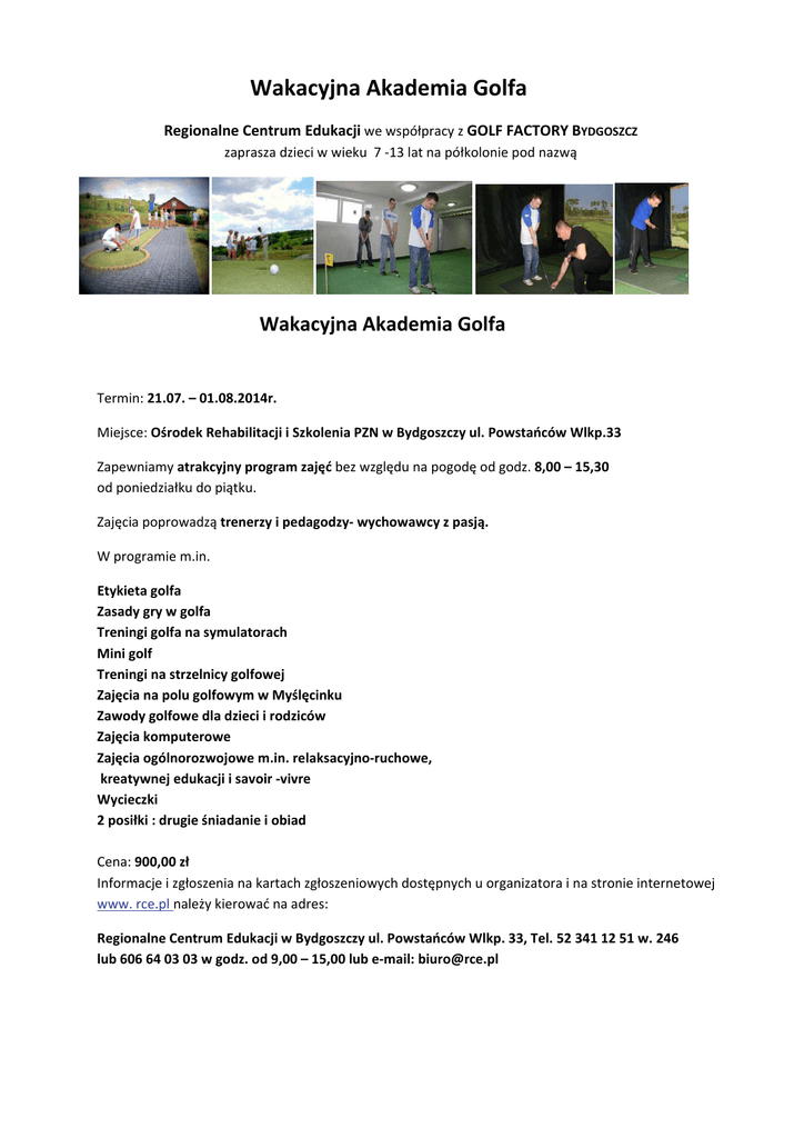 Wakacyjna Akademia Golfa Regionalne Centrum Edukacji we współpracy z GOLF FACTORY BYDGOSZCZ zaprasza dzieci w wieku 7 ‐13 lat na półkolonie pod nazwą Wakacyjna Akademia Golfa Termin: 21.07. – 01.08.2014r. Miejsce: Ośrodek Rehabilitacji i Szkolenia PZN w Bydgoszczy ul. Powstańców Wlkp.33 Zapewniamy atrakcyjny program zajęć bez względu na pogodę od godz. 8,00 – 15,30 od poniedziałku do piątku. Zajęcia poprowadzą trenerzy i pedagodzy‐ wychowawcy z pasją. W programie m.in. Etykieta golfa Zasady gry w golfa Treningi golfa na symulatorach Mini golf Treningi na strzelnicy golfowej Zajęcia na polu golfowym w Myślęcinku Zawody golfowe dla dzieci i rodziców Zajęcia komputerowe Zajęcia ogólnorozwojowe m.in. relaksacyjno‐ruchowe, kreatywnej edukacji i savoir ‐vivre Wycieczki 2 posiłki : drugie śniadanie i obiad Cena: 900,00 zł Informacje i zgłoszenia na kartach zgłoszeniowych dostępnych u organizatora i na stronie internetowej www. rce.pl należy kierować na adres: Regionalne Centrum Edukacji w Bydgoszczy ul. Powstańców Wlkp. 33, Tel. 52 341 12 51 w. 246 lub 606 64 03 03 w godz. od 9,00 – 15,00 lub e‐mail: [email protected] PORADNIK Golf dla najmłodszych – dlaczego dzieci powinny grać w golfa Zastanawiasz się nad lekcjami gry w golfa dla swojej pociechy? Nie zwlekaj. Okazuje się, że golf to nie tylko uderzanie piłeczki kijem, ale także złożony proces kształtowania osobowości młodego gracza. Gra w golfa nie tylko zmusza dziecko do myślenia, ale także uczy podstawowych wartości, jak żaden inny sport – cierpliwości, punktualności, szacunku. Podczas gry w golfa dziecko rozwija się fizycznie, ale także mentalnie – golf to przede wszystkim gra z własną psychiką, która przecież kształtowana jest na długie lata. Co młody gracz zyskuje grając w golfa? Przede wszystkim golf wymaga od gracza grzeczności wobec pozostałych zawodników, jak i komunikowania się z nimi z dużą dozą szacunku. Dziecko podając rękę przeciwnikowi po zakończonej rozgrywce (wymaga tego etykieta młodego gracza) powiela pewne schematy, które pozostawiają ślad w jego kształtującej się psychice. Co więcej, każdy z zawodników biorących udział w turniejach juniorów powinien wykazywać się świadomością sportowej postawy, która przejawia się w grze z poszanowaniem pozostałych graczy. Kolejną lekcją dla młodego człowieka jest punktualność. Jeżeli czas na tee ustalony został na 9:00, gracz powinien tam być już o 8:55. W przypadku choćby najmniejszego spóźnienia, zawodnik jest automatycznie dyskwalifikowany. Wyrobienie w młodym człowieku nawyku bycia na czas, z pewnością przełoży się na inne sfery życia. Istota bezpieczeństwa na polu golfowym, to kolejny element składający się na grę w golfa. Podczas gry zawodnik powinien zachować szczególną ostrożność kierując się bezpieczeństwem swoim oraz pozostałych graczy. Dzięki tej zasadzie, dziecko zyskuje świadomość tego, czym jest bezpieczeństwo i dlaczego odgrywa tak ważną rolę w życiu. Jeżeli nasze dziecko jest nadpobudliwe, a koncentracja nie jest jego mocna stroną, gra w golfa może to zmienić. Golf wymaga od gracza umiejętności koncentracji i wyciszenia, które niezbędne są ku temu, aby osiągnąć dobry wynik na polu golfowym. Jeżeli dziecko regularnie gra w golfa, szybko zauważyć można poprawę również w wynikach szkolnych. Zaradność to cecha, dzięki której dziecko lepiej poradzi sobie w walce z codziennością. Golf zapewni dziecku solidną dawkę główkowania w celu znalezienia odpowiednich rozwiązań, a także nauczy, że z każdej sytuacji jest jakieś wyjście. Deszcz, wiatr, przeszkody wodne czy też drzewa będą służyły tu za wyzwania czyhające na młodego zawodnika także w życiu poza golfem. Każdy zawodnik wie, jak ważna jest pokora podczas gry. W golfie, tak jak i w innych dziedzinach sportu, natychmiastowy sukces zdarza się niezwykle rzadko. Tutaj liczy się regularne ćwiczenie, wytrwałość oraz uważne słuchanie mentora. Niezwykle ważną lekcją dla młodego zawodnika jest uzmysłowienie sobie, że rzadko kiedy można osiągnąć dołek przy pomocy zaledwie jednego uderzenia. Dzięki wytrwałości i zaangażowaniu, dziecko szybko zda sobie sprawę z tego, że jest w stanie pokonać nawet najbardziej wymagającą przeszkodę. Co ciekawe, golf uczy także szacunku dla osób starszych. Po każdej rozgrywce, młodzi gracze powinni podziękować osobie nadzorującej turniej, a w niektórych przypadkach wręczyć jej nawet podziękowania pisemne. Ponadto, gra w golfa przyczynia się również do rozwijania wyobraźni u dziecka , a także zdolności panowania nad własnymi emocjami, czyli mądrości emocjonalnej. Dzięki ogromnej satysfakcji, jaką daje młodemu zawodnikowi gra w golfa, wszystkie procesy związane z kształtowaniem się jego osobowości zachodzą samoistnie. Nie należy jednak spodziewać się cudów już po pierwszych zajęciach. Mimo, że wyrabianie u dziecka pewnych nawyków następuje szybciej niż u osób dorosłych, pełne oswojenie się i zakodowanie podstawowych zasad golfowych wymaga od młodego gracza regularnej gry, zaangażowania oraz samodyscypliny. Źródło: golf-information.info