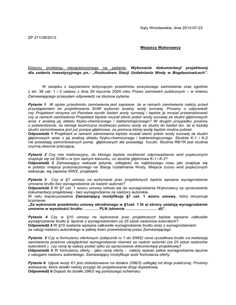 Kąty Wrocławskie, dnia 2013-07-22 ZP 271/38/2013 Wszyscy Wykonawcy Dotyczy przetargu nieograniczonego na zadanie: Wykonanie dokumentacji projektowej dla zadania inwestycyjnego pn.: „Rozbudowa Stacji Uzdatniania Wody w Bogdaszowicach”. W związku z zapytaniami dotyczącym przedmiotu powyższego zamówienia oraz zgodnie z art. 38 ust. 1 i 2 ustawy z dnia 29 stycznia 2004 roku Prawo zamówień publicznych – w imieniu Zamawiającego przesyłam odpowiedź na złożone pytanie. Pytanie 1 W opisie przedmiotu zamówienia jest zapisane, że w ramach zamówienia należy przed przystąpieniem do projektowania SUW wykonać analizy wody surowej. Prosimy o odpowiedź czy Projektant otrzyma od Państwa wyniki badań wody surowej i będzie je musiał przeanalizować czy w ramach zamówienia Projektant będzie musiał zlecić pobór wody surowej ze studni głębinowych wraz z analizą jej składu fizyko-chemicznego i bakteriologicznego? W drugim przypadku prosimy o potwierdzenie, że istnieje techniczna możliwość poboru wody ze studni do badań tzn. że w każdej studni zamontowana jest już pompa głębinowa, za pomocą której wodę będzie można pobrać Odpowiedź 1 Projektant w ramach zamówienia będzie musiał zlecić pobór wody surowej ze studni głębinowych wraz z jej analizą składu fizyko-chemicznego i bakteriologicznego. Studnie K-1 i K-2 nie posiadają zamontowanych pomp głębinowych ale posiadają huczki. Studnia R8/1R jest studnia czynną obecnie pracującą. Pytanie 2 Czy rów melioracyjny, do którego będzie możliwość odprowadzenia wód popłucznych znajduje się od SUW-u w tym samym kierunku, co studnie głębinowe K-1 i K-2? Odpowiedź 2 Zamawiający wskazał jedynie, odległość do najbliższego rowu jaki znajduje się w pobliżu miejsca przeznaczonego na Stację Uzdatniania Wody. Miejsce zrzutu wód popłucznych wskazuje, wg zapisów SIWZ, projektant. Pytanie 3 Czy w §7 umowy na wykonanie prac projektowych będzie wpisane wynagrodzenie umowne brutto bez wynagrodzenia za nadzór autorski? Odpowiedź 3 W §7 ust. 1 wzoru umowy odnosi się do wynagrodzenia Wykonawcy za opracowanie dokumentacji projektowej - bez wynagrodzenia za nadzory autorskie. W celu doprecyzowania Zamawiający modyfikuje §7 ust. 1 wzoru umowy, który otrzymuje brzmienie: „Za wykonanie przedmiotu umowy określonego w §1ust. 1 lit a) strony ustalają wynagrodzenie umowne w wysokości brutto: ……….. PLN (słownie …………………… zł)”. Pytanie 4 Czy w §10 umowy na wykonanie prac projektowych będzie wpisane całkowite wynagrodzenie brutto tj. łącznie z wynagrodzeniem za 25 sztuk nadzorów autorskich? Odpowiedź 4 W §10 zostanie wpisane całkowite wynagrodzenie brutto wraz z wynagrodzeniem za usługi nadzoru autorskiego w pełnej ilości przewidzianej przez Zamawiającego Pytanie 5 Czy w formularzu ofertowym (załącznik nr 1 do SIWZ) cena ryczałtowa brutto za realizację zamówienia powinna uwzględniać wynagrodzenie również za nadzór autorski (za 25 sztuk nadzorów autorskich ), czy cenę tę należy podać tylko za opracowanie dokumentacji projektowej? Odpowiedź 5 W formularzu oferty - jako cenę oferty - należy wpisać pełne wynagrodzenie łącznie z usługami nadzoru autorskiego. Zamawiający modyfikuje wzór formularza oferty. Pytanie 6 Ujęcie wody K1 jest zlokalizowane na działce (296/2) odległej od drogi publicznej. Prosimy wskazanie, które działki należy przyjąć do projektowania drogi dojazdowej. Odpowiedź 6 Dojazd do działki 296/2 wg poniższego schematu: Dz. nr 296/2 własność: Gmina Kąty Wr Dz. nr 293/2 własność: Gmina Miejska Wrocław Dz nr 530 własność: Gmina Kąty Wr Dz nr 516 Droga powiatowa Pytanie 7 W zakres projektu wchodzi wykonanie analiz wody z dwóch ujęć. Kto ponosi koszty pompowania próbnego potrzebnego do poboru próbek wody? Odpowiedź 7 Projektant w ramach zamówienia będzie musiał zlecić pobór wody surowej ze studni głębinowych wraz z jej analizą składu fizyko-chemicznego i bakteriologicznego. Studnie K-1 i K-2 nie posiadają zamontowanych pomp głębinowych ale posiadają huczki. Studnia R8/1R jest studnia czynną obecnie pracującą. Pytanie 8 Z dokumentacji hydrogeologicznej wynika, że woda pobrana z ujęć po pompowaniu próbnym zawierała ponadnormatywną ilość bakterii z grupy coli. Jeśli skażenie zostanie wykazane również w analizach wody objętych zakresem projektu to: a) czy Inwestor usunie skażenie bakteriologiczne ujęć? b) co Inwestor zamierza zrobić, jeśli skażenie okaże się nieprzemijające? Odpowiedź 8 W przypadku potwierdzenia w analizach wody surowej ponadnormatywnego skażenia bakteriologicznego ujmowanej wody, Projektant powinien przewidzieć oczyszczenie i zachlorowanie otworów K-1 i K-2 W przypadku, jeżeli skażenie okaże się nieprzemijające, należy tak dobrać technologię oczyszczania ujmowanej wody, aby uzdatniona woda była przydatna do spożycia przez ludzi