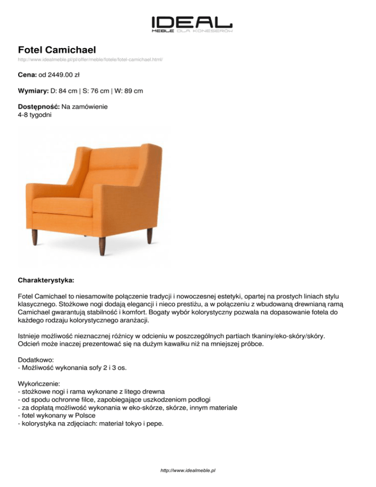 Fotel Camichael http://www.idealmeble.pl/pl/offer/meble/fotele/fotel-camichael.html/ Cena: od 2449.00 zł Wymiary: D: 84 cm | S: 76 cm | W: 89 cm Dostępność: Na zamówienie 4-8 tygodni Charakterystyka: Fotel Camichael to niesamowite połączenie tradycji i nowoczesnej estetyki, opartej na prostych liniach stylu klasycznego. Stożkowe nogi dodają elegancji i nieco prestiżu, a w połączeniu z wbudowaną drewnianą ramą Camichael gwarantują stabilność i komfort. Bogaty wybór kolorystyczny pozwala na dopasowanie fotela do każdego rodzaju kolorystycznego aranżacji. Istnieje możliwość nieznacznej różnicy w odcieniu w poszczególnych partiach tkaniny/eko-skóry/skóry. Odcień może inaczej prezentować się na dużym kawałku niż na mniejszej próbce. Dodatkowo: - Możliwość wykonania sofy 2 i 3 os. Wykończenie: - stożkowe nogi i rama wykonane z litego drewna - od spodu ochronne filce, zapobiegające uszkodzeniom podłogi - za dopłatą możliwość wykonania w eko-skórze, skórze, innym materiale - fotel wykonany w Polsce - kolorystyka na zdjęciach: materiał tokyo i pepe. http://www.idealmeble.pl Dostępne wersje produktu: nazwa produktu Fotel Camichael warianty tapicerka: hill cena 2449.00zł dostępne 4-8 tygodni Fotel Camichael tapicerka: sofia 2663.00zł 4-8 tygodni Fotel Camichael tapicerka: orion 2534.00zł 4-8 tygodni Fotel Camichael tapicerka: stone 2702.00zł 4-8 tygodni Fotel Camichael tapicerka: cameleon 2748.00zł 4-8 tygodni Fotel Camichael tapicerka: vienna 2579.00zł 4-8 tygodni Fotel Camichael Zapytaj Fotel Camichael tapicerka: skóra 0.00zł naturalna barbaresco tapicerka: adamantio 2564.00zł Fotel Camichael tapicerka: pepe 2578.00zł Dostępny Fotel Camichael tapicerka: persempra 2632.00zł Dostępny Fotel Camichael tapicerka: tokyo 2746.00zł Dostępny Fotel Camichael tapicerka: milion 3225.00zł Dostępny 2449.00zł Dostępny Fotel Camichael http://www.idealmeble.pl Dostępny Zdjęcia produktu: http://www.idealmeble.pl Powered by TCPDF (www.tcpdf.org)