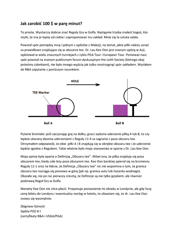 Jak zarobić 100 $ w parę minut? To proste. Wystarczy dobrze znać Reguły Gry w Golfa. Następnie trzeba znaleźć kogoś, kto myśli, że zna je lepiej od ciebie i zaproponować mu zakład. Mnie się ta sztuka udała. Powstał spór pomiędzy mną i jednym z sędziów z Malezji, na temat, jakie piłki należy uznać za prawidłowo znajdujące się w obszarze tee. Dr. Lau Kee Oon jest znanym sędzią w Azji, sędziował w wielu znacznych turniejach z cyklu PGA Tour i European Tour. Ponieważ nasz spór powstał na znanym publicznym forum dyskusyjnym the Leith Society (którego obaj jesteśmy członkami), nie było innego wyjścia jak tylko rozstrzygnąć spór zakładem. Wysłałem do R&A zapytanie z poniższym rysunkiem. Pytanie brzmiało: jeśli zaczynając grę na dołku, gracz wykona uderzenie piłką A lub B, to czy będzie ukarany dwoma uderzeniami z Reguły 11-4 za zagranie z poza obszaru tee. Otrzymałem odpowiedź, że obie piłki A i B znajdują się w obrębie obszaru tee i że uderzenie będzie zgodne z Regułami. Takie właśnie było moje stanowisko w sporze z Dr. Lau Kee Oon. Moja opinia była oparta o Definicję „Obszaru tee”. Mówi ona, że piłka znajduje się poza obszarem tee, kiedy cała leży poza obszarem tee. Kee Oon bardziej opierał się na brzmieniu Reguły 11-1 oraz na fakcie, że Definicja „Obszaru tee” nic nie wspomina o tym, że granica obszaru tee rozciąga się pionowo w górę (jak np. granica autu lub hazardu wodnego). Okazało się, nie po raz pierwszy zresztą, że Definicje są nie tylko językiem, ale również podstawą Reguł Gry w Golfa. Niestety Kee Oon nie chce płacić. Proponuje postawienie mi obiadu w Londynie, ale gdy liczę cenę biletu do Londynu i ewentualny nocleg w hotelu, to obawiam się, że dr. Lau Kee Oon znowu się wysmyknie. Zbigniew Górecki Sędzia PZG kl I (certyfikaty R&A i USGA/PGA)