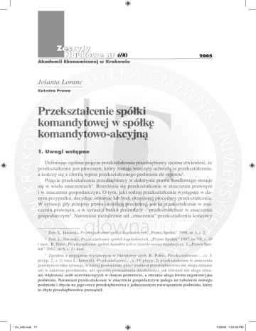 Zeszyty Naukowe nr 690 Akademii Ekonomicznej w Krakowie 2005 Jolanta Loranc Katedra Prawa Przekształcenie spółki komandytowej w spółkę komandytowo-akcyjną 1. Uwagi wstępne Definiując ogólnie pojęcie przekształcenia przedsiębiorcy można stwierdzić, że przekształcenie jest procesem, który zostaje wszczęty uchwałą o przekształceniu, a kończy się z chwilą wpisu przekształconego podmiotu do rejestru. Pojęcie przekształcenia przedsiębiorcy w doktrynie prawa handlowego stosuje się w wielu znaczeniach. Rozróżnia się przekształcenie w znaczeniu prawnym i w znaczeniu gospodarczym. O tym, jaki rodzaj przekształcenia występuje w danym przypadku, decyduje istnienie lub brak określonej procedury przekształcenia. W sytuacji gdy przepisy prawa określają procedurę, jest to przekształcenie w znaczeniu prawnym, a w sytuacji braku procedury – przekształcenie w znaczeniu gospodarczym. Natomiast niezależnie od „znaczenia” przekształcenia końcowy Zob. L. Jaworski, Przekształcenia spółek kapitałowych, „Prawo Spółek” 1998, nr 3, s. 2. Zob. L. Jaworski, Przekształcanie spółek kapitałowych, „Prawo Spółek” 1997, nr 7/8, s. 19 i nast.; R. Pabis, Przekształcanie spółek handlowych w świetle nowej regulacji cz. I, „Prawo Spółek” 2002, nr 6, s. 2 i nast. Zgodnie z poglądem wyrażonym w literaturze (zob. R. Pabis, Przekształcanie… cz. I, przyp. 2, s. 2; oraz L. Jaworski, Przekształcanie…, s. 19, przyp. 2) przekształcenie w znaczeniu prawnym to taka sytuacja, w której prowadzone przez podmiot przedsiębiorstwo nie ulega zmianie ani w zakresie przedmiotu, ani sposobu prowadzenia działalności, jak również nie ulega zmianie większość osób uczestniczących w danym podmiocie, a zmianie ulega forma organizacyjna podmiotu. Natomiast przekształcenie w znaczeniu gospodarczym polega na założeniu nowego podmiotu i zbyciu na jego rzecz przedsiębiorstwa z jednoczesnym rozwiązaniem podmiotu, który to zbyte przedsiębiorstwo prowadził. Zn_690.indb 17 1/30/08 1:22:59 PM Jolanta Loranc 18 wynik zawsze jest ten sam – przekształcenie prowadzi do zmiany formy prawnej prowadzenia działalności. Przyjmując, że z przekształceniem prawnym mamy do czynienia wówczas, gdy odbywa się ono według określonej procedury, można wnioskować, iż istnieje zamknięta lista możliwości dokonywania przekształcenia, to znaczy że nie jest możliwe dokonanie przekształcenia w znaczeniu prawnym, jeżeli przepisy prawa nie regulują tej kwestii. Podstawą przekształcenia spółek w prawie polskim są przepisy Kodeksu spółek handlowych – tytuł IV, dział III, a więc jest to przekształcenie w znaczeniu prawnym. Stąd też przekształcenie spółki w inną spółkę to sytuacja, w której dochodzi jedynie do zmiany formy ustrojowej spółki, natomiast bez zmian pozostaje przedmiot i sposób prowadzenia jej działalności, a także bez większych zmian pozostaje liczba wspólników. Przekształcenie spółki w inną spółkę następuje bez konieczności rozwiązania dotychczas funkcjonującej spółki i stworzenia w jej miejsce nowej (a tak dzieje się przy przekształceniu w znaczeniu gospodarczym), bowiem zarówno przed przekształceniem, jak i po zakończeniu tego procesu pozostaje ten sam podmiot, ale z innym ustrojem. Na taki skutek wskazuje art. 551 § 1 k.s.h. rozróżniając pojęcie spółki przekształcanej i spółki przekształconej, do oznaczenia tej samej spółki. Dlatego w doktrynie przyjęło się stanowisko, że przekształcenia spółek zachodzą zgodnie z zasadą kontynuacji (ciągłości, zachowania tożsamości przez podmiot), a nie sukcesji uniwersalnej (gdzie występują dwa różne podmioty). Kodeks spółek handlowych wprowadził możliwość przekształcenia spółki handlowej w każdą inną spółkę handlową, a także przekształcenia spółki cywilnej w każdy rodzaj spółki handlowej. Jest to istotna różnica w porównaniu z obowiązującym do 31 grudnia 2000 r. Kodeksem handlowym, który dopuszczał przekształcenie spółek w bardzo wąskim zakresie. Zgodnie z treścią art. 551 § 1 k.s.h. spółka jawna, spółka partnerska, spółka komandytowa, spółka komandytowo-akcyjna, spółka z ograniczoną odpowiedzialnością, spółka akcyjna (spółka przekształcana) może być przekształcona w inną spółkę handlową (spółkę przekształconą). Analizując treść przepisu można stwier Ustawa z dnia 15 września 2000 r. Kodeks spółek handlowych (skrót k.s.h.), Dz.U. nr 94, poz. 1037, ze zm. Zob. A. Szumański, Przekształcanie spółek [w:] W. Pyzioł, A. Szumański, I. Weiss, Prawo spółek, Oficyna Wydawnicza Branta, Bydgoszcz 1998, s. 881, i nast. Zob. A. Szumański, op. cit., s. 882, przyp. 5; R. Pabis, Przekształcanie… cz. I, s. 3 i nast., przyp. 2. Nie dopuszcza się możliwości przekształcenia spółek handlowych w spółkę cywilną. Rozporządzenie Prezydenta Rzeczypospolitej z dnia 27 czerwca 1934 r., Kodeks handlowy, Dz.U. nr 57, poz. 502, ze zm. Zn_690.indb 18 1/30/08 1:23:00 PM Przekształcenie spółki komandytowej w spółkę… 19 dzić, że obecnie dopuszcza się każdą możliwą kombinację w zakresie przekształcania spółek, a więc może dochodzić do przekształcenia nie tylko pomiędzy spółkami tego samego rodzaju: między osobowymi lub kapitałowymi, ale możliwe jest przekształcenie spółki osobowej w spółkę kapitałową i odwrotnie. Nie oznacza to jednak, że nie ma żadnych ograniczeń w procesie przekształcania spółek. Zgodnie z art. 551 § 4 k.s.h. nie może być przekształcona spółka w likwidacji, która rozpoczęła podział majątku, ani spółka w upadłości. Z powyższego przepisu wynika, że możliwe jest przekształcenie spółki w likwidacji, o ile spółka nie rozpoczęła jeszcze podziału majątku. Przepisy dotyczące przekształcania spółek handlowych zawarte w Kodeksie spółek handlowych nie są łatwe w stosowaniu, gdyż najpierw