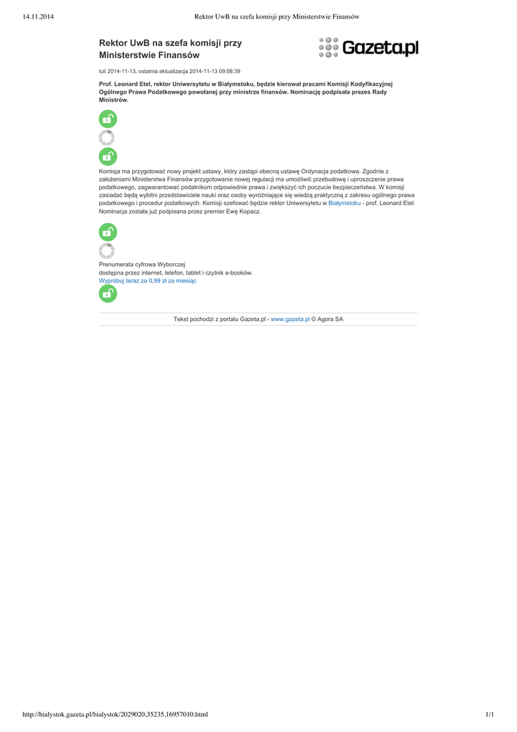 14.11.2014 Rektor UwB na szefa komisji przy Ministerstwie Finansów Rektor UwB na szefa komisji przy Ministerstwie Finansów tuli 20141113, ostatnia aktualizacja 20141113 09:08:39 Prof. Leonard Etel, rektor Uniwersytetu w Białymstoku, będzie kierował pracami Komisji Kodyfikacyjnej Ogólnego Prawa Podatkowego powołanej przy ministrze finansów. Nominację podpisała prezes Rady Ministrów. Komisja ma przygotować nowy projekt ustawy, który zastąpi obecną ustawę Ordynacja podatkowa. Zgodnie z założeniami Ministerstwa Finansów przygotowanie nowej regulacji ma umożliwić przebudowę i uproszczenie prawa podatkowego, zagwarantować podatnikom odpowiednie prawa i zwiększyć ich poczucie bezpieczeństwa. W komisji zasiadać będą wybitni przedstawiciele nauki oraz osoby wyróżniające się wiedzą praktyczną z zakresu ogólnego prawa podatkowego i procedur podatkowych. Komisji szefować będzie rektor Uniwersytetu w Białymstoku prof. Leonard Etel. Nominacja została już podpisana przez premier Ewę Kopacz. Prenumerata cyfrowa Wyborczej dostępna przez internet, telefon, tablet i czytnik ebooków. Wypróbuj teraz za 0,99 zł za miesiąc Tekst pochodzi z portalu Gazeta.pl www.gazeta.pl © Agora SA http://bialystok.gazeta.pl/bialystok/2029020,35235,16957010.html 1/1