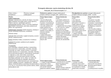 Wymagania edukacyjne z języka niemieckiego dla klasy III Podręcznik ,,Das ist Deutsch kompakt 2 i 3'' Zakres wiedzy i umiejętności Poziomy wymagań edukacyjnych Podstawowy poziom wymagań edukacyjnych (stopień realizacji wymagań: niski / podstawowy) Wiedza Zakresy tematyczne: zdrowie ( samopoczucie, choroby ich objawy i leczenie) sport ( popularne dyscypliny sportu, sprzęt sportowy, imprezy sportowe, upodobania sportowe) świat przyrody (pogoda, rośliny i zwierzęta, krajobraz) dom (miejsce zamieszkania, opis domu, pomieszczeń domu i ich wyposażenia) Ocena dopuszczająca uczeń: -zna niewielką liczbę podstawowych słówek i wyrażeń z wymienionych zakresów tematycznych, -zna tylko podstawowe reguły gramatyczne, -w wymowie i w piśmie podróżowanie i turystyka (środki transportu, orientacja w popełnia liczne błędy, co terenie, informacja turystyczna, zwiedzanie) znacznie utrudnia komunikację Wybrane tematy: -zadania leksykalnoczłowiek (dane personalne, wygląd zewnętrzny, uczucia i gramatyczne wykonuje emocje, zainteresowania) powoli i/lub z pomocą innych osób kultura (dziedziny kultury, uczestnictwo w kulturze) Ocena dostateczna uczeń: -zna bardzo podstawowe słownictwo i wyrażenia z wymienionych zakresów tematycznych, - popełnia dość liczne błędy w ich wymowie i zapisie -zna znaczną część podstawowych struktur gramatyczno-leksykalnych jednak z trudem je potrafi wykorzystać w komunikacji zadania leksykalnogramatyczne wykonuje powoli, ale samodzielnie Ponadpodstawowy poziom wymagań edukacyjnych (stopień realizacji wymagań: średni / wysoki) Ocena dobra uczeń: -zna większość wprowadzonego słownictwa i wyrażeń i z reguły poprawnie je wymawia oraz zapisuje -zna prawie wszystkie struktury gramatycznoleksykalne i często używa ich w komunikacji - zadania wykonuje samodzielnie z nielicznymi usterkami Ocena bardzo dobra uczeń: -zna prawie wszystkie wprowadzone słówka i wyrażenia z wymienionych zakresów tematycznych, bezbłędnie je wymawia i zapisuje -zna wszystkie struktury gramatyczno-leksykalne i nie popełnia błędów w zadaniach i z łatwością stosuje je w komunikacji Ocena dobra - rozumie wszystkie polecenia nauczyciela i wykonuje większość zadań na rozumienie ze słuchu, potrafi także zrozumieć Ocena bardzo dobra - rozumie polecenia nauczyciela oraz potrafi z prezentowanych tekstów zrozumieć i wyselekcjonować wszystkie technika (korzystanie z podstawowych urządzeń technicznych) Gramatyka: tryb rozkazujący, rodzajnik określony i nieokreślony, przeczenie kein w mianowniku, celowniku i bierniku, czasownik war i hatte, zaimek zwrotny w celowniku, zaimki dzierżawcze w mianowniku, celowniku i bierniku, rzeczownki odczasownikowe, potwierdzenie i przeczenie w zdaniach: ja, nein, doch; formy czasowników modalnych w czasie przeszłym prostym; przyimki określające położenie: auf, in, neben, vor, hinter itd.; odmiana przymiotnika po rodzajniku określonym, nieokreślonym, zaimku dzierżawczym i przeczeniu kein; zaimki względne, przyimek z dopełniaczem: während; zdania z bezokolicznikiem, konstrukcje bezokolicznikowe z zu i bez zu, czas przyszły Futur; pytania zależne, zdania okolicznikowe celu Ocena dopuszczająca - z reguły rozumie polecenia nauczyciela i teksty odsłuchowe (globalnie), oraz potrafi wykonać poprawnie niektóre zadania Ocena dostateczna - rozumie prawie wszystkie polecenia nauczyciela i teksty odsłuchowe (globalnie), potrafi wykonać większość zadań na rozumienie ze Umiejętności: 1. receptywne (słuchanie/czytanie) na rozumienie ze słuchu, jeśli prezentowane teksty są dobrej jakości i zawierają jednoznaczne informacje oraz są powtarzane kilkakrotnie - potrafi zrozumieć ogólnie bardzo proste teksty pisane, jeśli zawierają wszystkie znane mu słownictwo i struktury słuchu, jeśli może kilkakrotnie odsłuchać teksty, a materiał jest powoli prezentowany - rozumie ogólnie proste teksty pisane w zakresie znanych mu tematów i struktur, a także niektóre informacje szczegółowe informacje szczegółowe zawarte w tekście - czyta ze zrozumieniem większość tekstów na poznane tematy, potrafi podać ogólny sens tekstu i większość informacji szczegółowych potrzebne informacje, nie ma większych problemów z wykonaniem zadań odsłuchowych - rozumie globalnie i szczegółowo prawie wszystkie teksty pisane, potrafi wykonać wszystkie zadania związane z tekstem 2. produktywne (mówienie/pisanie) - potrafi z pomocą rozmówcy odpowiedzieć na pytania dotyczące poznanych tematów: dyscyplin sportowych, chorób i dolegliwości, podróży - odpowiadać na pytania lub je zadać o swoim domu zdrowiu lub na tematy codzienne dotyczące go osobiście, z trudnością nawiązuje komunikację z powodu błędnej wymowy i intonacji oraz nieznajomości struktur gramatycznych - potrafi napisać bardzo proste,wcześniej poznane zdania i wyrażenia, z trudnością tworzy kilkuwyrazowe teksty, jednak zawierają one sporo błędów ortograficznych, gramatycznych i składniowych, co znacznie utrudnia ich komunikatywność - potrafi odpowiedzieć na pytania dotyczące poznanych tematów oraz z niewielką pomocą krótko opowiedzieć o dyscyplinach sportowych, chorobach i dolegliwościach; zadać proste pytanie rozmówcy na tematy dotyczące domu, podróży; komunikację zakłócają dość liczne błędy w wymowie, intonacji lub w strukturach gramatycznych - potrafi napisać według wzoru krótkie, kilkuwyrazowe teksty, które zawierają wprawdzie liczne błędy, ale są dość komunikatywne - potrafi w prosty sposób wypowiedzieć się i zareagować na większość poznanych tematów dotyczących zdrowia, sportu, świata przyrody, domu, podróży;wyraża prostymi środkami swoje upodobania i opinie, komunikacji nie zakłócają nieliczne błędy wymowy lub intonacji - potrafi napisać według wzoru oraz często samodzielnie zdania oraz kilkuzdaniowe teksty, stosując poznane słownictwo i struktury, 