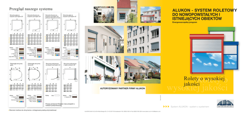 Przegląd naszego systemu Skrzynka gięta ze ścięciem pod kątem 20° Skrzynka tłoczona ze ścięciem pod kątem 20° Skrzynka tłoczona ze ścięciem pod kątem 20°, pokrywa rewizyjna od dołu B B ALUKON - SYSTEM ROLETOWY DO NOWOPOWSTAŁYCH I ISTNIEJĄCYCH OBIEKTÓW Skrzynka gięta ze ścięciem pod kątem 45° B B Energooszczędny program A C A D * * * * 100 125 138 150 165 180 205 A 100 125 138 150 165 180 205 B 100 125 138 150 165 180 205 A C D 65 90 105 115 130 145 175 Kolory biały j. brązowy 8014 beżowy srebrny c. brązowy SF szary SF biały 9016 matowy RAL 100 125 * 138 * 150 * 165 * 180 205 A 100 125 138 150 165 180 205 B 100 125 138 150 165 180 205 C D D C 85 105 115 127 140 145 175 A C C 87 106 115 127 142 155 175 D 60 85 99 111 125 141 170 Kolory biały j. brązowy 8014 c. brązowy SF szary SF biały 9016 matowy srebrna anoda RAL A 125 138 150 165 180 125 * 138 * 150 * 165 180 * B 125 138 150 165 180 D C D 110 85 117 99 129 111 144 125 157 141 Kolory biały j. brązowy 8014 c. brązowy SF biały 9016 matowy srebrna anoda RAL A 125 138 150 165 180 205 230 254 125 * 138 * 150 * 165 * 180 205 230 254 B 125 138 150 165 180 205 230 254 C 90 107 118 128 146 168 190 210 D 92 98 107 119 127 149 160 175 Kolory biały zieleń jodłowa beżowy ciemny czerwony srebrny antracytowo-szary c. brązowy SF stalowo-niebieski szary SF kość słoniowa biały 9016 matowy RAL kremowo-biały Półokrągła skrzynka gięta Półokrągła skrzynka tłoczona Skrzynka podtynkowa ze ścięciem pod kątem 20° Skrzynka podtynkowa z kątem prostym 90° B B A C A Rolety o wysokiej jakoÊci Rolety o wysokiej jakości 24 mm 33 mm * B C D 125 81,5 152 148 95 179 160,5 100 194 184,5 117 222 biały Kolory c. brązowy SF srebrny kremowo-bialy RAL A 138 141 * 165 * 180 169 182 * 205 210,5 * B C D 122,5 79 149,5 145,5 92,5 176,5 158 97,5 191,5 182 114,5 219,5 biały Kolory c. brązowy SF biały 9016 matowy srebrna anoda RAL i anoda 125 * 138 * 150 * 165 180 * A 127 139 152 168 184 Kolory B 127 139 152 168 184 C 110 118 130 147 157 biały 125 138 150 165 180 A B 126 126 138,5 138,5 152 152 167 167 183 183 Kolory biały c. brązowy SF AUTORYZOWANY PARTNER FIRMY ALUKON Stand 04/2007 A 138 141 * 165 * 180 169 182 * 205 210,5 Proszę zamówcie Państwo nasz prospekt o roletach podtynkowych! * Również możliwe do otrzymania z zintegrowaną siatką antyinsektową! System ALUKON - system z systemem ALUKON GmbH & Co.KG • Münchberger Str. 31 • D-95176 Konradsreuth • Tel. 09292/ 950-0 • Fax 09292/ 950-293 • www alukon.com • [email protected]