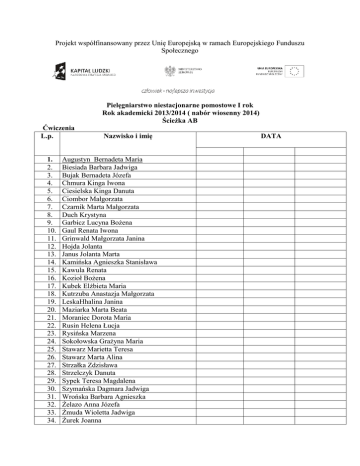 Projekt współfinansowany przez Unię Europejską w ramach Europejskiego Funduszu Społecznego Pielęgniarstwo niestacjonarne pomostowe I rok Rok akademicki 2013/2014 ( nabór wiosenny 2014) Ścieżka AB Ćwiczenia L.p. 1. 2. 3. 4. 5. 6. 7. 8. 9. 10. 11. 12. 13. 14. 15. 16. 17. 18. 19. 20. 21. 22. 23. 24. 25. 26. 27. 28. 29. 30. 31. 32. 33. 34. Nazwisko i imię Augustyn Bernadeta Maria Biesiada Barbara Jadwiga Bujak Bernadeta Józefa Chmura Kinga Iwona Ciesielska Kinga Danuta Ciombor Małgorzata Czarnik Marta Małgorzata Duch Krystyna Garbicz Lucyna Bożena Gaul Renata Iwona Grinwald Małgorzata Janina Hojda Jolanta Janus Jolanta Marta Kamińska Agnieszka Stanisława Kawula Renata Kozioł Bożena Kubek Elżbieta Maria Kutrzuba Anastazja Małgorzata LeskaHhalina Janina Maziarka Marta Beata Moraniec Dorota Maria Rusin Helena Łucja Rysińska Marzena Sokołowska Grażyna Maria Stawarz Marietta Teresa Stawarz Marta Alina Strzałka Zdzisława Strzelczyk Danuta Sypek Teresa Magdalena Szymańska Dagmara Jadwiga Wrońska Barbara Agnieszka Żelazo Anna Józefa Żmuda Wioletta Jadwiga Żurek Joanna DATA 35. Sołowska Liliana 36.