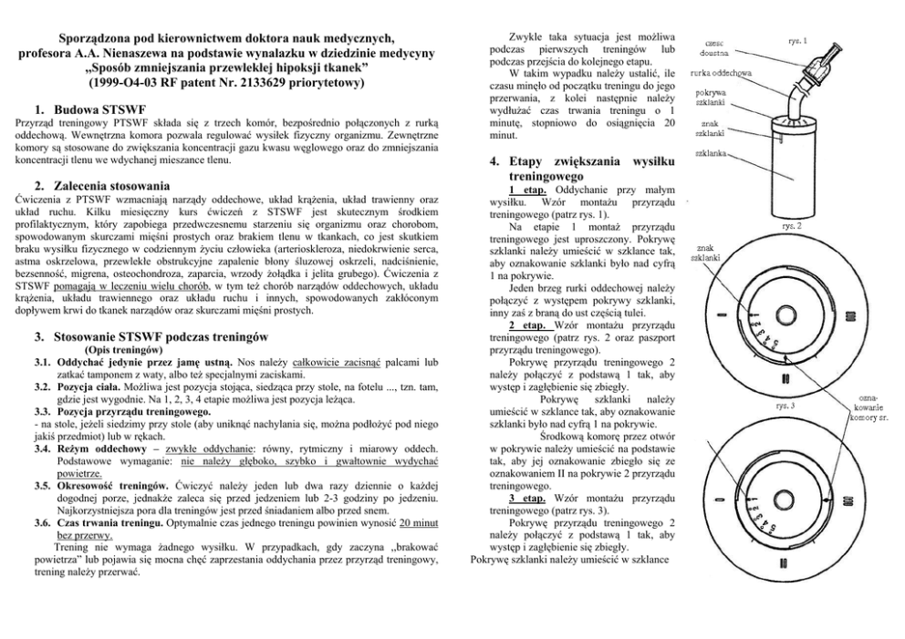 Sporządzona pod kierownictwem doktora nauk medycznych, profesora A.A. Nienaszewa na podstawie wynalazku w dziedzinie medycyny ,,Sposób zmniejszania przewlekłej hipoksji tkanek” (1999-O4-03 RF patent Nr. 2133629 priorytetowy) 1. Budowa STSWF Przyrząd treningowy PTSWF składa się z trzech komór, bezpośrednio połączonych z rurką oddechową. Wewnętrzna komora pozwala regulować wysiłek fizyczny organizmu. Zewnętrzne komory są stosowane do zwiększania koncentracji gazu kwasu węglowego oraz do zmniejszania koncentracji tlenu we wdychanej mieszance tlenu. 2. Zalecenia stosowania Ćwiczenia z PTSWF wzmacniają narządy oddechowe, układ krążenia, układ trawienny oraz układ ruchu. Kilku miesięczny kurs ćwiczeń z STSWF jest skutecznym środkiem profilaktycznym, który zapobiega przedwczesnemu starzeniu się organizmu oraz chorobom, spowodowanym skurczami mięśni prostych oraz brakiem tlenu w tkankach, co jest skutkiem braku wysiłku fizycznego w codziennym życiu człowieka (arterioskleroza, niedokrwienie serca, astma oskrzelowa, przewlekłe obstrukcyjne zapalenie błony śluzowej oskrzeli, nadciśnienie, bezsenność, migrena, osteochondroza, zaparcia, wrzody żołądka i jelita grubego). Ćwiczenia z STSWF pomagają w leczeniu wielu chorób, w tym też chorób narządów oddechowych, układu krążenia, układu trawiennego oraz układu ruchu i innych, spowodowanych zakłóconym dopływem krwi do tkanek narządów oraz skurczami mięśni prostych. 3. Stosowanie STSWF podczas treningów (Opis treningów) 3.1. Oddychać jedynie przez jamę ustną. Nos należy całkowicie zacisnąć palcami lub zatkać tamponem z waty, albo też specjalnymi zaciskami. 3.2. Pozycja ciała. Możliwa jest pozycja stojąca, siedząca przy stole, na fotelu ..., tzn. tam, gdzie jest wygodnie. Na 1, 2, 3, 4 etapie możliwa jest pozycja leżąca. 3.3. Pozycja przyrządu treningowego. - na stole, jeżeli siedzimy przy stole (aby uniknąć nachylania się, można podłożyć pod niego jakiś przedmiot) lub w rękach. 3.4. Reżym oddechowy – zwykłe oddychanie: równy, rytmiczny i miarowy oddech. Podstawowe wymaganie: nie należy głęboko, szybko i gwałtownie wydychać powietrze. 3.5. Okresowość treningów. Ćwiczyć należy jeden lub dwa razy dziennie o każdej dogodnej porze, jednakże zaleca się przed jedzeniem lub 2-3 godziny po jedzeniu. Najkorzystniejsza pora dla treningów jest przed śniadaniem albo przed snem. 3.6. Czas trwania treningu. Optymalnie czas jednego treningu powinien wynosić 20 minut bez przerwy. Trening nie wymaga żadnego wysiłku. W przypadkach, gdy zaczyna ,,brakować powietrza” lub pojawia się mocna chęć zaprzestania oddychania przez przyrząd treningowy, trening należy przerwać. Zwykle taka sytuacja jest możliwa podczas pierwszych treningów lub podczas przejścia do kolejnego etapu. W takim wypadku należy ustalić, ile czasu minęło od początku treningu do jego przerwania, z kolei następnie należy wydłużać czas trwania treningu o 1 minutę, stopniowo do osiągnięcia 20 minut. 4. Etapy zwiększania wysiłku treningowego 1 etap. Oddychanie przy małym wysiłku. Wzór montażu przyrządu treningowego (patrz rys. 1). Na etapie 1 montaż przyrządu treningowego jest uproszczony. Pokrywę szklanki należy umieścić w szklance tak, aby oznakowanie szklanki było nad cyfrą 1 na pokrywie. Jeden brzeg rurki oddechowej należy połączyć z występem pokrywy szklanki, inny zaś z braną do ust częścią tulei. 2 etap. Wzór montażu przyrządu treningowego (patrz rys. 2 oraz paszport przyrządu treningowego). Pokrywę przyrządu treningowego 2 należy połączyć z podstawą 1 tak, aby występ i zagłębienie się zbiegły. Pokrywę szklanki należy umieścić w szklance tak, aby oznakowanie szklanki było nad cyfrą 1 na pokrywie. Środkową komorę przez otwór w pokrywie należy umieścić na podstawie tak, aby jej oznakowanie zbiegło się ze oznakowaniem II na pokrywie 2 przyrządu treningowego. 3 etap. Wzór montażu przyrządu treningowego (patrz rys. 3). Pokrywę przyrządu treningowego 2 należy połączyć z podstawą 1 tak, aby występ i zagłębienie się zbiegły. Pokrywę szklanki należy umieścić w szklance aby oznakowanie szklanki było nad cyfrą I na pokrywie. Szklankę należy umieścić na podstawie 1 przez otwór w pokrywie 2. Środkową komorę przez otwór w pokrywie należy umieścić na podstawie tak, aby jej oznakowanie zbiegło się ze oznakowaniem III na pokrywce 2 przyrządu treningowego. 4 etap. Montaż przyrządu treningowego jest taki sam jak na 3 etapie. Przed każdym treningiem do szklanki należy wlać 2 łyżki ciepłej gotowanej wody. Pokrywę szklanki należy umieścić w szklance tak, aby oznakowanie szklanki zbiegło się z cyfrą 1 na pokrywie szklanki. (Po każdym treningu należy wymyć gorącą wodą). Po 10 dniach pokrywkę należy umieścić nad cyfrą 2. Po 10 dniach pokrywkę należy umieścić nad cyfrą 3. Po 10 dniach pokrywkę należy umieścić nad cyfrą 4. Czas trwania etapów zależy od wieku osoby. Dla osób w wieku poniżej 50 lat czas trwania każdego etapu wynosi półtora miesiąca. Dla osób w wieku powyżej 50 lat czas trwania każdego etapu wynosi dwa miesiące. Za początek etapu uważa się pierwszy trening, trwający 20 min. Ilość etapów zależy od wieku oraz stanu zdrowia osoby. Dla dzieci w wieku poniżej 10-12 lat – 1, 2 etapy. Dla dorosłych w wieku poniżej 60 lat – 1, 2, 3, 4 etapy. Dla osób w wieku powyżej 60 lat – jedynie 1, 2 etapy. Okres treningów, po przejściu przez wszystkie obowiązujące etapy, przedłuża się poprzez montowanie przyrządu treningowego w sposób, wskazany w instrukcji dotyczącej ostatniego etapu. Stosowanie wodnego wysiłku, tzn. wlewanie wody, nie jest obowiązkowe. Spółka naukowo-produkcyjna ,,SAMOZDRAW” INSTRUKCJA UŻYTKOWANIA PRZYRZĄDU TRENINGOWEGO – SYMULATORA ĆWICZEŃ FIZYCZNYCH 5. Dodatkowe zalecenia 1. 2. Niektórzy na niektóry