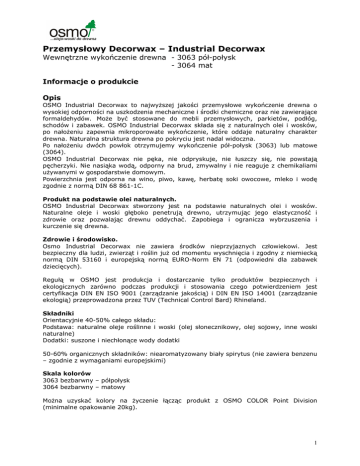 Przemysłowy Decorwax – Industrial Decorwax Wewnętrzne wykończenie drewna - 3063 pół-połysk - 3064 mat Informacje o produkcie Opis OSMO Industrial Decorwax to najwyższej jakości przemysłowe wykończenie drewna o wysokiej odporności na uszkodzenia mechaniczne i środki chemiczne oraz nie zawierające formaldehydów. Może być stosowane do mebli przemysłowych, parkietów, podłóg, schodów i zabawek. OSMO Industrial Decorwax składa się z naturalnych olei i wosków, po nałożeniu zapewnia mikroporowate wykończenie, które oddaje naturalny charakter drewna. Naturalna struktura drewna po pokryciu jest nadal widoczna. Po nałożeniu dwóch powłok otrzymujemy wykończenie pół-połysk (3063) lub matowe (3064). OSMO Industrial Decorwax nie pęka, nie odpryskuje, nie łuszczy się, nie powstają pęcherzyki. Nie nasiąka wodą, odporny na brud, zmywalny i nie reaguje z chemikaliami używanymi w gospodarstwie domowym. Powierzchnia jest odporna na wino, piwo, kawę, herbatę soki owocowe, mleko i wodę zgodnie z normą DIN 68 861-1C. Produkt na podstawie olei naturalnych. OSMO Industrial Decorwax stworzony jest na podstawie naturalnych olei i wosków. Naturalne oleje i woski głęboko penetrują drewno, utrzymując jego elastyczność i zdrowie oraz pozwalając drewnu oddychać. Zapobiega i ogranicza wybrzuszenia i kurczenie się drewna. Zdrowie i środowisko. Osmo Industrial Decorwax nie zawiera środków nieprzyjaznych człowiekowi. Jest bezpieczny dla ludzi, zwierząt i roślin już od momentu wyschnięcia i zgodny z niemiecką normą DIN 53160 i europejską normą EURO-Norm EN 71 (odpowiedni dla zabawek dziecięcych). Regułą w OSMO jest produkcja i dostarczanie tylko produktów bezpiecznych i ekologicznych zarówno podczas produkcji i stosowania czego potwierdzeniem jest certyfikacja DIN EN ISO 9001 (zarządzanie jakością) i DIN EN ISO 14001 (zarządzanie ekologią) przeprowadzona przez TUV (Technical Control Bard) Rhineland. Składniki Orientacyjnie 40-50% całego składu: Podstawa: naturalne oleje roślinne i woski (olej słonecznikowy, olej sojowy, inne woski naturalne) Dodatki: suszone i niechłonące wody dodatki 50-60% organicznych składników: niearomatyzowany biały spirytus (nie zawiera benzenu – zgodnie z wymaganiami europejskimi) Skala kolorów 3063 bezbarwny – półpołysk 3064 bezbarwny – matowy Można uzyskać kolory na życzenie łącząc produkt z OSMO COLOR Point Division (minimalne opakowanie 20kg). 1 Przemysłowy Decorwax – Industrial Decorwax Wewnętrzne wykończenie drewna - 3063 pół-połysk - 3064 mat Jeśli chcemy nakładać OSMO Wood Wax w kolorze transparentnym (lub mieszanym) jest on nakładany jako pierwsza powłoka. Po wyschnięciu nakładamy bezbarwny OSMO Industrial Decorwax jako powłokę wykończeniową. Wielkości opakowań: 20kg 2,5l puszka Przygotowanie powierzchni Powierzchnia drewna musi być czysta, sucha (maksymalna wilgotność 20%), nie zamarznięta. Meble: powierzchnia musi być wyszlifowana (grubość papieru P 180) – pył należy dokładnie usunąć. Metoda aplikacji OSMO Industrial Decorwax jest gotowy do użycia od razu po otwarciu opakowania. Nie rozrzedzać. Dobrze wymieszać. Ilość nakładanego produktu zależy od rodzaju drewna i pożądanego wykończenia. Standardowe pokrywanie: 1. Pierwsze aplikacja nałożyć około 35-40g/m2, suszenie: około 2-3 godzin w pokojowej temperaturze/ około 1 godziny w temperaturze 50 stopni C. Gotowy do szlifowania po 6-8 godzinach / 2-3 godzinach. 2. pośrednie szlifowanie papier o grubości P220 lub cieńszy 3. Druga aplikacja nałożyć około 35-40 g/m2, suszenie: około 2,5 godzin w temperaturze pokojowej/ około 1 godziny w temperaturze 50 stopni C, po 12 godzinach można użytkować OSMO Industrial Decorwax może być nakładany sprayem jak i szczotką czy też szmatką. Więcej porad technicznych udzielimy na szczegółowe zapytanie. Czyszczenie narzędzi Używając specjalnego OSMO Brush Cleaner (nie zawiera benzenu) lub białego spirytusu. Konserwacja Do codziennego czyszczenia używać suchej szmatki. Aby usunąć małe plamy używaj wilgotnej, czystej szmatki zamoczonej w roztworze wody i małej ilości OSMO Color Wash&Care 8016. Do usunięcia mocnego brudu i dużych plam oraz aby utrzymać powierzchnię w doskonałej kondycji używaj OSMO COLOR Liquid Wax Cleaner 3029 (dostępny również jako spray). Uszkodzone powierzchnie mogą być restaurowane przy pomocy oryginalnego produktu OSMO Hardwax-Oil (3032 półpołysk lub 3062 mat) 2 Przemysłowy Decorwax – Industrial Decorwax Wewnętrzne wykończenie drewna - 3063 pół-połysk - 3064 mat Uwaga! Trzymać z dala od dzieci. Nie przechowywać w opakowaniach używanych do przechowywania żywności i napojów. Pracuj w pomieszczeniach z dobrą wentylacją. Nie nakładaj w obecności ognia, na gorące podłoża lub na sprzęt elektryczny. W przypadku kontaktu z oczyma spłucz dużą ilością wody. Natychmiast wypierz ubrania używane podczas pracy lub trzymaj je w zamkniętym kontenerze. Zawiera 2butanoksynę. Sucha powierzchnia jest bezpieczna dla ludzi, zwierząt i roślin. Sucha powierzchnia jest wysoce ognioodporna zgodnie z normą TLA-053. 3