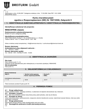 1/5 Opracowano w dniu: 22.08.2007 Zastąpiona redakcja z dnia: 17.05.2006 Data PDF: 10.01.2008 WISCHFRIS classic Karta charakterystyki zgodna z Rozporządzeniem (WE) Nr 1907/2006, Załącznik II 1. IDENTYFIKACJA SUBSTANCJI/PREPARATU I IDENTYFIKACJA PRZEDSIĘBIORSTWA Identyfikacja substancji lub preparatu WISCHFRIS classic Zastosowanie substancji/preparatu Środek do mycia i pielęgnacji podłóg Identyfikacja przedsiębiorstwa DREITURM GmbH, Postfach 11 40, D-36392 Steinau a. d. Straße Telefon 0 66 63 / 970 - 0, Telefax 0 66 63 / 970 - 490 Adres e-mailowy osoby kompetentnej: [email protected], [email protected] Numer alarmowy Ambulatorium przy objawach zatrucia : Tel.: +49 6131 / 19240 Numer alarmowy spółki: Tel. 0 66 63 / 970 - 2 30 Mo-Fr 8.00h - 16.00h 2. IDENTYFIKACJA ZAGROŻEŃ Dla ludzi Patrz również punkt 11 i 15. Preparat nie jest sklasyfikowany jako niebezpieczny w rozumieniu dyrektywy 1999/45/WE. Dla środowiska Patrz punkt 12. 3. SKŁAD/INFORMACJA O SKŁADNIKACH Nazwa Substancji Stęż.% Izotridekanol etoksylowany 1 -< 5 Symbol ostrze-gawczy Numer rejestracji (ECHA) Zwroty R DNEL Xn/Xi 22-41 EINECS, ELINCS PNEC Pełne brzmienie zwrotów R patrz punkt 16. 4. PIERWSZA POMOC 4.1 Drogi oddechowe Osobie zapewnić dopływ świeżego powietrza, w zależności od objawów skonsultować się z lekarzem. 4.2 Kontakt z oczami Przez kilka minut dokładnie spłukać dużą ilością wody, jeżeli potrzeba, udać się do lekarza. 4.3 Kontakt ze skórą Umyć dużą ilością wody, zanieczyszczone, nasączone ubranie niezwłocznie usunąć, natychmiast wezwać lekarza, mieć przy sobie informacje o produkcie. 4.4 Drogi pokarmowe Natychmiast wezwać lekarza, kartę charakterystyki mieć przy sobie. 4.5 n.b. Szczególnie polecane środki pierwszej pomocy 2/5 Opracowano w dniu: 22.08.2007 Zastąpiona redakcja z dnia: 17.05.2006 Data PDF: 10.01.2008 WISCHFRIS classic 5. POSTĘPOWANIE W PRZYPADKU POŻARU 5.1 Stosownych środków gaśniczych Dostosować pożarowo do otoczenia. 5.2 Środków gaśniczych, które nie są używane ze względów bezpieczeństwa n.b. 5.3 Specjalnych zagrożeń związanych z narażeniem wynikających z właściwości substancji lub preparatu jako takiego, produktów spalania, powstających gasów W przypadku pożaru mogą powstać: Tlenki węgla. Toksyczne produkty rozkładu termicznego. 5.4 Specjalnego sprzętu ochronnego dla strażaków Sprzęt ochrony dróg oddechowych niezależny od powietrza otoczenia. Według wielkości pożaru. W razie potrzeby - pełna ochrona. 5.5 Pozostałe uwagi Skażoną wodę gaśniczą zneutralizować zgodnie z przepisami administracyjnymi 6. POSTĘPOWANIE W PRZYPADKU NIEZAMIERZONEGO UWOLNIENIA DO ŚRODOWISKA Patrz punkt 13., odnośnie osobistego wyposażenia ochronnego patrz punkt 8. 6.1 Indywidualnych środków ostrożności W danym przypadku mieć na względzie niebezpieczeństwo poślizgu. Unikać kontaktu z oczami. 6.2 Środków ostrożności w odniesieniu do środowiska Przy ulatnianiu się większej ilości zatamować. W stanie nierozcieńczonym nie wylewać do kanalizacji. Unikać przenikania do wód gruntowych i powierzchniowych, a również do gruntu. 6.3 Metody oczyszczania Zebrać materiałem chłonnym (np.: uniwersalny środek wiążący) i usuwać zgodnie z punktem 13. 7. POSTĘPOWANIE Z SUBSTANCJĄ/PREPARATEM I JEJ/JEGO MAGAZYNOWANIE 7.1 Postępowanie z substancją/preparatem Wskazówki bezpiecznego postępowania: Patrz punkt 6.1 Zabrania sie jeść, pić, palić, a także przechowywać artykuły żywnościowe w pomieszczeniu roboczym. Przed przerwami i po pracy umyć ręce. Przestrzegać wskazówek na etykiecie, jak równiez instrukcji użytkowania. 7.2 Magazynowanie Wymagania wobec pomieszczeń do magazynowania i pojemników: Produkt składować tylko w oryginalnie zamkniętych opakowaniach. Nie składować produktu w przejściach i klatkach schodowych. Szczególne warunki magazynowania: Patrz punkt 10 Chronić przed mrozem. 8. KONTROLA NARAŻENIA I ŚRODKI OCHRONY INDYWIDUALNEJ 8.1 Wartości graniczne narażenia --- 8.2 Kontrola narażenia 8.2.1 Kontrola narażenia w miejscu pracy Dbać o dobrą wentylację. Można to uzyskać dzięki lokalnemu odciągowi lub ogólnej wentylacji. 3/5 Opracowano w dniu: 22.08.2007 Zastąpiona redakcja z dnia: 17.05.2006 Data PDF: 10.01.2008 WISCHFRIS classic Jeśli to nie wystarczy, by utrzymać stężenie poniżej najwyższych dopuszczalnych wartości stężenia, należy stosować odpowiednią maskę chroniącą drogi oddechowe. Obowiązuje tylko, gdy tu podane są graniczne wartości ekspozycji. Ochrona dróg oddechowych: W normalnym przypadku nie wymagana. Ochrona rąk: Godne polecenia. Rękawice gumowe (EN 374). Zalecany krem ochronny do rąk. Ochrona oczu: Godne polecenia. Szczelne okulary ochronne z osłonami bocznymi (EN 166), przy zagrożeniu odpryskami. Ochrona skóry: Ochronne ubranie robocze (np. obuwie ochronne EN 344, ochronne ubranie robocze z długimi rękawami) Dodatkowe informacje dotyczące ochrony rąk - Nie wykonano żadnych testów. Przy wyborze preparatów kierowano się najlepszą wiedzą uwzględniając informacje opisujące składniki preparatu. Przy wyborze materiałów kierowano się informacjami producenta rękawic. Ostateczny wybór materiału rękawic musi nastąpić przy uwzględnieniu czasu przebicia, szybkości przenikania i degradacji. Wybór odpowiedniej rękawicy zależy nie tylko od materiału, ale także od innych cech jakościowych, które mogą być różne dla różnych producentów. Podczas produkcji trudna jest do przewidzenia trwałość materiałów rękawic i dlatego musi być sprawdzona przed użyciem. Dokładny czas przebicia materiału rękawic należy uzyskać od producenta rękawic ochronnych i przestrzegać. 8.2.2 Kontrola narażenia środowiska b.d. 9. WŁAŚCIWOŚCI FIZYCZNE I CHEMICZNE Stan fizyczny: Kolor: Zapach: Wartość pH nierozcieńczona: Temperatura wrzenia/zakres temperatury wrzenia (w °C): Temperatura topnienia/zakres tem