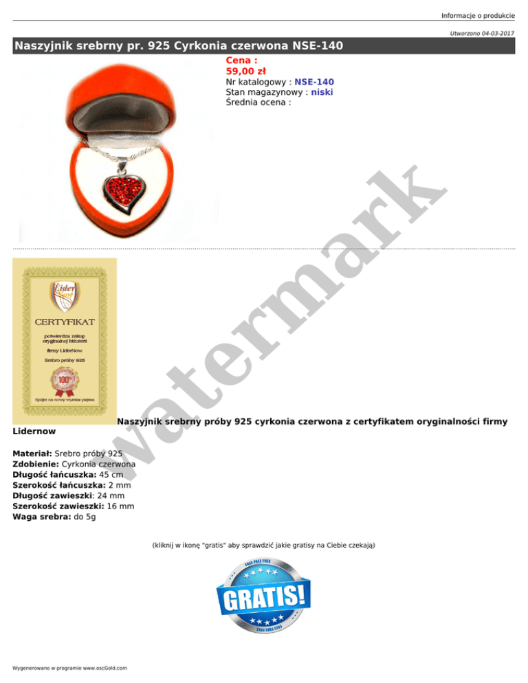 Informacje o produkcie Utworzono 04-03-2017 Naszyjnik srebrny pr. 925 Cyrkonia czerwona NSE-140 Cena : 59,00 zł at er m ar k Nr katalogowy : NSE-140 Stan magazynowy : niski Średnia ocena : Naszyjnik srebrny próby 925 cyrkonia czerwona z certyfikatem oryginalności firmy w Lidernow Materiał: Srebro próby 925 Zdobienie: Cyrkonia czerwona Długość łańcuszka: 45 cm Szerokość łańcuszka: 2 mm Długość zawieszki: 24 mm Szerokość zawieszki: 16 mm Waga srebra: do 5g (kliknij w ikonę "gratis" aby sprawdzić jakie gratisy na Ciebie czekają) Wygenerowano w programie www.oscGold.com Kupując w naszej firmie Lidernow gwarantujesz sobie otrzymanie oryginalnej biżuterii wykonanej ze srebra próby 925 oraz oryginalnych kryształów Swarovski, a także kamieni szlachetnych oraz ozdobnych. Dokonując zakupu, zbierasz punkty, ktory nastepnie możesz wymienić na złotówki przy następnym zamówieniu. er m ar k Dodatkowo bezpłatnie w zestrawie otrzymujesz stylowe pudełko na biżuterię oraz torebkę na prezent wraz z kopertą na dedykację. w at Życzymy udanych zakupów: zespół Lidernow.