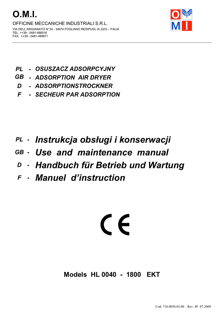 O.M.I. OFFICINE MECCANICHE INDUSTRIALI S.R.L. VIA DELL’ARIGIANATO N° 34 - 34074 FOGLIANO REDIPUGL IA (GO) - ITALIA TEL. ++39 - 0481-488516 FAX. ++39 - 0481-489871 PL - OSUSZACZ ADSORPCYJNY GB - ADSORPTION AIR DRYER D - ADSORPTIONSTROCKNER F - SECHEUR PAR ADSORPTION PL GB D F - Instrukcja obsługi i konserwacji Use and maintenance manual Handbuch für Betrieb und Wartung Manuel d’instruction Models HL 0040 - 1800 EKT Cod. 710.0058.03.00 – Rev. 4F 07.2009 Cod. 710.0058.03.00 – Rev. 4F 07.2009 INSTRUKCJA MONTAśU, KONSERWACJI I OBSŁUGI (Instructions for installation. maintenance and use / Mode d'emploi d'installation et entretien / Gebmucbs,installations und wartungsanweisungen) UWAGI DLA UśYTKOWNIKA (Note for user /Avertissement pour l'utilisateur / Anweisung fur den Betrieber) 1) Zgodnie ze swym przeznaczeniem, zbiorniki mogą zawierać wyłącznie powietrze i/lub azot w granicach ciśnienia (PS) i temperatury (T) podanych w świadectwie odbioru technicznego, w deklaracji zgodności i na tabliczce znamionowej. -The vessels are appointed to contain air and/or nitrogen within pressure (FS) and temperature (T) indicated on certificate of inspection and test, conformity declaration and on their data plate. -Les réservoirs sont destinés à contenir air et/ou azote dans les limites de pression (FS) et température (T) indiqués sur le certificat d'essai, le certificat de conformité et dans leur plaque d'identification. -Die Behalter sind bestimmt , Luft bzw. Sticstoff innerhalb Druck (FS) und Temperatur (T) zu enthalten die in den Pruefungszertifikat , in die Konformitaetserklaerung und auf die Schilde gezogen sind 2) Urządzenie nie moŜe być uŜywane w zakresie niezgodnym z warunkami ustalonymi w projekcie. -The vessel must not be used beyond its established conditions -Le réservoir ne doit pas ètre utilisée au-delà des conditions prévues en projet. -Der Behalter darf auBer den nach der Zeichnung vorgesehenen Bedingungen nicht betrieben werden. 3) Zabrania się stosowania zbiornika niezgodnie z przeznaczeniem. -Tampering and improper use of the vessel are forbidden -toutes les utilisations impropres du réservoir sont interdites -Ein ungeeigneter Gebrauch des behalters ist verboten 4) Zabrania się jakichkolwiek manipulacji przy zbiorniku. -Tampering of the vessel is forbidden Toutes les manipulations du réservoir sont interdites -Es ist verboten die Tanke zu erbrechen 5) NaleŜy zawsze przestrzegać przepisów i norm dotyczących urządzeń ciśnieniowych, obowiązujących w kraju zastosowania. -The user must comply with the laws on the operation of pressure equipment in force in the relative country -il faut respecter la législation des réservoirs à pression du pays où le recevoir est utilisée -Der Benutzer muB die in seinem Land gultigen Vorschriften über den Druckbehaltern einhalten 6) UŜytkownik musi utrzymywać zbiornik i jego akcesoria w naleŜytym stanie eksploatacyjnym, a ewentualna wymiana akcesoriów jest moŜliwa jedynie poprzez zastąpienie ich stosownymi odpowiednikami tego samego typu. -The user must keep the recipient and its accessories in a good state and will provide to substitute the accessories with equal countertypes. -L'utilisateur doit conserver le réservoir qui fonctionne bien et maintenir en bon état les accessoires et il aura soin d'effectuer le remplacement des accessoires memes avec des autres analogues. -Der Betreiber ist verantwortlich das die Ausrustung standig in guten Zustand ist, und daB ein Austausch der Ausrutstungen ( Sicherheitsventil und Manometer) nur durch artgleiche erfolgt. 7) Niniejszą instrukcję naleŜy zachować z wszelką starannością i przechowywać wraz z urządzeniem, by móc ją okazać na kaŜde Ŝądanie właściwych władz. -This document must be properly kept and must go along with the vessel to comply with any request from the competent authority. -Ce document doit etre conservé avec soin et doit toujours accompagner le réservoir pour etre montrée sur dernande de l' autorité compétente. -Die Behalterunterlagen sind sorgfalltig aufzubewahren und sind den zustandigen lnstitutionen auf Verlangen vor zulegen. 8) Kategorycznie zabrania się dokonywania spawów na częściach zbiornika znajdujących się pod ciśnieniem. - Avoid welding on parts under pressure -il est durement interdit d'effectuer des soudures sur les parties du réservoir sous pression -Es ist dem Betreiber untersagt schweillarbeiten Druckteil des Behalters vorzunehmen.. 9) W przypadku zbiorników zawierających gaz w stanie lotnym, w razie poŜaru uŜytkownik musi, własnym staraniem i na własną odpowiedzialność, spuścić ciśnienie w zbiorniku natychmiast po wybuchu poŜaru. -For vessels containing gas fluids, in case of fire the user must grant depressurization of the vessel at the beginning of fire alarm. -Pour les réservoirs qui contient des gaz, en cas d'incendie, doit etre prévue, avec soin et sous la responsabilité de l'utilisateur, la dépressurisation du recevoir au début de l'incendie. -Der behalter ist fur Stickstoff oder komprimierete Luft zuverwenden. Im Gefahrenfall hat der Betreiber fur das Drucklosmachen des Behalters zusorgen. 10) UŜytkownik jest zobowiązany do właściwego oczyszczania zbiornika. -The user must keep the tank properly cleaned out -L'utilisateur doit maintenir opportunément nettoyée le réservoir -Der Benuetzer muss den Tank gereinigt halten. Cod. 710.0058.03.00 – Rev. 4F 07.2009 11) W trakcie uŜytkowania zbiornik nie moŜe być naraŜony na wibracje, które mogłyby spowodować pęknięcia i nie moŜe znajdować się blisko źródeł ciepła. -The vessel must not undergo vibrations that might cause breakings and it must not be kept near heat sources. -Le réservoir ne doit pas etre soumis, pendant l'utilisation, a des vibrations qui peuvent faire surgir des ruptures a fatigue e ne doit pas etre exposé a des sources de chaleur - DerTank muss keine Vibratione erleidern und nicht bei Waer