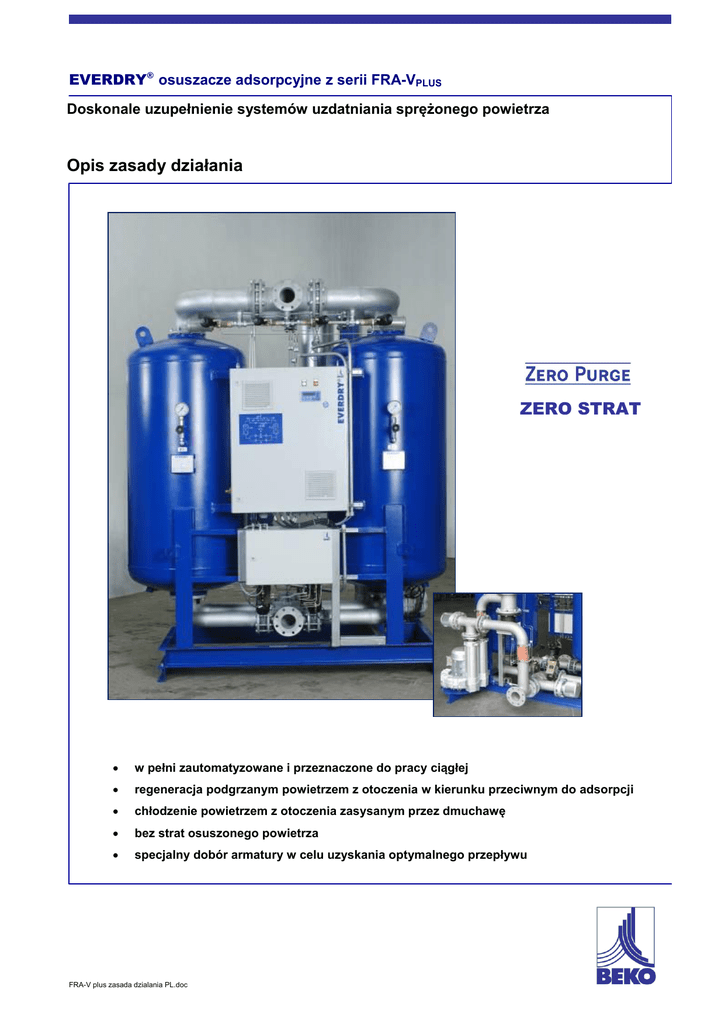 Zasada działania EVERDRY® osuszacze adsorpcyjne z serii FRA-VPLUS Doskonale uzupełnienie systemów uzdatniania sprężonego powietrza Opis zasady działania ZERO STRAT w pełni zautomatyzowane i przeznaczone do pracy ciągłej regeneracja podgrzanym powietrzem z otoczenia w kierunku przeciwnym do adsorpcji chłodzenie powietrzem z otoczenia zasysanym przez dmuchawę bez strat osuszonego powietrza specjalny dobór armatury w celu uzyskania optymalnego przepływu FRA-V plus zasada dzialania PL.doc strona 1 z 4 Zasada działania EVERDRY® osuszacze adsorpcyjne z serii FRA-VPLUS Faza adsorpcji Wilgotne sprężone powietrza wpływa przez zawór K1 do zbiornika adsorpcyjnego B1 osuszacza. Poprzez dystrybutor umieszczony wewnątrz zbiornika wilgotne powietrze zostaje równomiernie rozprowadzone w zbiorniku. Adsorbent znajdujący się w zbiorniku pochłania zgromadzoną w powietrzu wilgoć. Osuszone sprężone powietrze opuszcza osuszacz przez zawór R1 i złącze wylotowe i płynie dalej do punktów odbioru. Sterowanie procesu adsorpcji może przebiegać wg na stałe ustalonego czasu lub zależnie od stopnia nasycenia adsorbentu wilgocią (tzw. sterowanie punktem rosy – opcja). Proces adsorpcji przebiega z dołu do góry. Faza desorpcji - przy pomocy dmuchawy tłoczącej powietrze z otoczenia W czasie, gdy w zbiorniku B1 następuje adsorpcja wilgoci, w zbiorniku B2, który w poprzedniej fazie został nawilgocony, przeprowadzana jest regeneracja adsorbentu. Przed rozpoczęciem regeneracji zbiornik B2 zostaje łagodnie rozprężony do ciśnienia atmosferycznego. W osuszaczach serii FRA-V desorpcja przeprowadzana jest przy użyciu powietrza zasysanego przez dmuchawę z otoczenia, a następnie transportowanego do zainstalowanej za dmuchawą grzałki, gdzie podgrzewane jest do wymaganej temperatury desorpcji. Gorące powietrze regeneracyjne dostaje się następnie przez zawór K6 do zbiornika B2, w którym energia zawarta w gorącym powietrzu doprowadza do odparowania zgromadzonej w zbiorniku wilgoci. Płynący przez zbiornik strumień powietrza regeneracyjnego transportuje odparowaną wilgoć przez zawór K4 i K7 do atmosfery. Proces desorpcji przebiega w kierunku przeciwnym do kierunku adsorpcji, co jest optymalnym energetycznym rozwiązaniem (wyprowadzenie wilgoci do atmosfery najkrótszą drogą). wylot osuszonego powietrza system grzewczy B1 ADSOPRCJA dmuchawa B2 DESOPRCJA wlot wilgotnego powietrza Desorpcja przebiega w kierunku przeciwnym do kierunku adsorpcji, tzn. z góry do dołu Podczas procesu desorpcji powietrze regeneracyjne ochładza się. W końcowym efekcie temperatura powietrza regeneracyjnego na wylocie ze zbiornika wynosi tylko ok. 40°C – 60°C. W czasie trwania procesu desorpcji zmniejsza się zawilgocenie adsorbentu, co jednocześnie ma wpływ na stopniowy wzrost temperatura powietrza regeneracyjnego na wylocie. Ten efekt wykorzystuje się do określenia czasu zakończenia desorpcji - proces desorpcji zostaje automatycznie zakończony w chwili osiągnięcia określonej temperatury powietrza regeneracyjnego na wylocie ze zbiornika. FRA-V plus zasada dzialania PL.doc strona 2 z 4 Zasada działania EVERDRY® osuszacze adsorpcyjne z serii FRA-VPLUS Faza chłodzenia – przy pomocy dmuchawy zasysającej powietrze z otoczenia Żeby nie doprowadzić po przełączeniu zbiorników skoków temperatur i zachwiań punktu rosy, należy przed przełączeniem zbiorników obniżyć temperaturę w zbiorniku regeneracyjnym odprowadzając nagromadzone w nim ciepło do otoczenia. Proces ten przeprowadzany jest strumieniem nieogrzanego powietrza zasysanego przez dmuchawę z otoczenia i kierowane jest przez zawory R5 i K4 do zbiornika B2. Proces chłodzenia przebiega podobnie jak proces adsorpcji, z dołu do góry. Dzięki takiemu kierunkowi przepływu środek adsorpcyjny jest chroniony obszarach decydujących o stopniu osuszenia sprężonego powietrza (środkowa i górna część zbiornika) przed ponownym zawilgoceniem wilgocią zasysaną razem z powietrzem z otoczenia. Po zakończeniu fazy chłodzenia zostają zamknięte zawory regeneracyjne, a następnie otwarty zostaje zawór V4 i rozpoczyna się faza wyrównania ciśnień (ok. 10 minut). Po wyrównaniu ciśnień w obydwu zbiornikach osuszacz jest w fazie oczekiwania (Standby). B1 B2 ADSOPRCJA DESOPRCJA Faza oczekiwania – standby (tylko dla osuszaczy ze sterowaniem punktem rosy) Jeśli osuszacz wyposażony jest w system sterowania punktem rosy (opcja) czas trwania fazy oczekiwania jest uzależniony od stopnia nawilgocenia środka adsorpcyjnego (w tym przypadku zbiornik B1), a proces przełączania zbiorników rozpocznie się dopiero w momencie zarejestrowania wzrostu punktu rosy. W przypadku, gdy osuszacz pracuje w stałym cyklu czasowym proces przełączania zbiorników rozpocznie się po zakończeniu nastawionego czasu adsorpcji niezależnie od stopnia nawilgocenia adsorbentu. Faza pracy równoległej Zanim nastąpi przełączenie zbiorników (z B1 na B2) obydwa zbiorniki pracują – poprzez otwarcie zaworu K2 - przez ok. 5 -15 minut w fazie pracy równoległej (dokładny czas jest ustawiany indywidualnie). W czasie tej fazy wilgotne sprężone powietrze płynie przez obydwa zbiorniki. Faza przełączania zbiorników FRA-V plus zasada dzialania PL.doc strona 3 z 4 Zasada działania EVERDRY® osuszacze adsorpcyjne z serii FRA-VPLUS Po zakończeniu fazy pracy równoległej rozpoczyna się faza przełączania zbiorników (w tym przykładzie z B1 na B2), która przebiega automatycznie w następującej kolejności: - zamknięcie zaworu wlotowego K1 po stronie zbiornika B1 zamknięcie zaworu wyrównania ciśnień V4 otwarcie zaworu rozprężnego V1 po stronie zbiornika B1 otwarcie zaworu regeneracyjnego K3 i K7 włączenie dmuchawy i grzałki. Po zakończeniu tego procesu uprzednio zawilgocony zbiornik B1 znajduje sie w fazie regeneracji, a w przygotowanym do adsorpcji zbiorniku B2 następuje osuszanie sprężonego powietrza. zmienny czas 