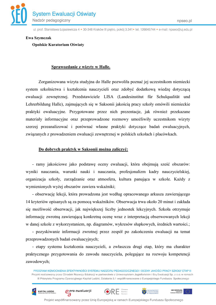 Ewa Szymczak Opolskie Kuratorium Oświaty Sprawozdanie z wizyty w Halle. Zorganizowana wizyta studyjna do Halle pozwoliła poznać jej uczestnikom niemiecki system szkolnictwa i kształcenia nauczycieli oraz zdobyć dodatkową wiedzę dotyczącą ewaluacji zewnętrznej. Przedstawiciele LISA (Landesinstitut fűr Schulqualität und Lehrerbildung Halle), zajmujących się w Saksonii jakością pracy szkoły omówili niemieckie praktyki ewaluacyjne. Przygotowane przez nich prezentacje, jak również przekazane materiały informacyjne oraz przeprowadzone rozmowy umożliwiły uczestnikom wizyty szerzej przeanalizować i porównać własne praktyki dotyczące badań ewaluacyjnych, związanych z prowadzeniem ewaluacji zewnętrznej w polskich szkołach i placówkach. Do dobrych praktyk w Saksonii można zaliczyć: - ramy jakościowe jako podstawę oceny ewaluacji, która obejmują sześć obszarów: wyniki nauczania, warunki nauki i nauczania, profesjonalizm kadry nauczycielskiej, organizacja szkoły, zarządzanie oraz atmosfera, kultura panująca w szkole. Każdy z wymienionych wyżej obszarów zawiera wskaźniki; - obserwację lekcji, która prowadzona jest według opracowanego arkusza zawierającego 14 kryteriów opisanych są za pomocą wskaźników. Obserwacja trwa około 20 minut i zakłada się możliwość obserwacji, jak największej liczby jednostek lekcyjnych. Szkoła otrzymuje informację zwrotną zawierającą konkretną ocenę wraz z interpretacją obserwowanych lekcji w danej szkole z wykorzystaniem, np. diagramów, wykresów słupkowych, średnich wartości.; - pozyskiwanie informacji zwrotnej przez zespół po zakończeniu ewaluacji na temat przeprowadzonych badań ewaluacyjnych; - etapy systemu kształcenia nauczycieli, a zwłaszcza drugi etap, który ma charakter praktycznego przygotowania do zawodu nauczyciela, polegające na rozwoju kompetencji zawodowych; -traktowanie ewaluacji zewnętrznej jako inspiratora do samodzielnego definiowania prze szkołę problemów, poszukiwania najlepszych rozwiązań z uwzględnieniem sugestii rodziców i uczniów. - wspieranie działalności szkoły we wszystkich jej obszarach poprzez działania ewaluacyjne. Bardzo wysoko oceniam atmosferę wizyty, zorganizowany program, poruszane tematy. Uczestnictwo w wizycie studyjnej pozwoliło mi poszerzyć wiedzę na temat interesujących mnie zagadnień, poznać nowych kolegów i koleżanki, wymienić doświadczenia. Zalety wizyty studyjnej w Halle: - ciekawy zakres zagadnień merytorycznych prezentowanych podczas pobytu w różnych instytucjach; - zapoznanie się w krótkim czasie z szerokim spektrum zagadnień dotyczących jakości pracy szkoły; - ciekawy program wizyty, bardzo dobre przygotowanie organizacyjne.